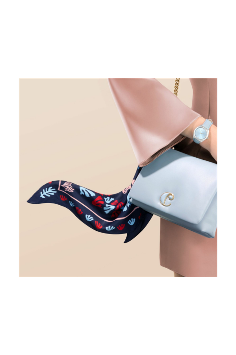 The “Vivienne” scarf in navy features an abstract design inspired by nature, with organic shapes and a color palette that is both soft and bold. A modern take on Cacharel’s brand DNA, it blends timeless elegance with contemporary artistry. Adorned with the emblematic “C” logo, this 65 x 65 cm scarf adds a distinctive touch to any outfit. Made from vegan silk (Polyester twill).