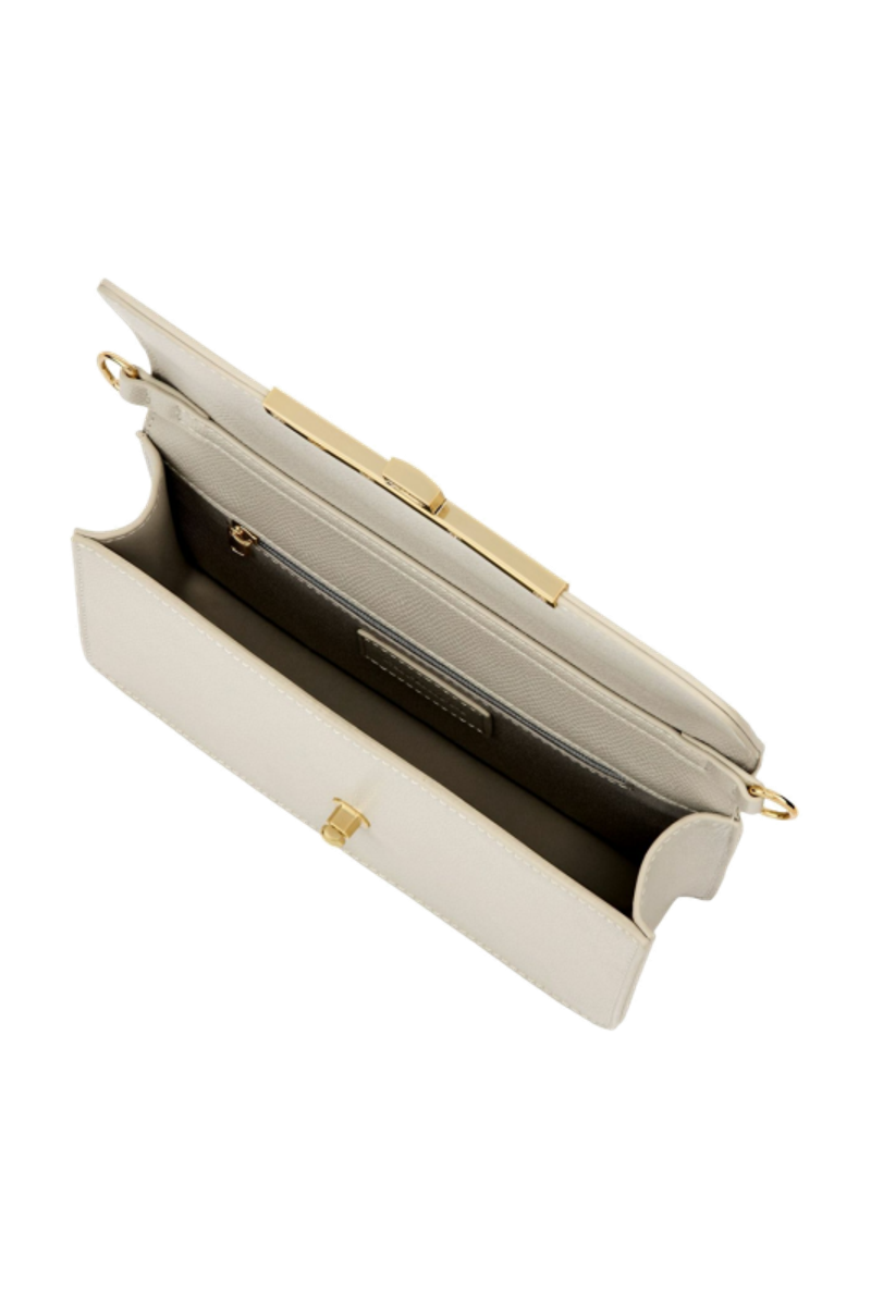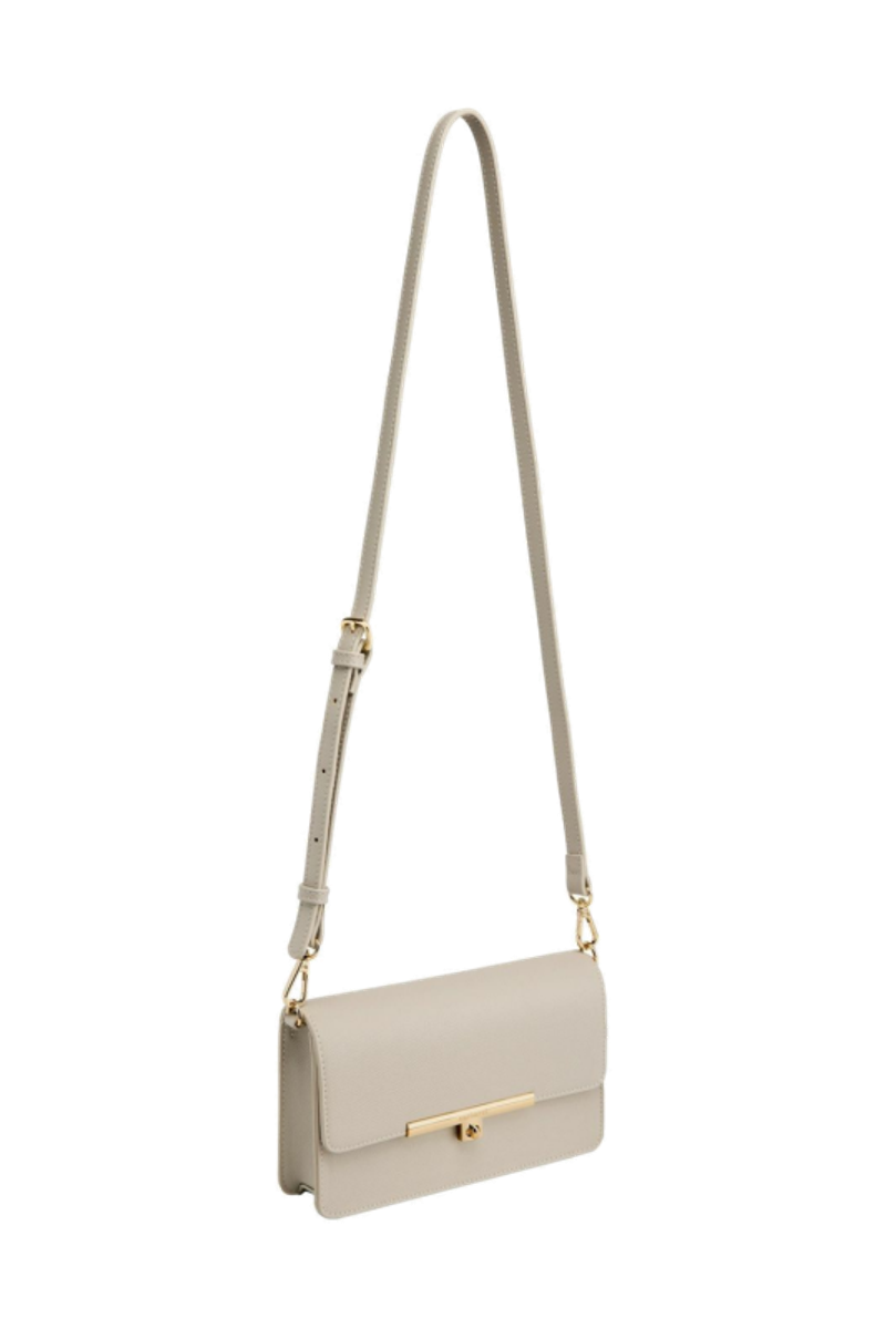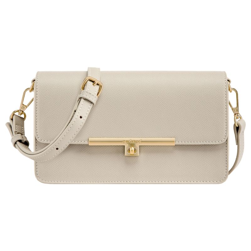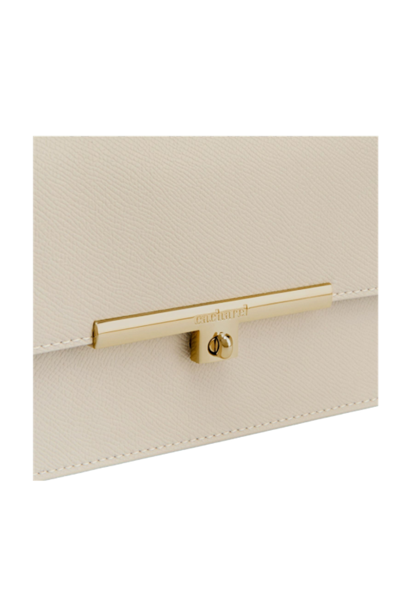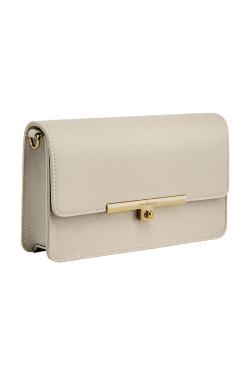 The Seraphine crossbody bag embodies refined elegance through its minimal, contemporary design. Crafted from saffiano-textured vegan leather, it is signed with an exclusive gold turn-lock closure engraved with the Cacharel logo, conveying a sense of luxurious simplicity. All gold trims bring a feminine and refined accent, while the discreet gold TPU logo on the back adds a subtle signature touch. Delivered with an adjustable and removable strap, the bag can be worn as a clutch, shoulder, or crossbody style. Its interior features a zipped compartment, offering both practicality and sophistication. Available in taupe, light grey, and black.