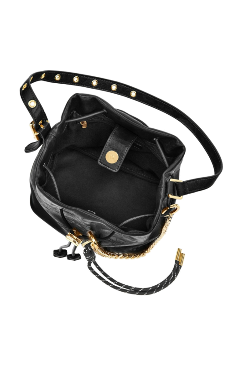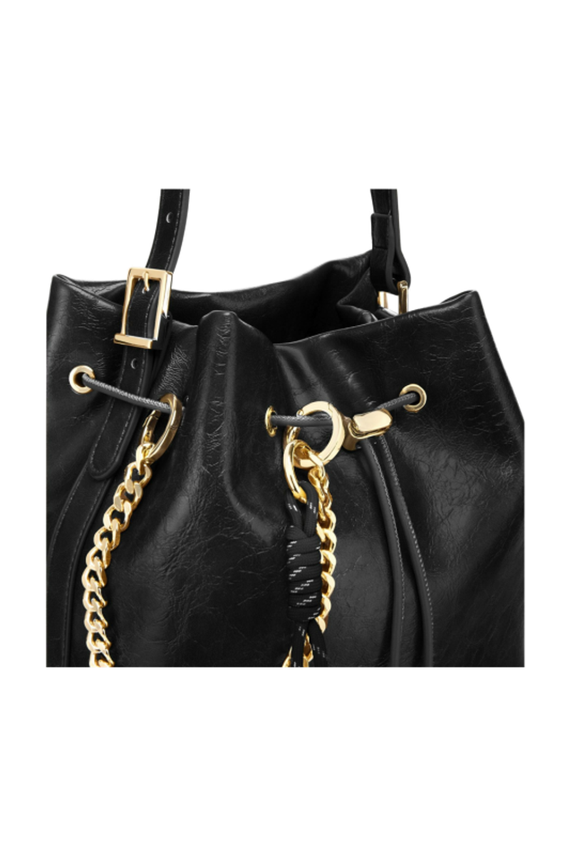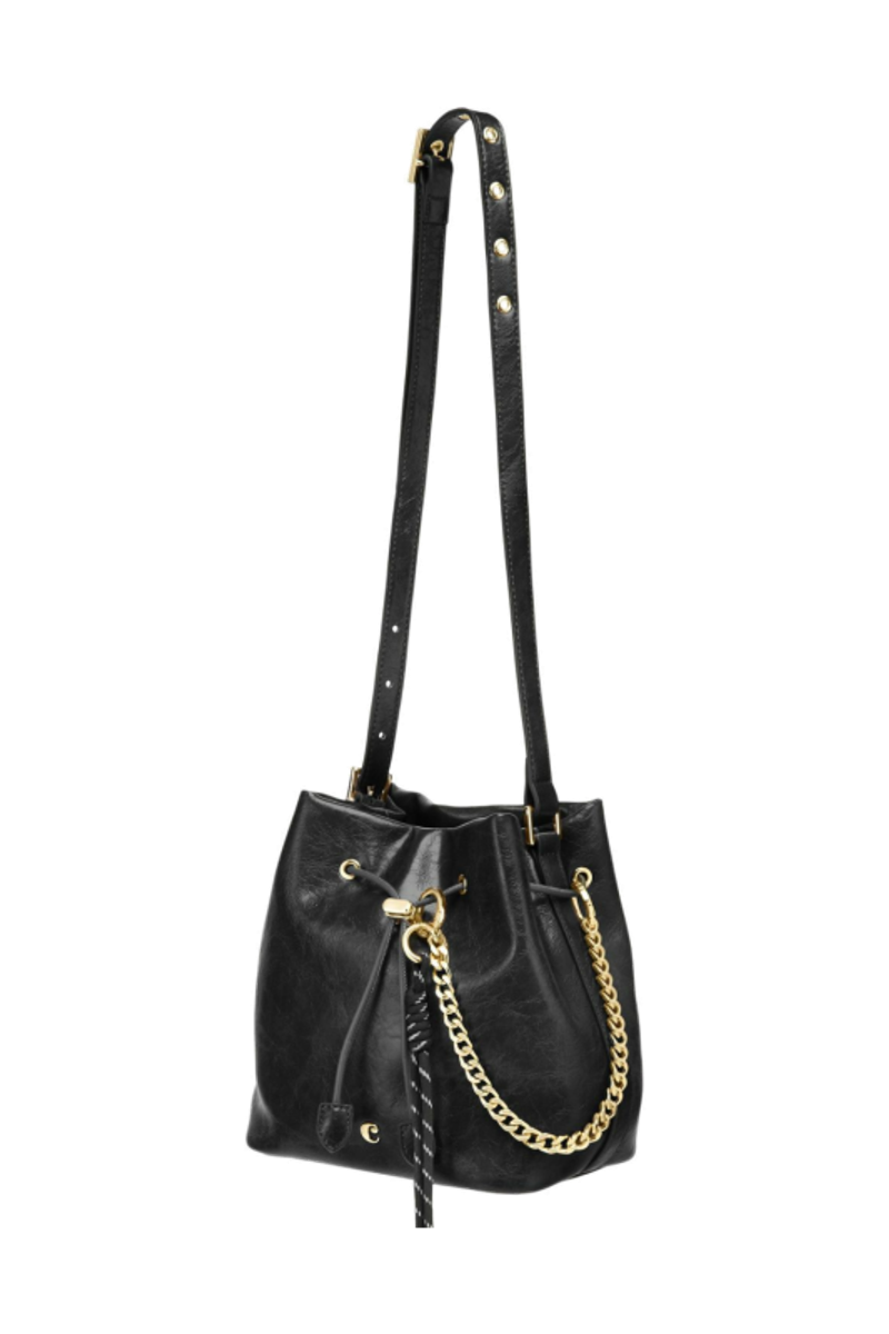 The Philomene bucket bag blends timeless elegance with a bold, fashion-forward attitude. Crafted from a glazed, crinkled leather-like texture, it is signed with the signature Cacharel C plate, enhanced by refined gold trims, and finished with a discreet embossed Cacharel logo. The material is soft, supple, and remarkably luxurious to the touch. Its adjustable strap allows for both hand and shoulder carrying, while an additional strap transforms it into a crossbody bag. A PU cord closure reinforces its pouch-like shape, and a removable decorative cord-and-chain charm adds a distinctive, stylish accent. Compact yet spacious, its interior offers ample room for essentials and includes a zipped pocket for added convenience. Available in black, burgundy, and camel.