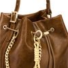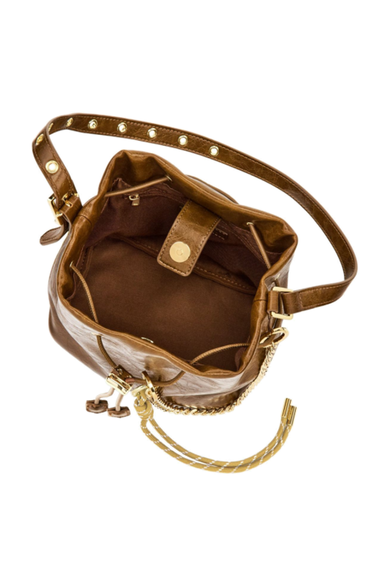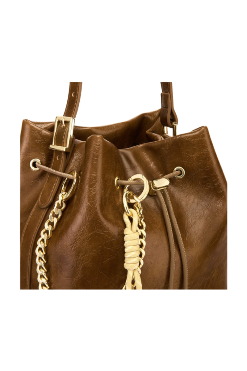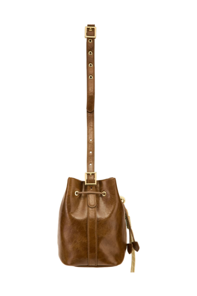 The Philomene bucket bag blends timeless elegance with a bold, fashion-forward attitude. Crafted from a glazed, crinkled leather-like texture, it is signed with the signature Cacharel C plate, enhanced by refined gold trims, and finished with a discreet embossed Cacharel logo. The material is soft, supple, and remarkably luxurious to the touch. Its adjustable strap allows for both hand and shoulder carrying, while an additional strap transforms it into a crossbody bag. A PU cord closure reinforces its pouch-like shape, and a removable decorative cord-and-chain charm adds a distinctive, stylish accent. Compact yet spacious, its interior offers ample room for essentials and includes a zipped pocket for added convenience. Available in black, burgundy, and camel.