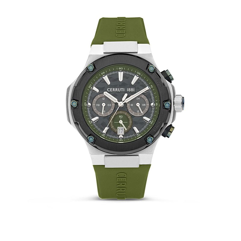 Introducing the Chronograph Sport Lucardo Olive by Cerruti 1881, the ultimate timepiece for the modern man. Crafted with a durable stainless steel case and a striking olive dial, this watch exudes style and sophistication. Featuring a precise quartz chronograph mechanism and water resistance up to 10 ATM, it's perfect for both everyday wear and active lifestyles. The complementary olive stainless steel band enhances its rugged aesthetic, making it a standout accessory for any occasion. Elevate your wrist game with the Chronograph Sport Lucardo—where functionality meets elegance.