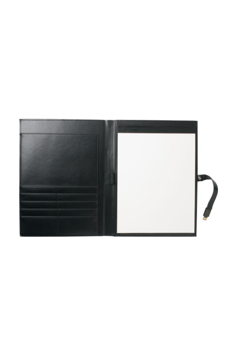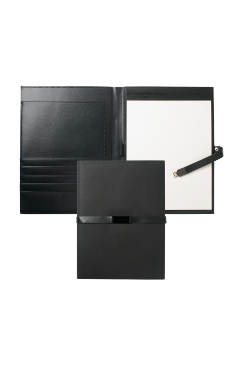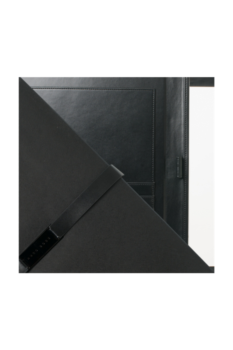 A true expression of stylish functionality, the Saffiano finished Binder folder is featuring a dark chrome plated USB closing and is designed for a modern and active man.