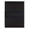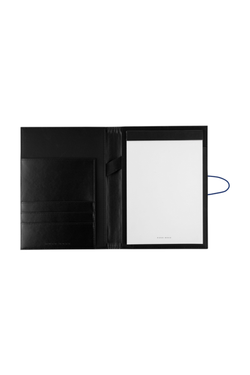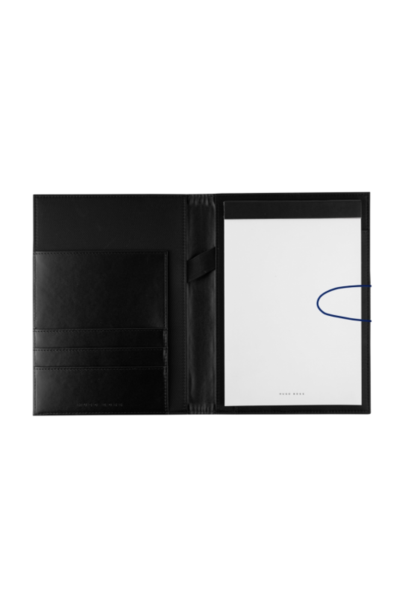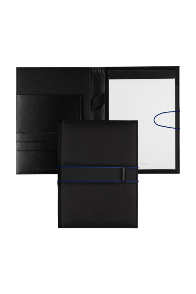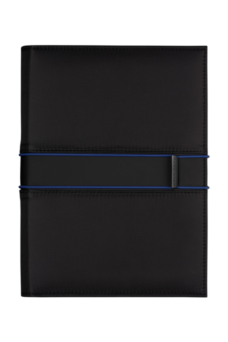 Where sports meets modern life: every element of th is A5 folder feels cutting-edge and innovative, from the textured nylon material to the matte black metal accents. The sleek closing system features elastic which, as a design element, brings a fresh touch of color to these understated and functional folders. The A5 folder is available in black and white elastic, black and black elastic and black and blue elastic.