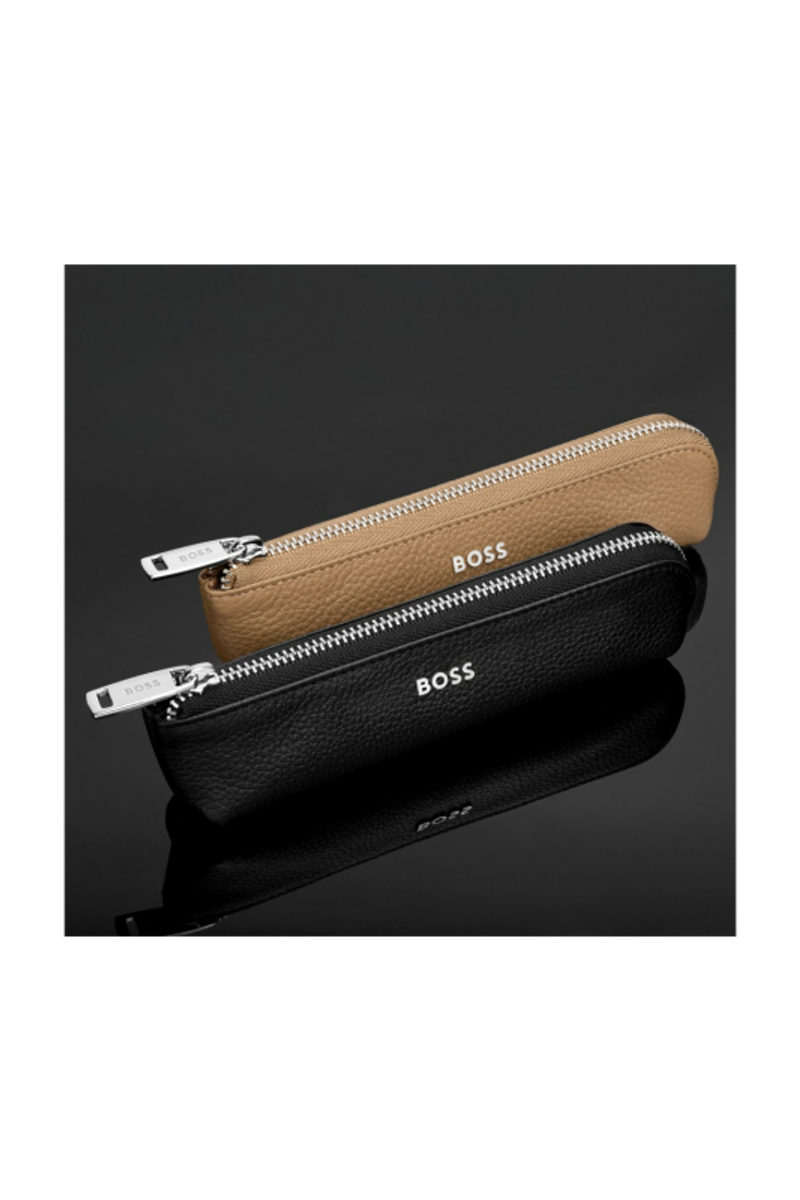 Hugo Boss zipped pen pouch—a perfect fusion of elegance and functionality for the modern professional. Crafted from genuine leather, this exquisite pen case embodies the sophistication and quality synonymous with the Hugo Boss brand. It is signed with our crisp BOSS metal plate in chrome finish. It features a tone on tone monogrammed lining, the zipper is embossed with the BOSS logo. A perfecrt companion to any of our writing piece.