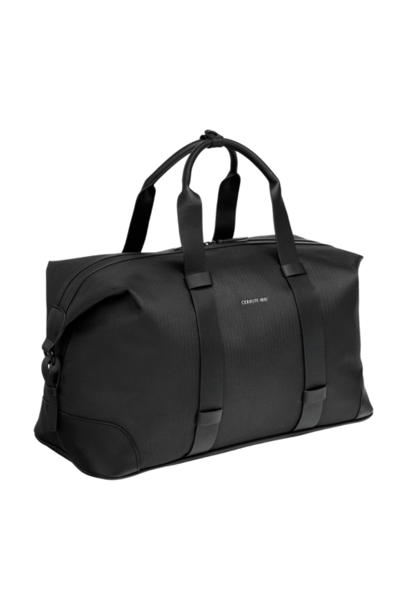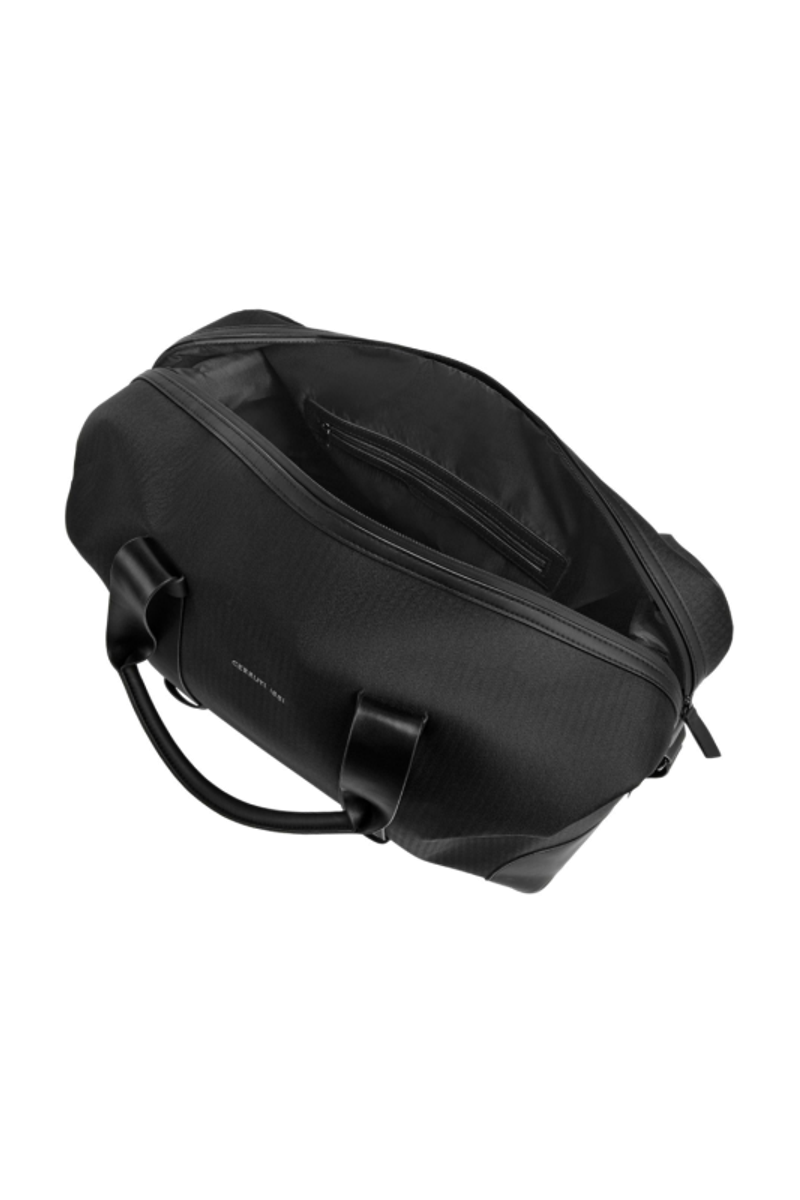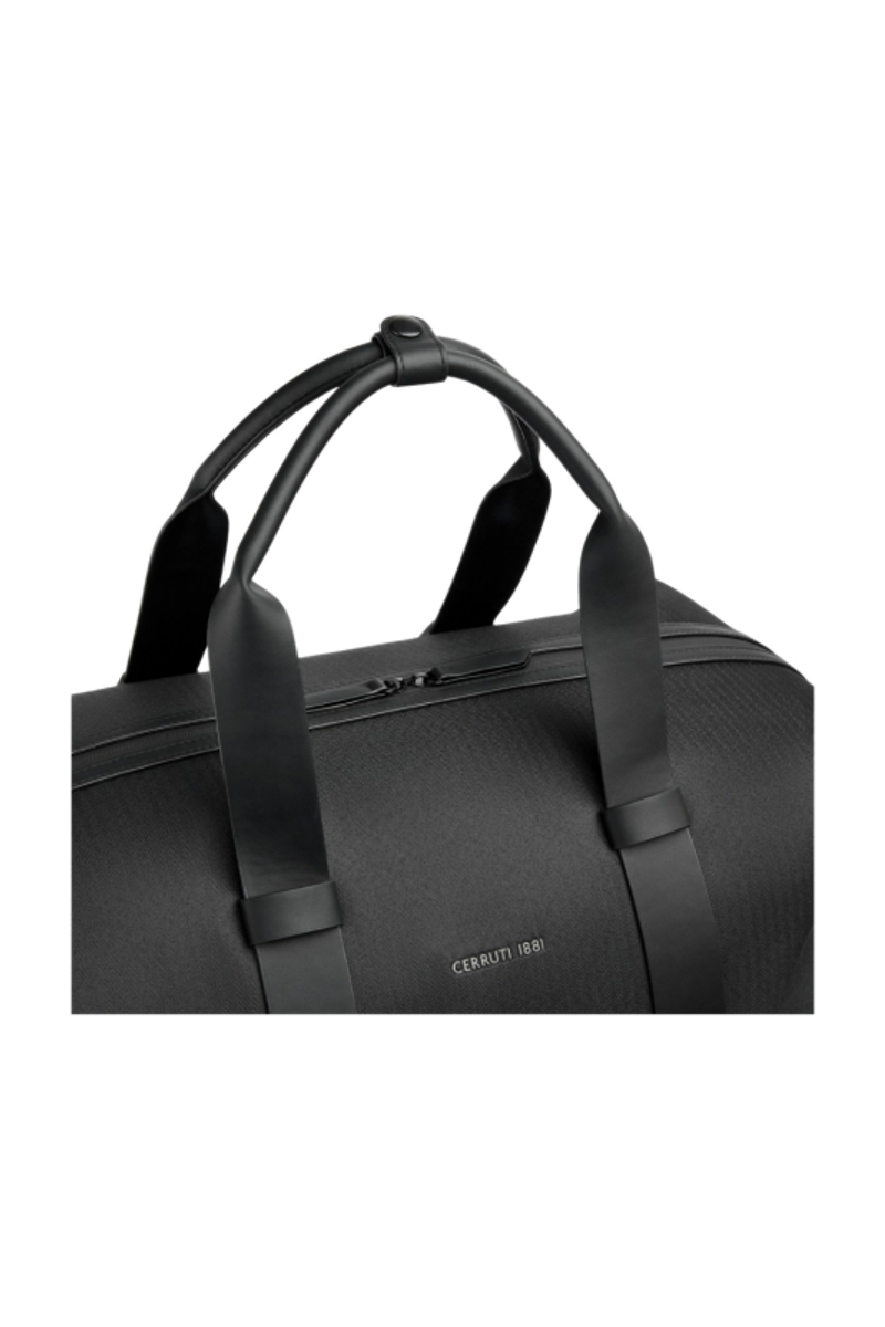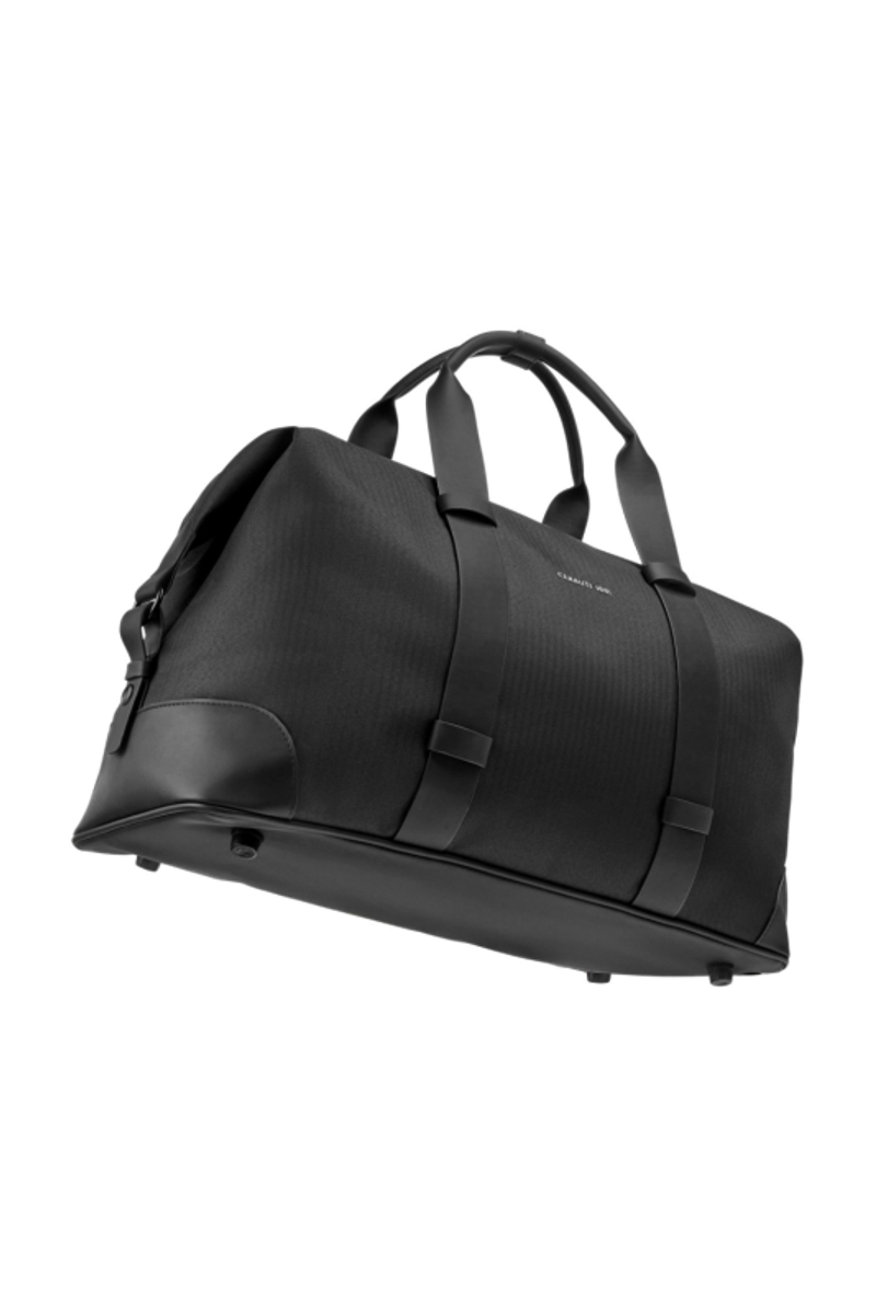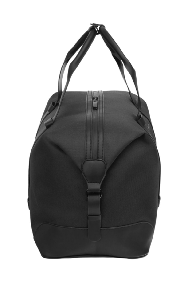 The Holborn weekend bag in black seamlessly blends classic design with a modern edge. Made from innovative fabric with a finished texture, it features a minimal TPU logo signature and is mixed with matte black PU for a stylish, masculine result. Inspired by suiting tradition but with a minimalist shape, this bag is both practical and elegant. Roomy, light, and stylish, it is the perfect choice for weekend trips and travel. Signed with a sleek gunmetal-colored logo, it brings a sophisticated touch to your travel collection.