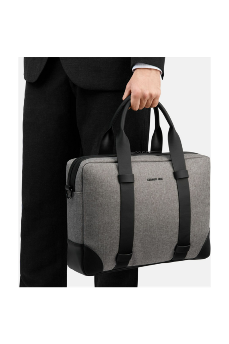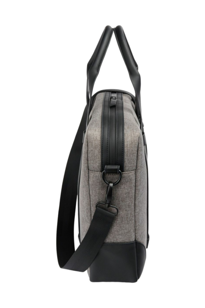 The Holborn document bag in light grey is part of our new, exhaustive travel line, offering timeless design with a resolutely contemporary feel. Crafted from innovative fabric with a finished texture, it features a minimal TPU logo signature and is mixed with matte black PU for a modern, masculine touch. Inspired by suiting tradition but reimagined with minimal shapes, this bag is both practical and stylish. It includes a dedicated laptop compartment and an inner zipped pocket for optimal organization. Signed with a sleek black logo, it perfectly complements both professional and travel needs.