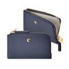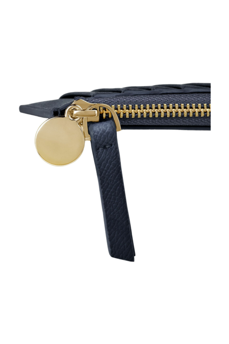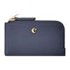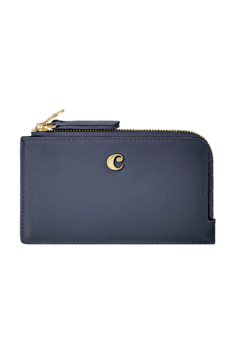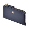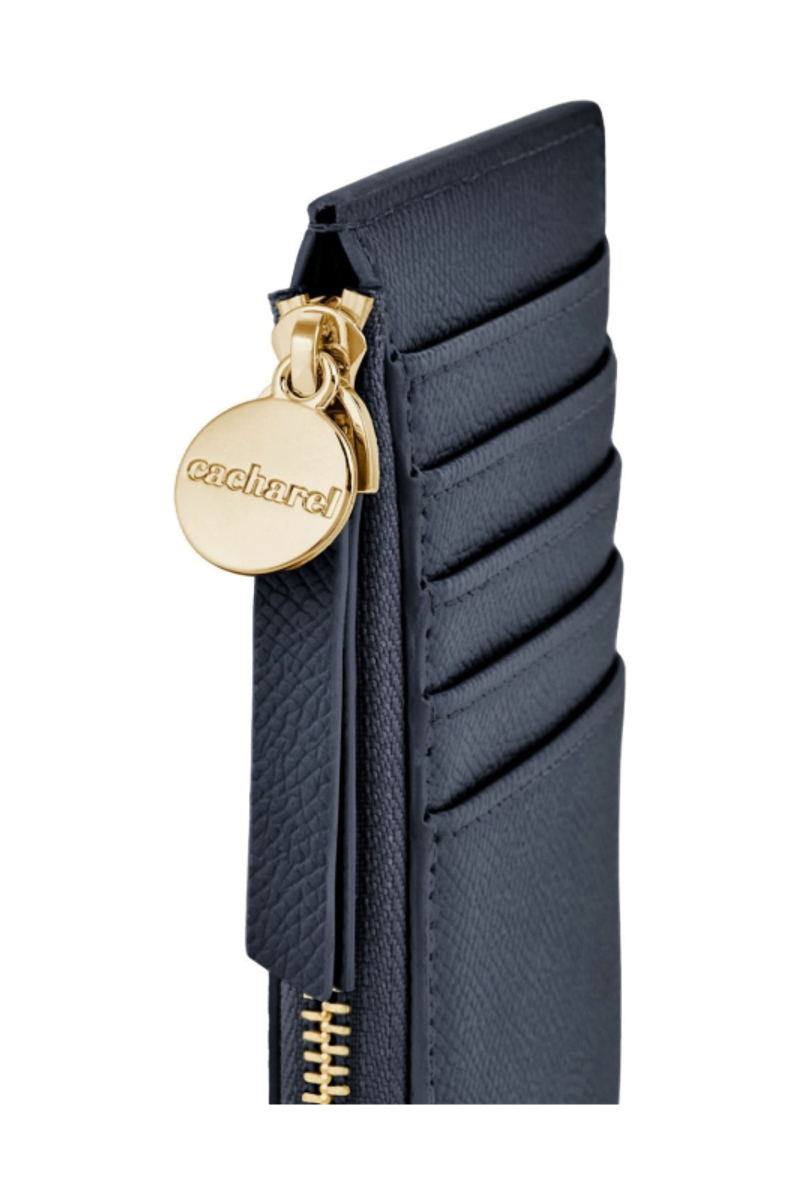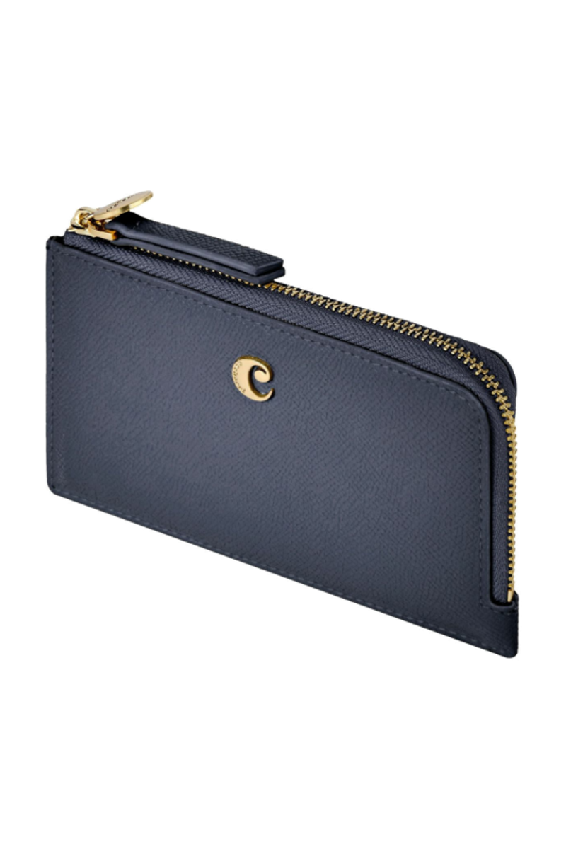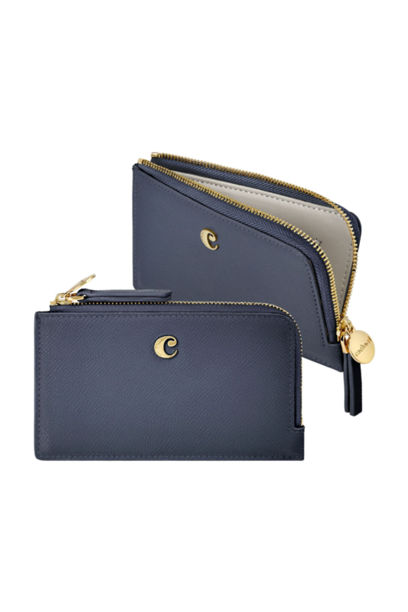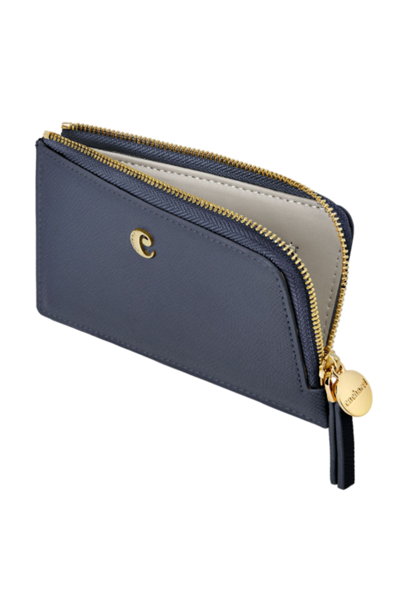 The Seraphine card holder combines practicality with a touch of playful elegance. This long zipped design is crafted from beautiful saffiano-textured vegan leather with a luxurious matte finish. It is signed with a gold-toned C plate on the front and completed by a refined metal plate on the zipper puller. Its spacious main compartment allows for easy organization, complemented by one inner card slot and five additional card slots on the back. A functional yet stylish everyday essential. This navy version features a contrastive light grey lining adding an extra layer of playfulness to this accessory.