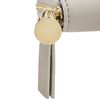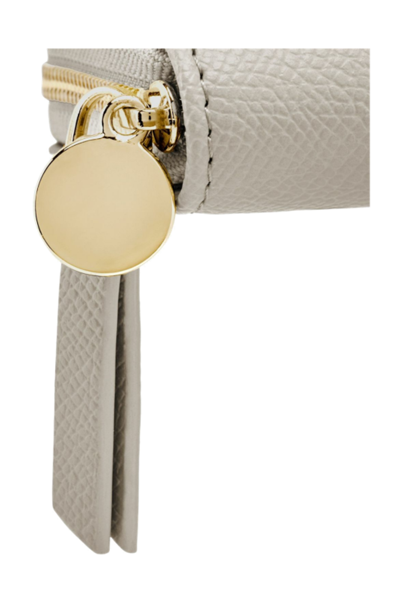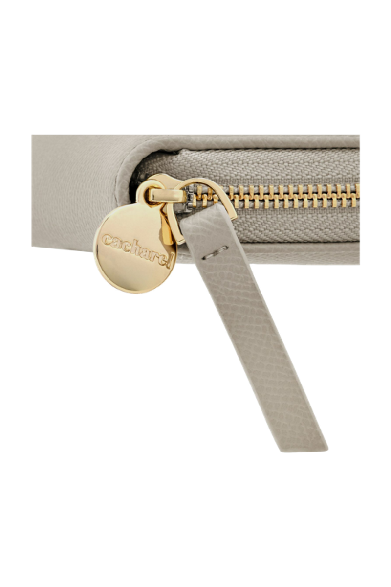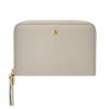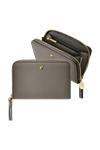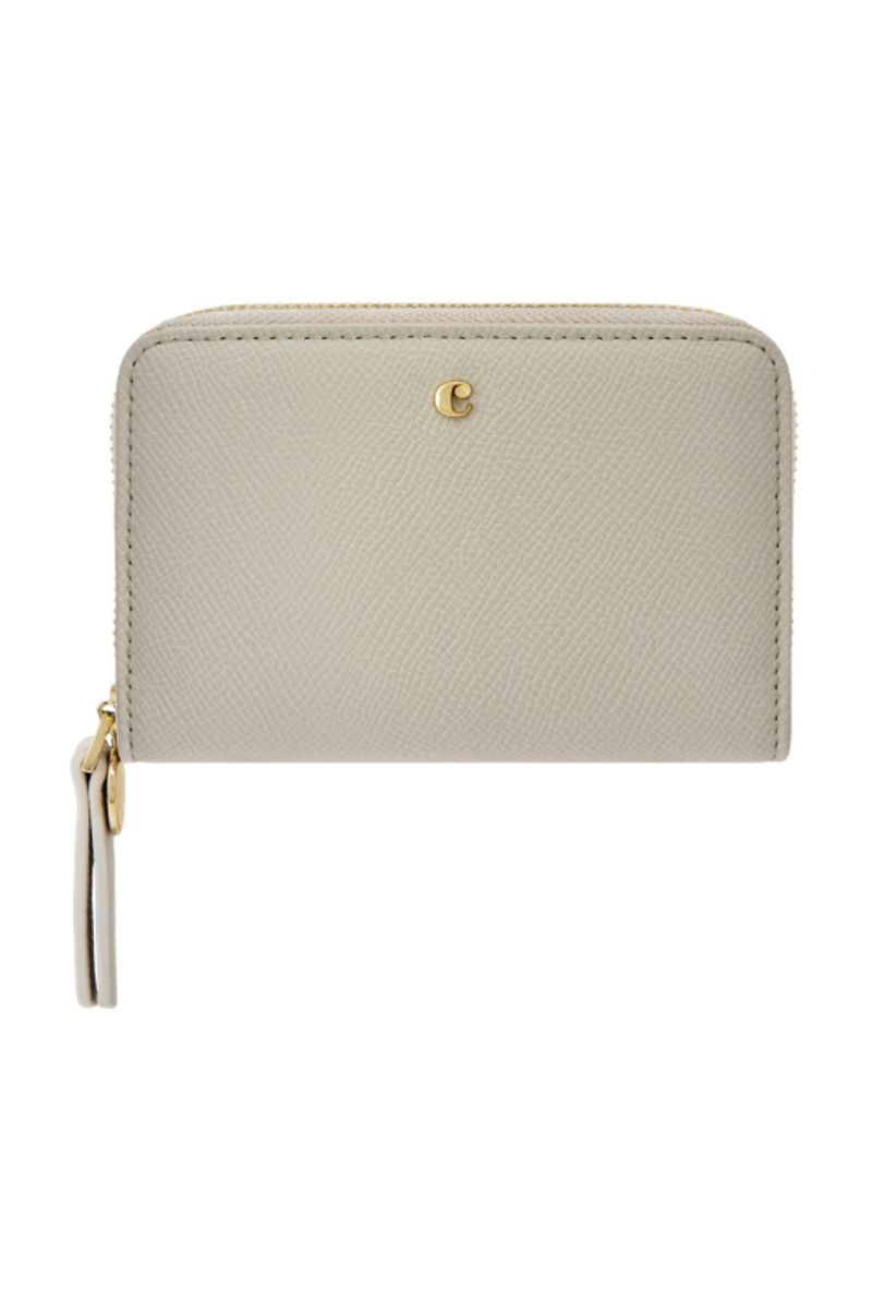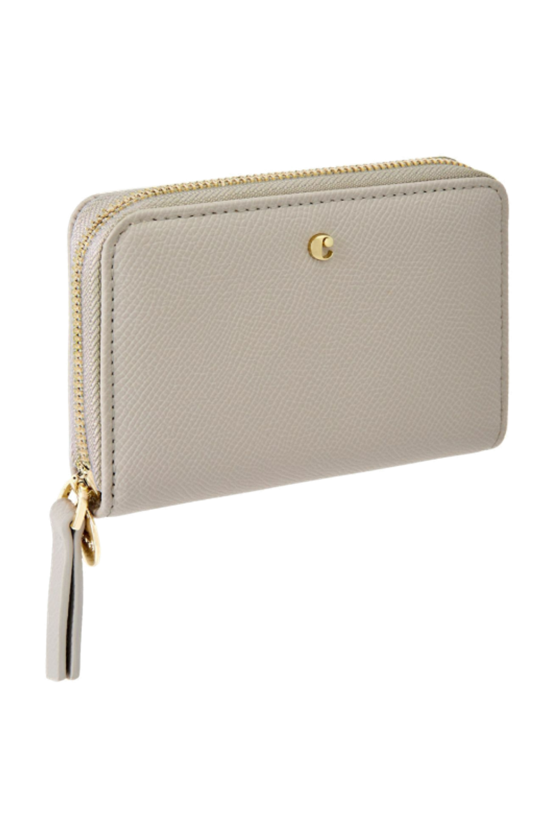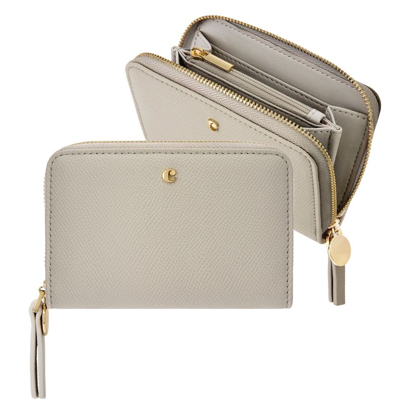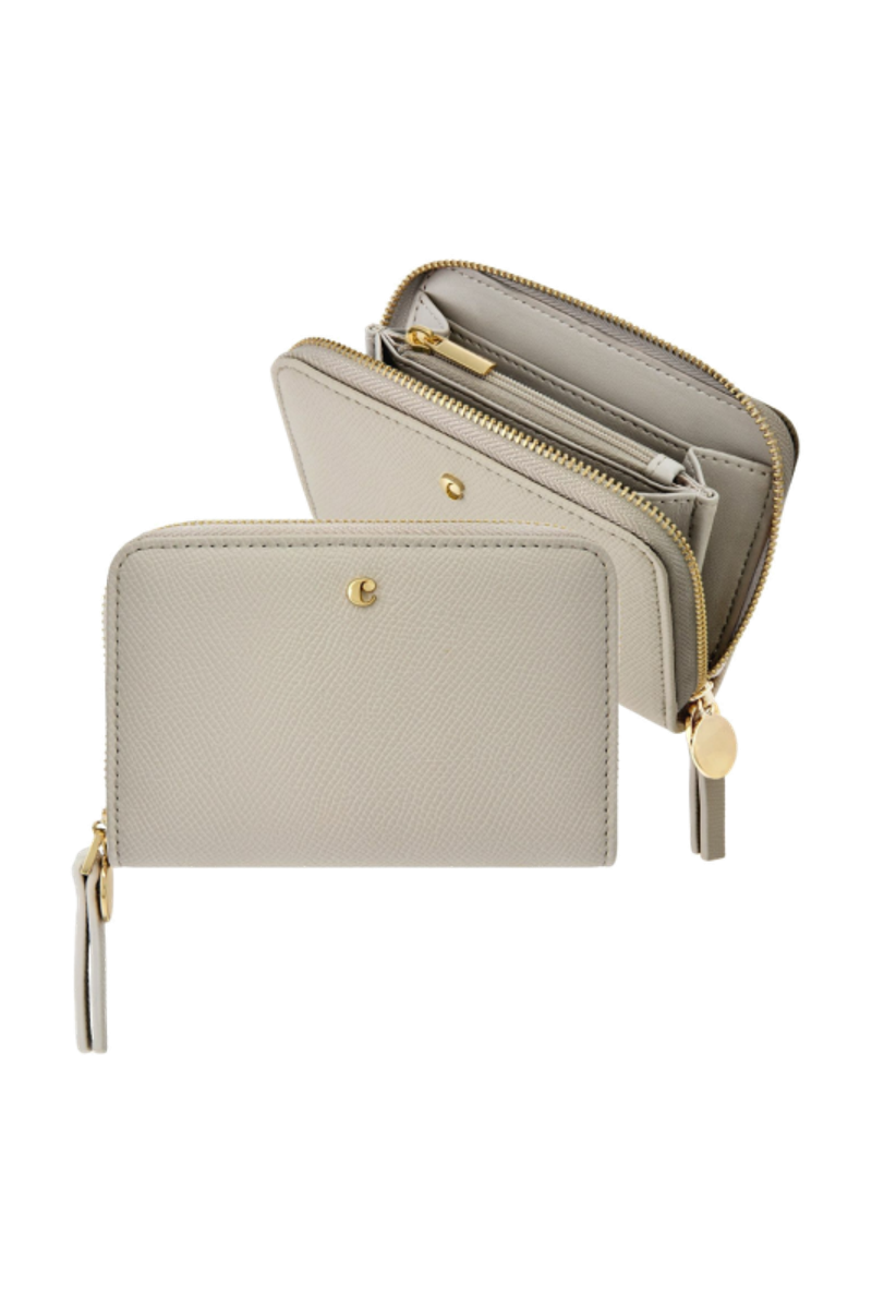 The Seraphine compact wallet blends practicality with refined style. Made from saffiano-textured vegan leather in a luxurious matte finish, it features a gold-toned C plate on the front and a matching metal plate on the zipper puller. Its compact format opens to a well-organized interior with four card slots and a zipped compartment, making it both functional and elegant for everyday use. Available in taupe, black, and light grey.