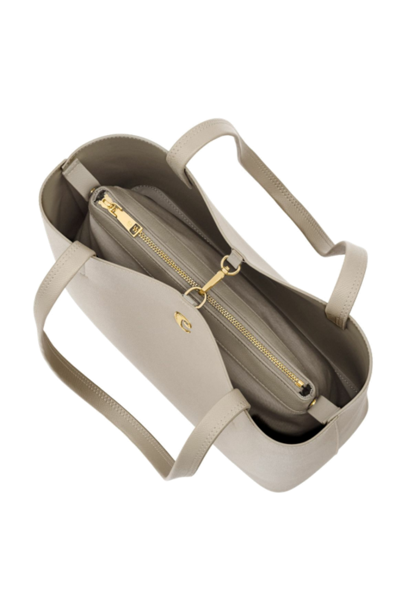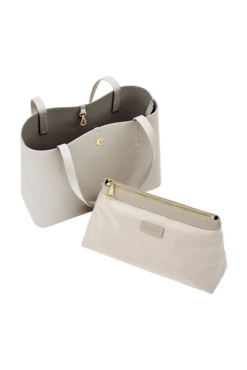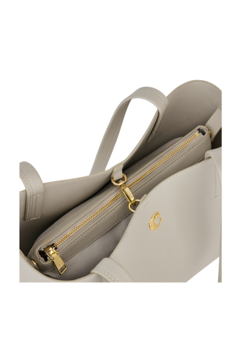 The Seraphine tote bag is a highly functional yet feminine piece, crafted from beautiful saffiano-textured vegan leather (PU) and offered in a playful palette of colors. It is signed with an oversized gold-toned C plate, adding a distinctive Cacharel touch. Designed as a 2-in-1 accessory, its spacious interior includes a large detachable pouch that can be used separately as a travel organizer. The tote closes with an elegant hook-and-ring system, bringing a subtle and unexpected twist to its design. Lightweight, easy to wear, and effortlessly versatile, it complements any outfit. Available in black, navy, taupe, yellow, and light grey.