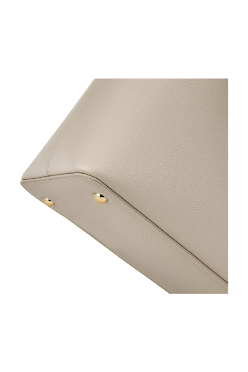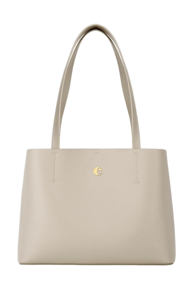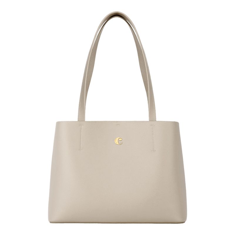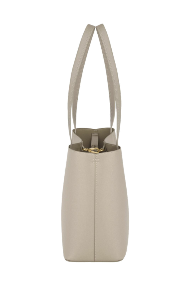 The Seraphine tote bag is a highly functional yet feminine piece, crafted from beautiful saffiano-textured vegan leather (PU) and offered in a playful palette of colors. It is signed with an oversized gold-toned C plate, adding a distinctive Cacharel touch. Designed as a 2-in-1 accessory, its spacious interior includes a large detachable pouch that can be used separately as a travel organizer. The tote closes with an elegant hook-and-ring system, bringing a subtle and unexpected twist to its design. Lightweight, easy to wear, and effortlessly versatile, it complements any outfit. Available in black, navy, taupe, yellow, and light grey.