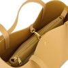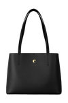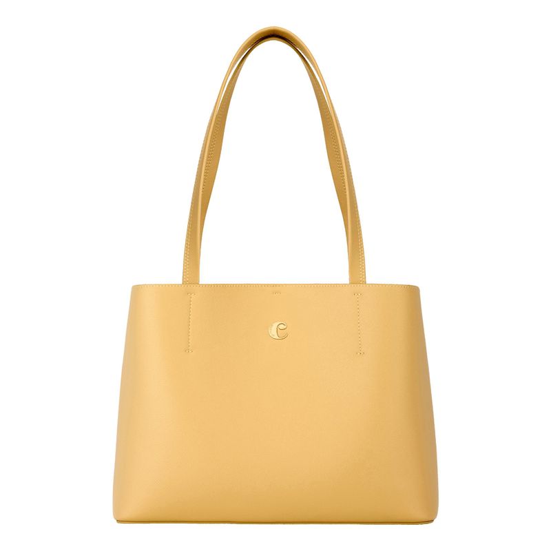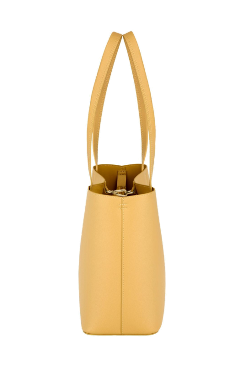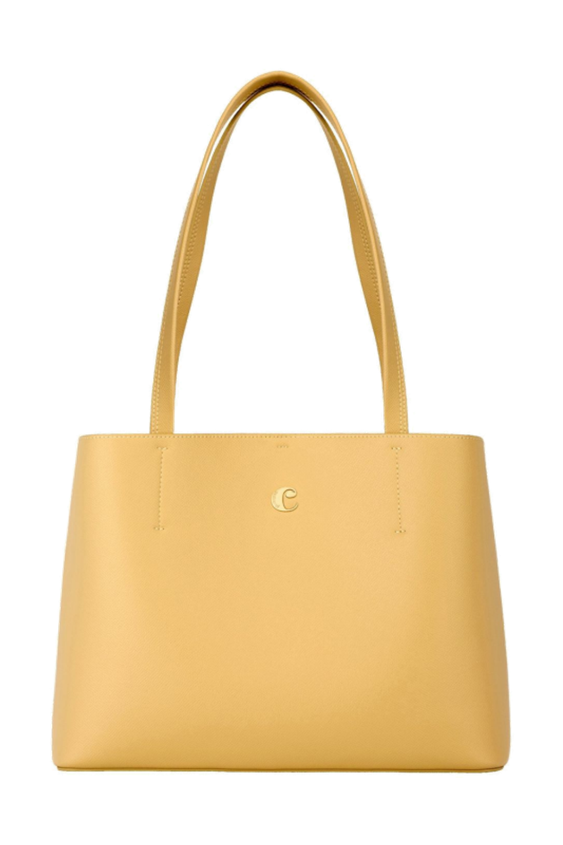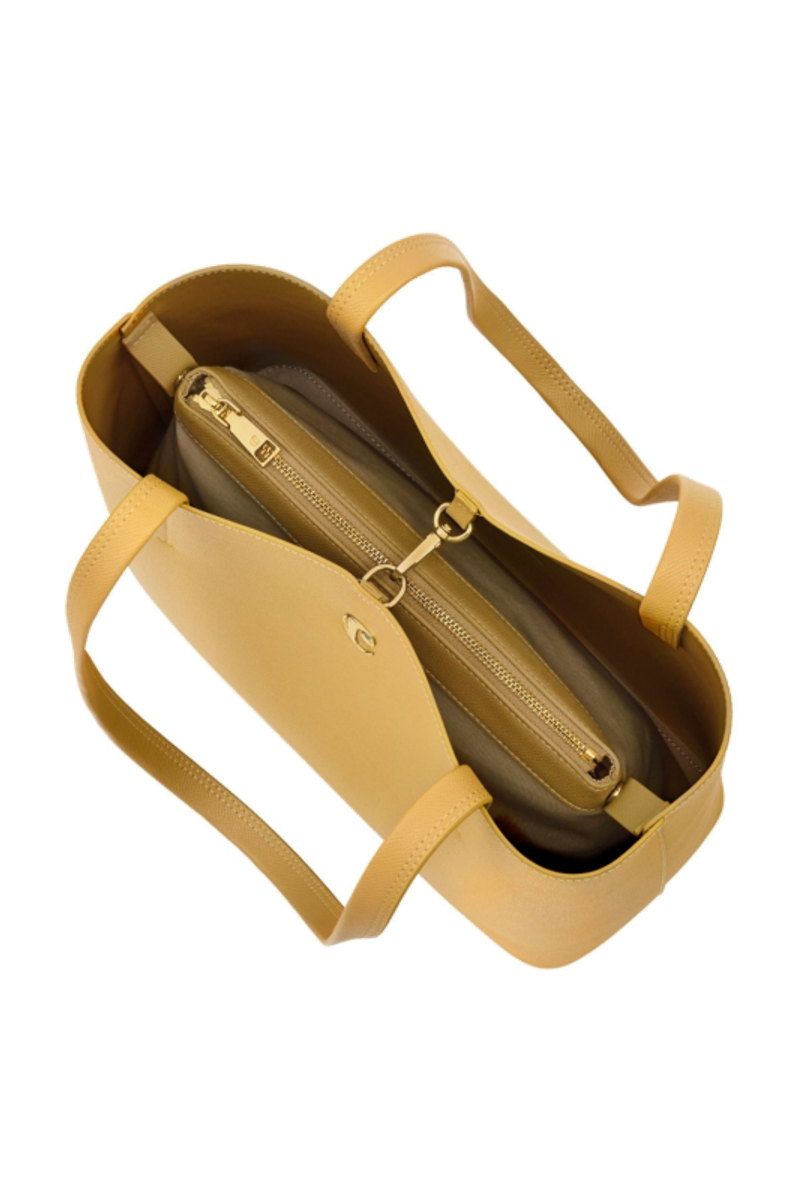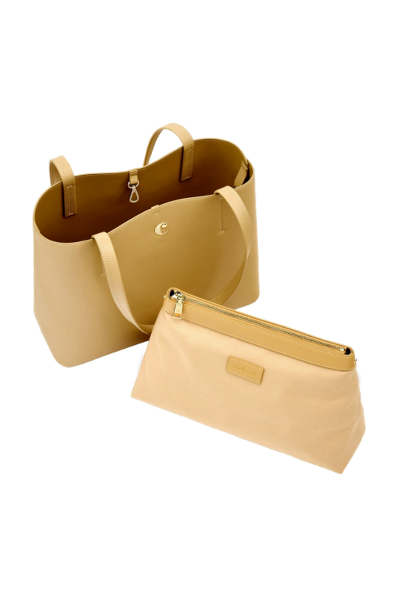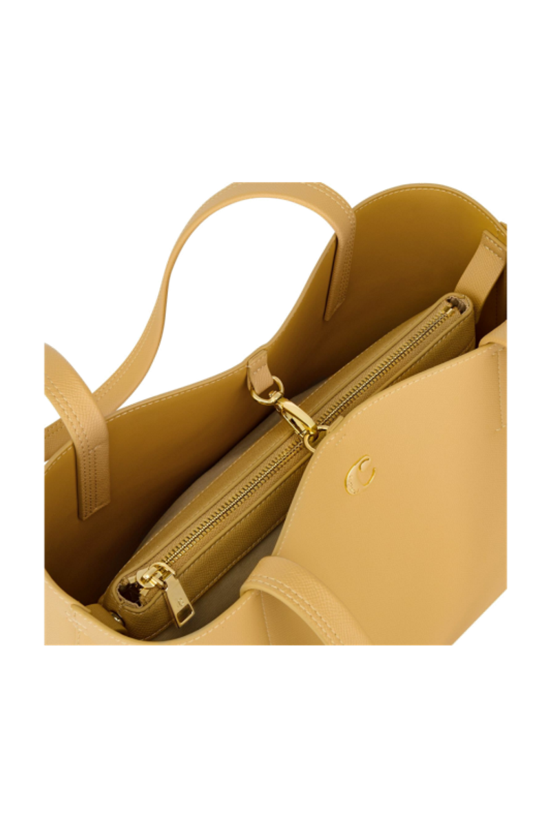 The Seraphine tote bag is a highly functional yet feminine piece, crafted from beautiful saffiano-textured vegan leather (PU) and offered in a playful palette of colors. It is signed with an oversized gold-toned C plate, adding a distinctive Cacharel touch. Designed as a 2-in-1 accessory, its spacious interior includes a large detachable pouch that can be used separately as a travel organizer. The tote closes with an elegant hook-and-ring system, bringing a subtle and unexpected twist to its design. Lightweight, easy to wear, and effortlessly versatile, it complements any outfit. Available in black, navy, taupe, yellow, and light grey.