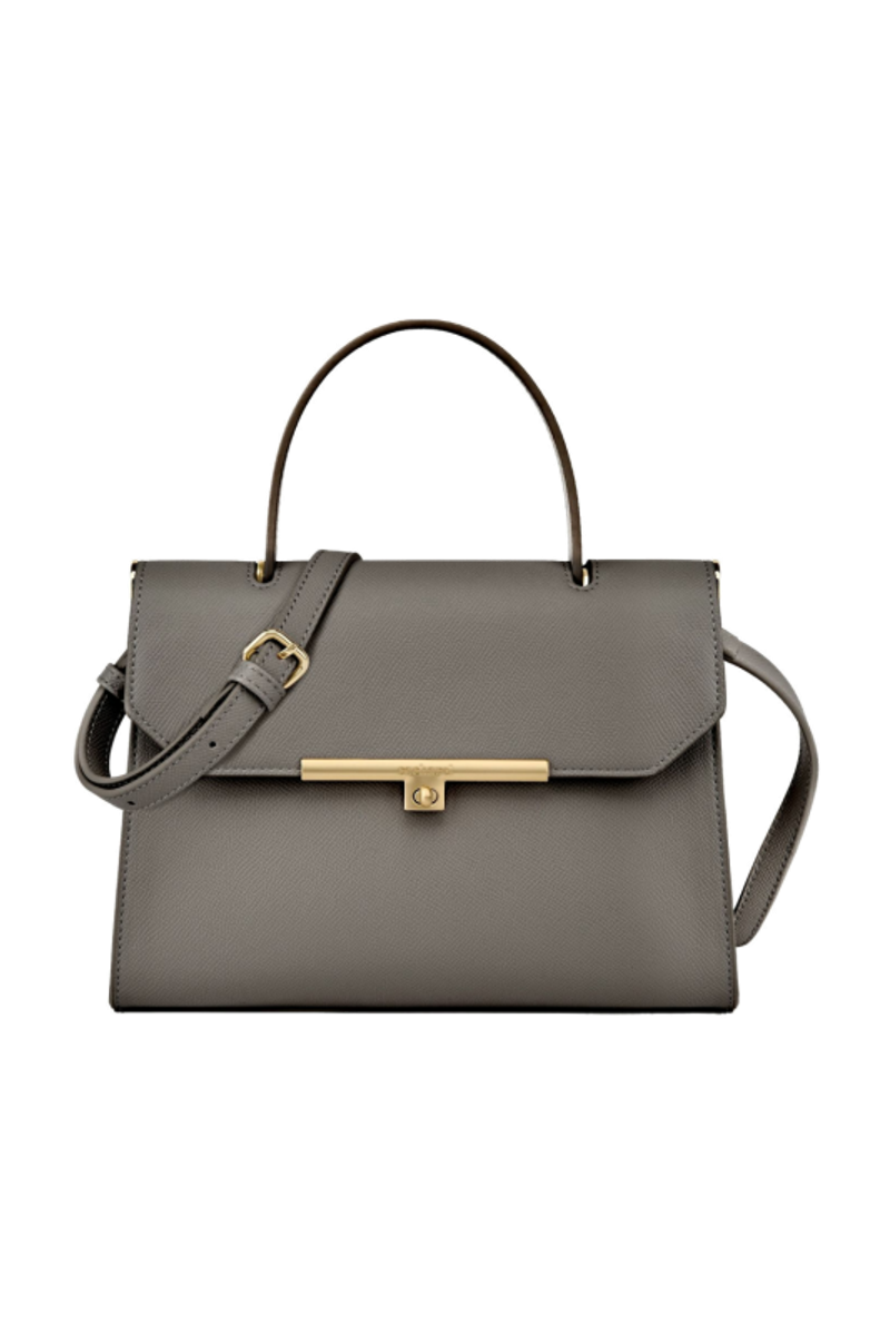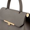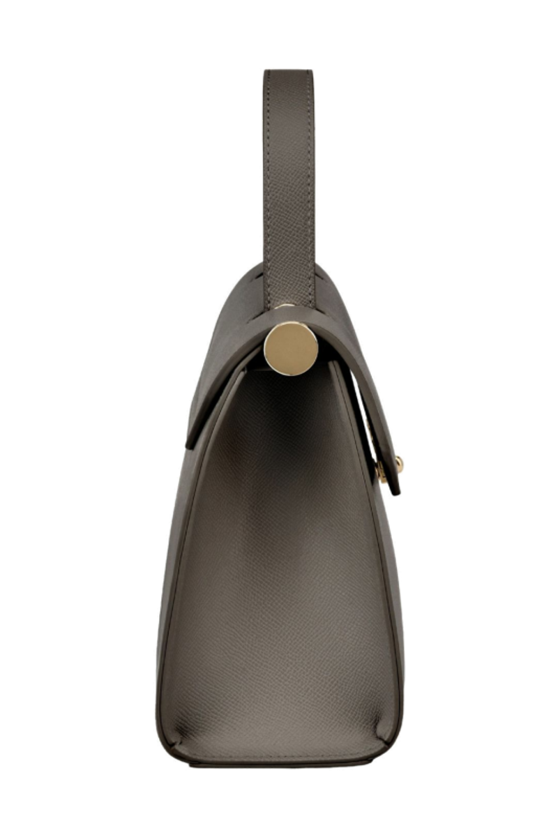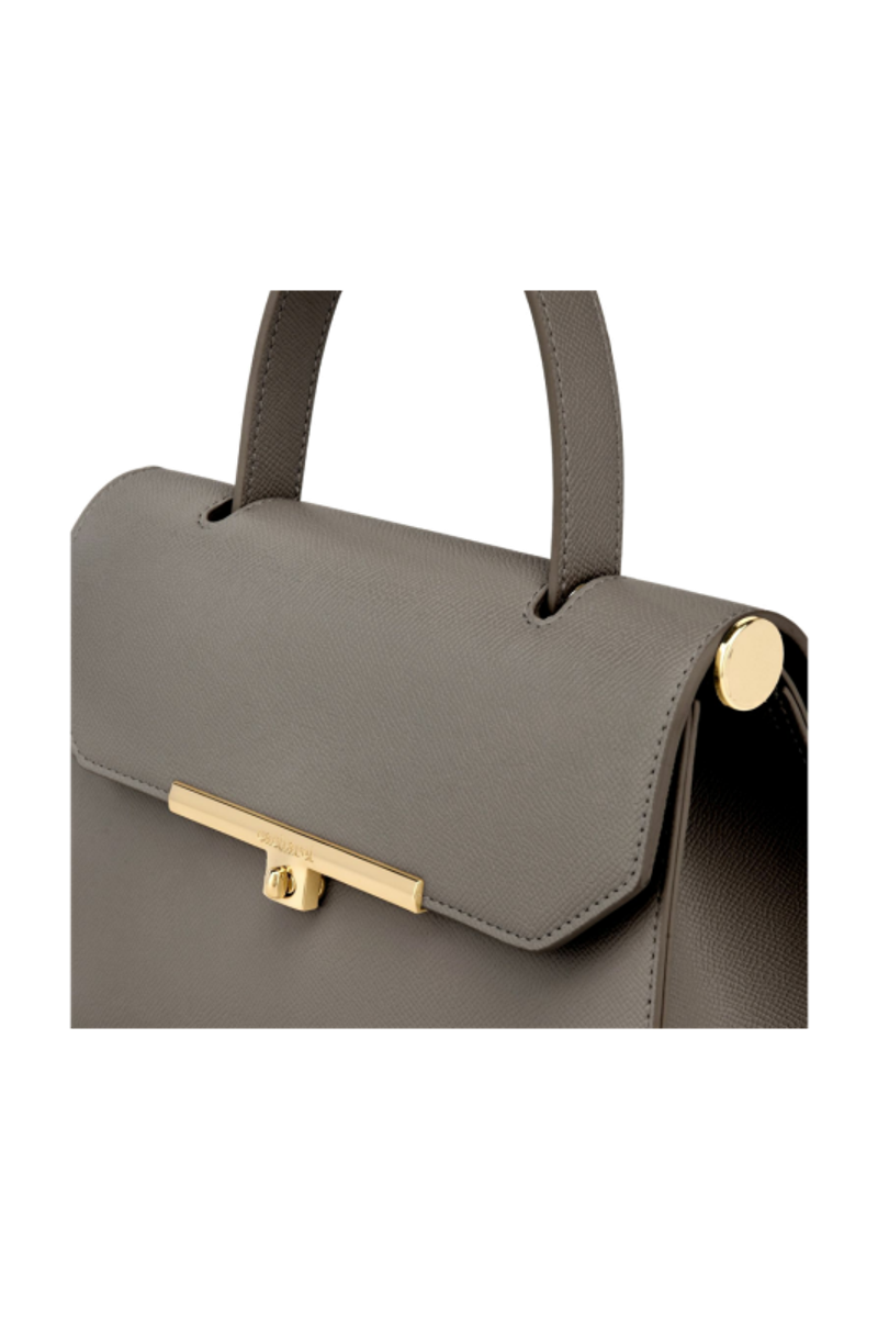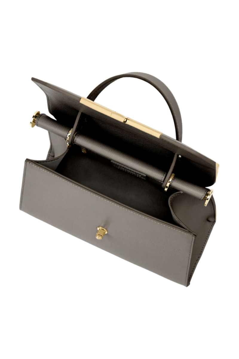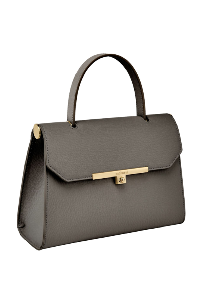 The Seraphine large bag exudes timeless sophistication with its structured and luxurious silhouette. Crafted from saffiano-textured vegan leather, it is signed with an exclusive gold turn-lock closure engraved with the Cacharel logo, embodying refined minimalism. Its elegant top handle enhances its polished character, while all gold trims add a feminine and elevated accent. A discreet gold TPU logo on the back completes the signature details. Designed to balance style and functionality, the spacious interior includes a zipped compartment for everyday organization. Available in taupe, light grey, and black.
