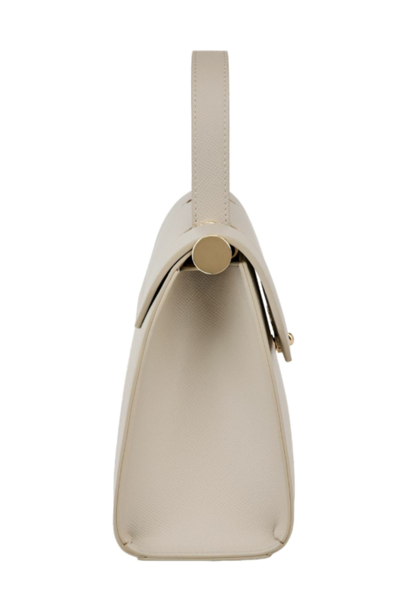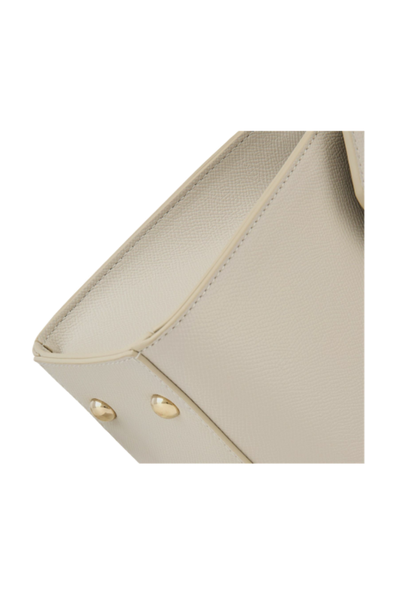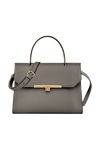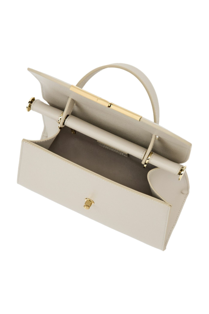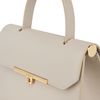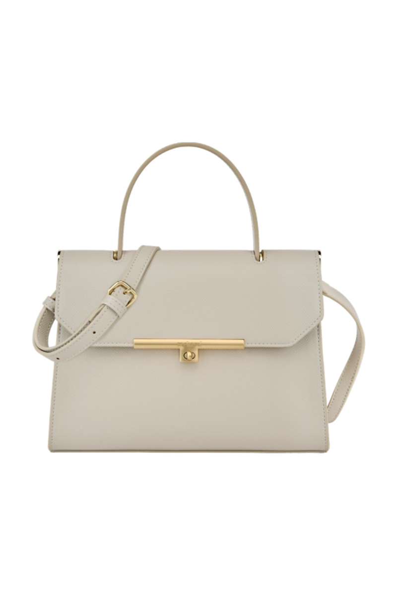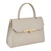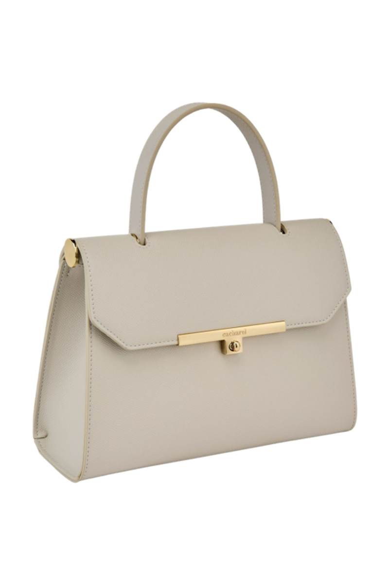 The Seraphine large bag exudes timeless sophistication with its structured and luxurious silhouette. Crafted from saffiano-textured vegan leather, it is signed with an exclusive gold turn-lock closure engraved with the Cacharel logo, embodying refined minimalism. Its elegant top handle enhances its polished character, while all gold trims add a feminine and elevated accent. A discreet gold TPU logo on the back completes the signature details. Designed to balance style and functionality, the spacious interior includes a zipped compartment for everyday organization. Available in taupe, light grey, and black.