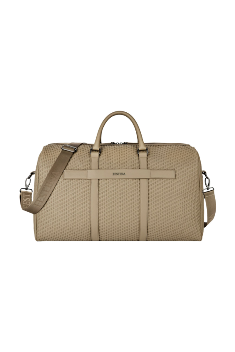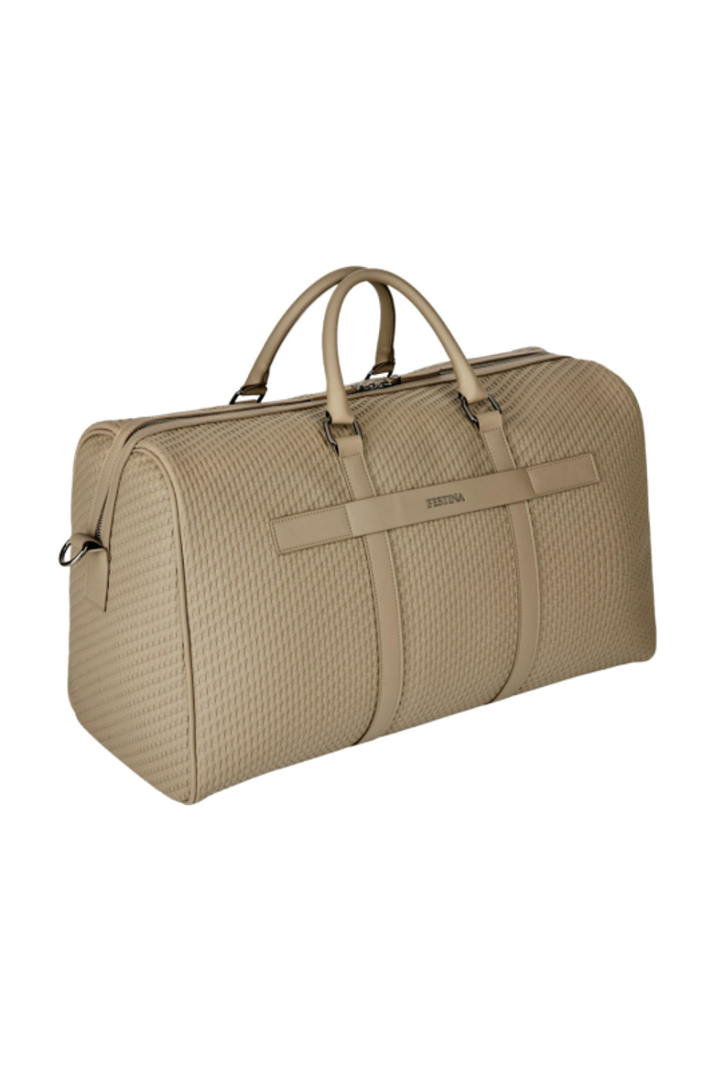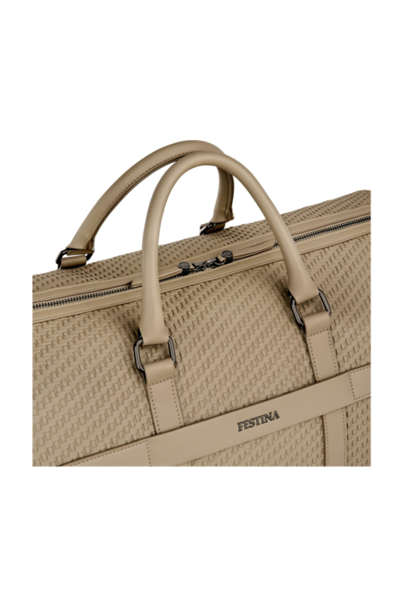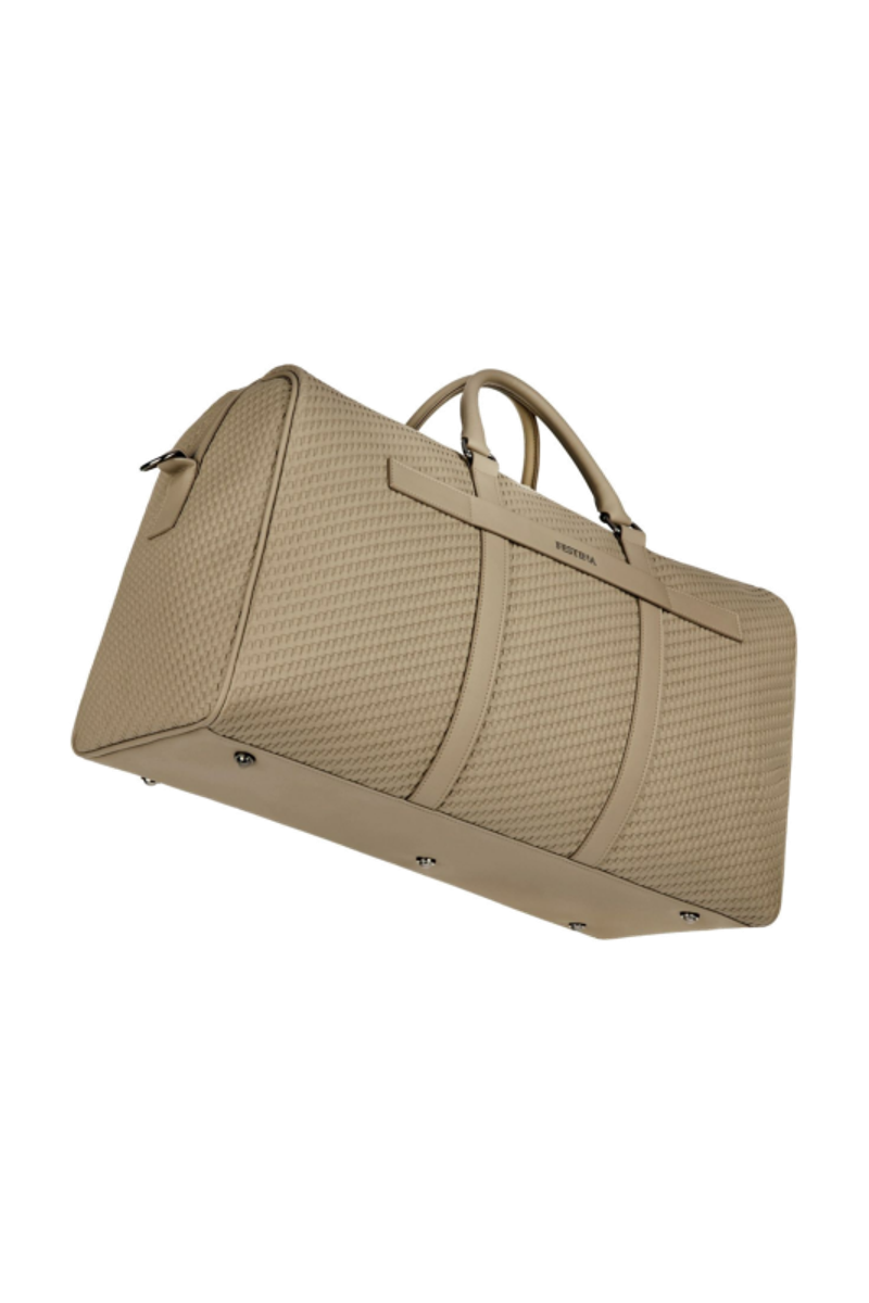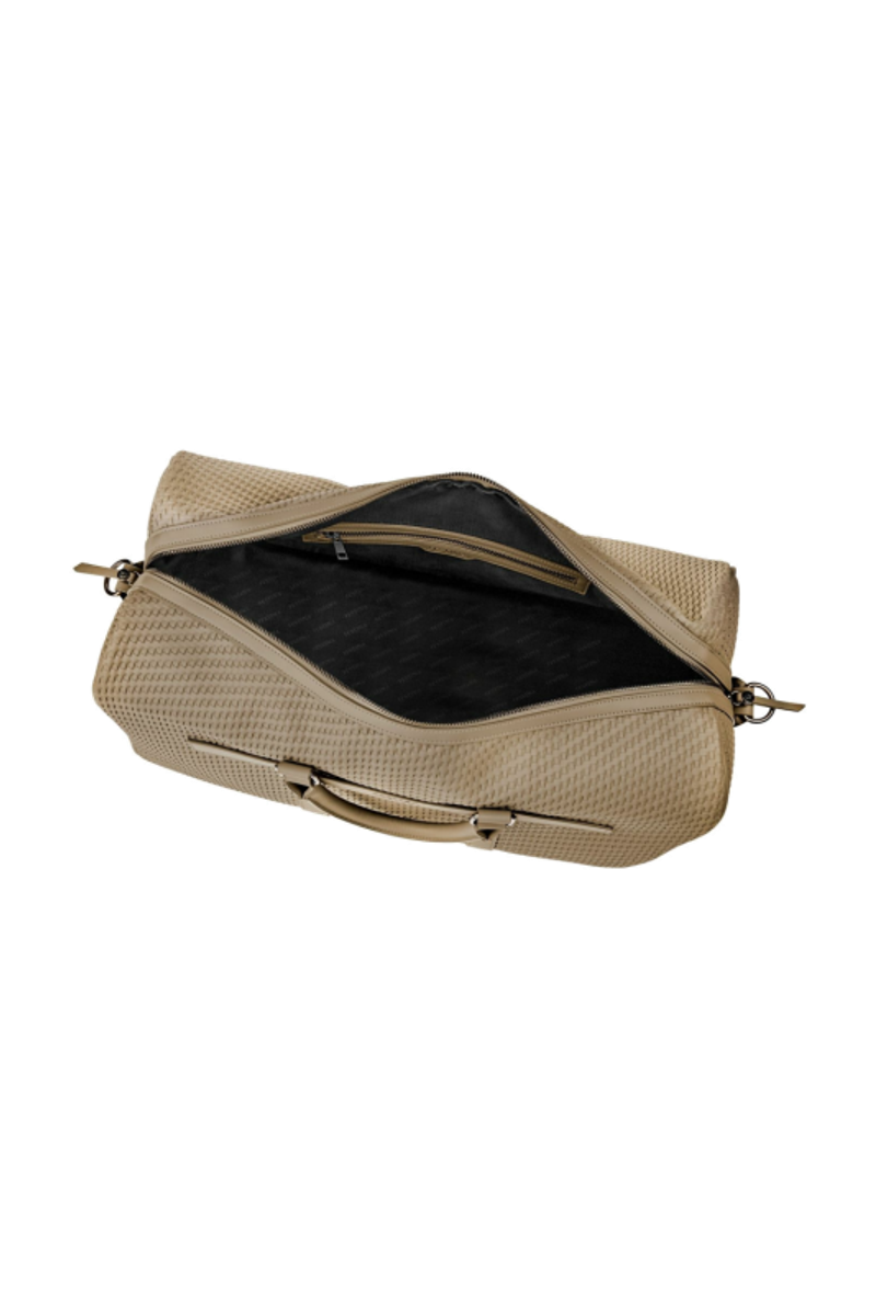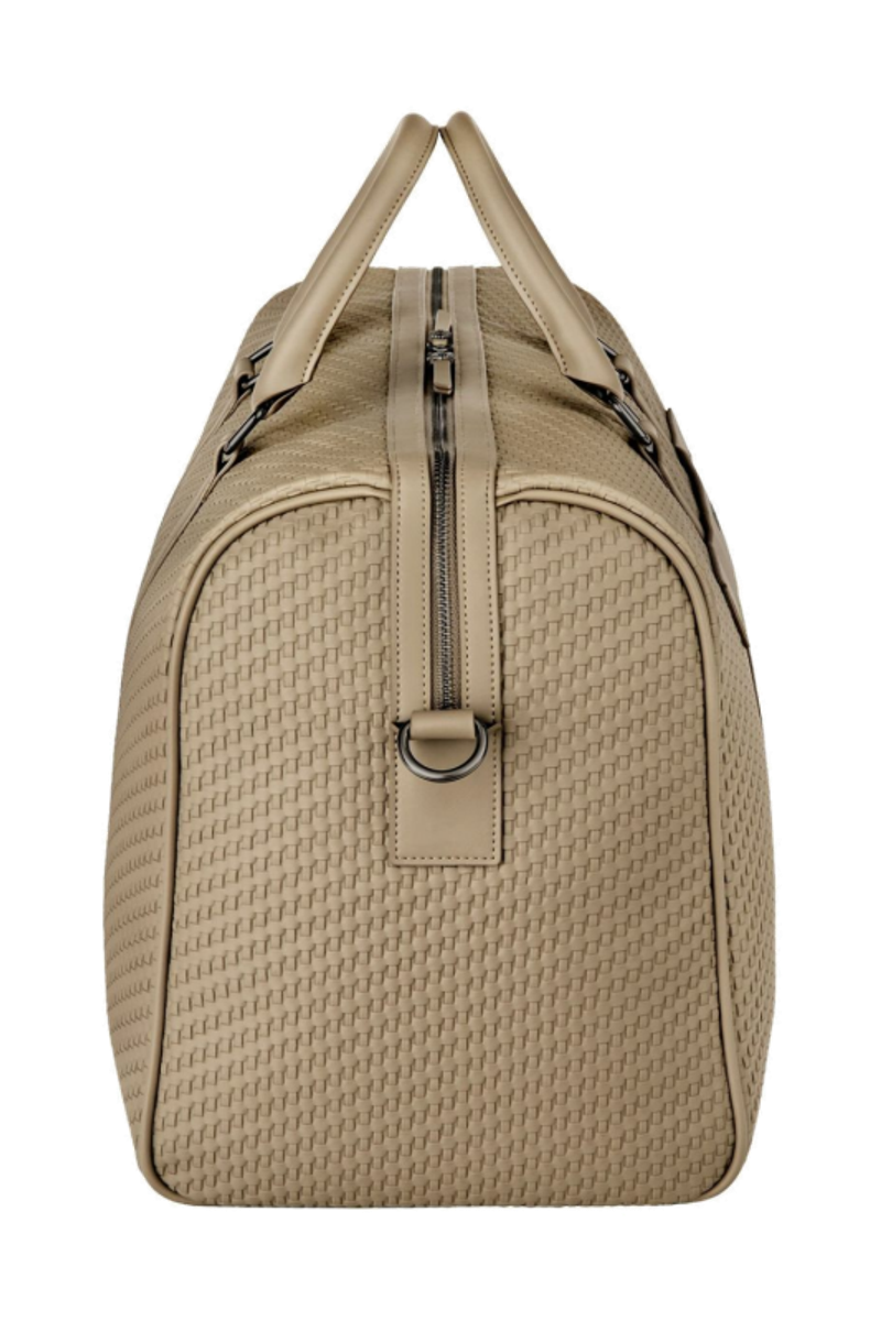 Defined by its woven-inspired texture, the Interlace weekend bag in taupe is crafted to resemble meticulous braiding and finished in a smooth matte that reinforces its luxurious, contemporary feel. This distinctive surface shapes its visual identity with depth and sophistication, elevated by signed details including blazon-engraved zipper pullers. Roamy and designed for effortless short escapes or work trips, the bag features a practical zipped pocket inside and a monogramed tone-on-tone lining that completes the design with refined precision. Paired with sleek gun accents, it stands as a resolutely chic expression of rich texture and modern elegance.