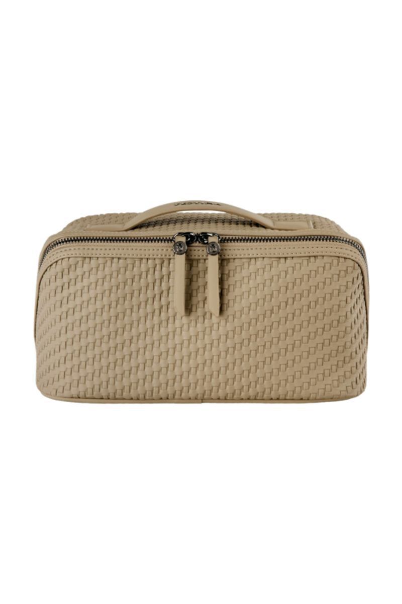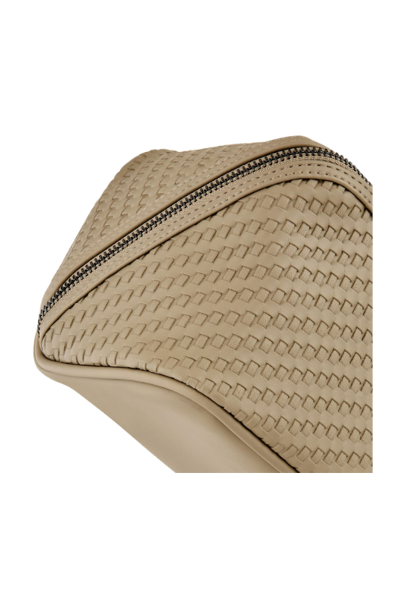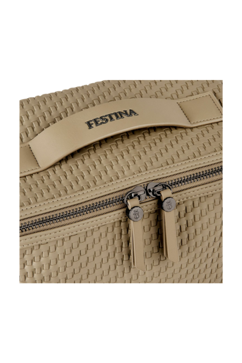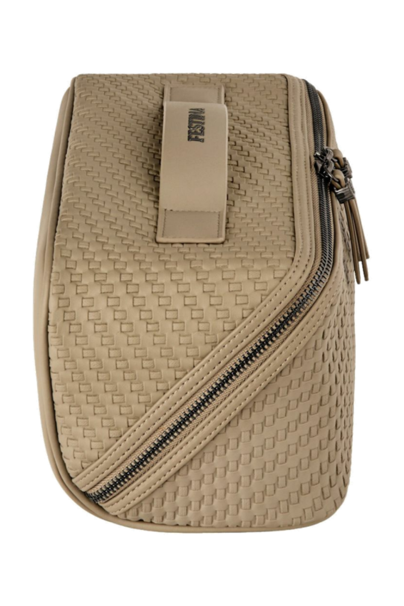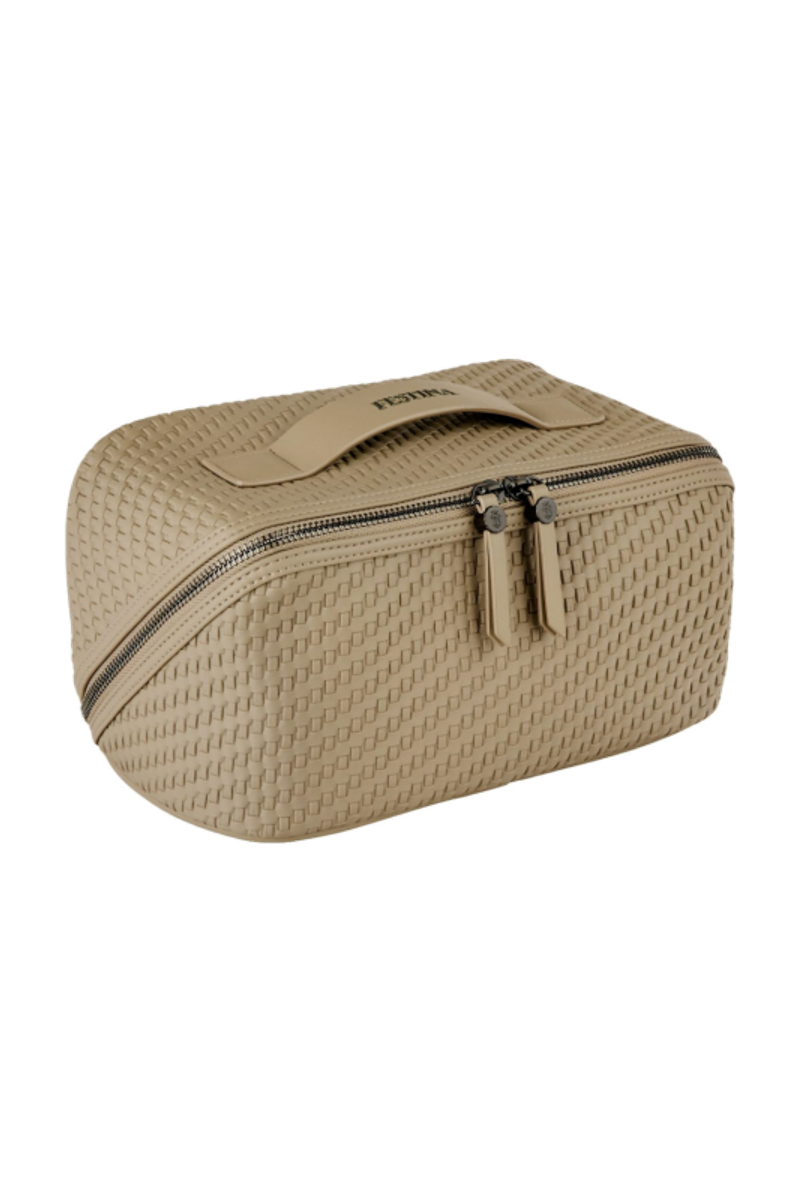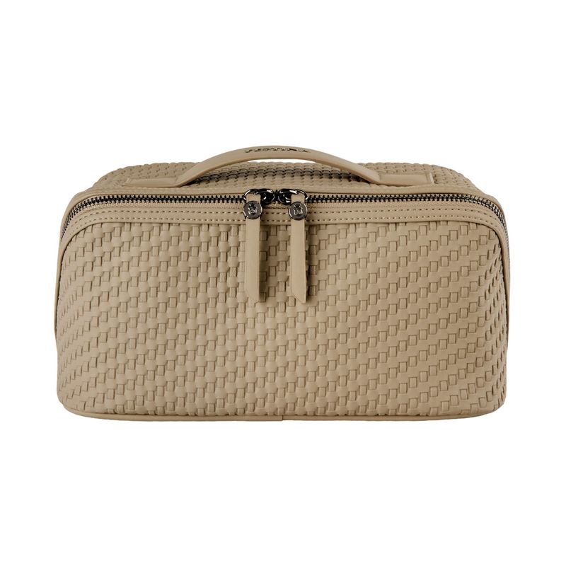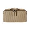 The Interlace cosmetic bag in taupe showcases the line’s woven-inspired texture, crafted to resemble meticulous braiding and finished in a smooth matte for a luxurious, contemporary feel. This distinctive surface shapes its visual identity with depth and sophistication, elevated by signed details including blazon-engraved zipper pullers. Its smart, distinctive construction opens wide to reveal a roamy interior equipped with a side elastic pouch for effortless organisation—an ideal companion for the organised and elegant traveller. Completed with sleek gun accents, it embodies refined modern elegance.