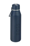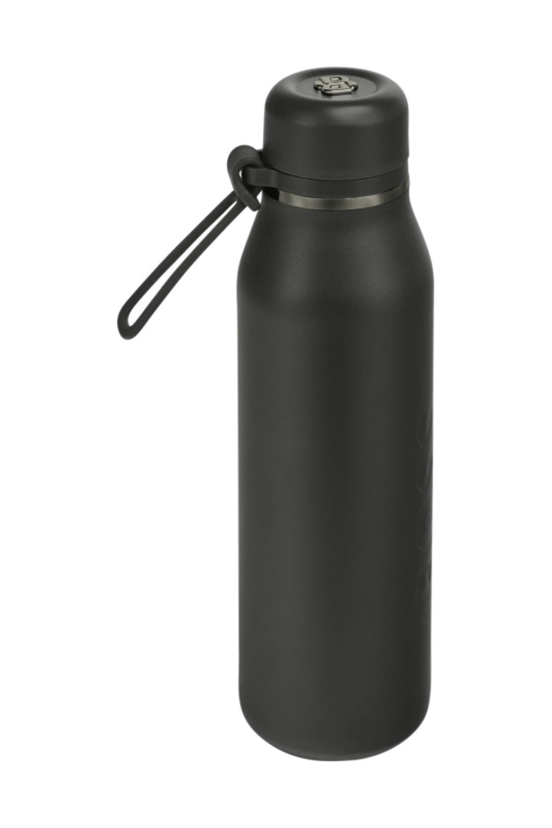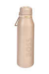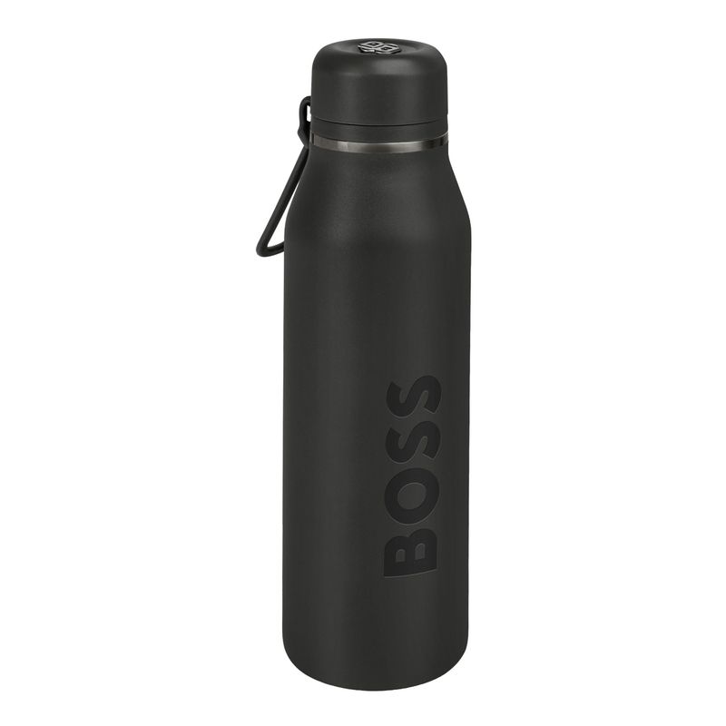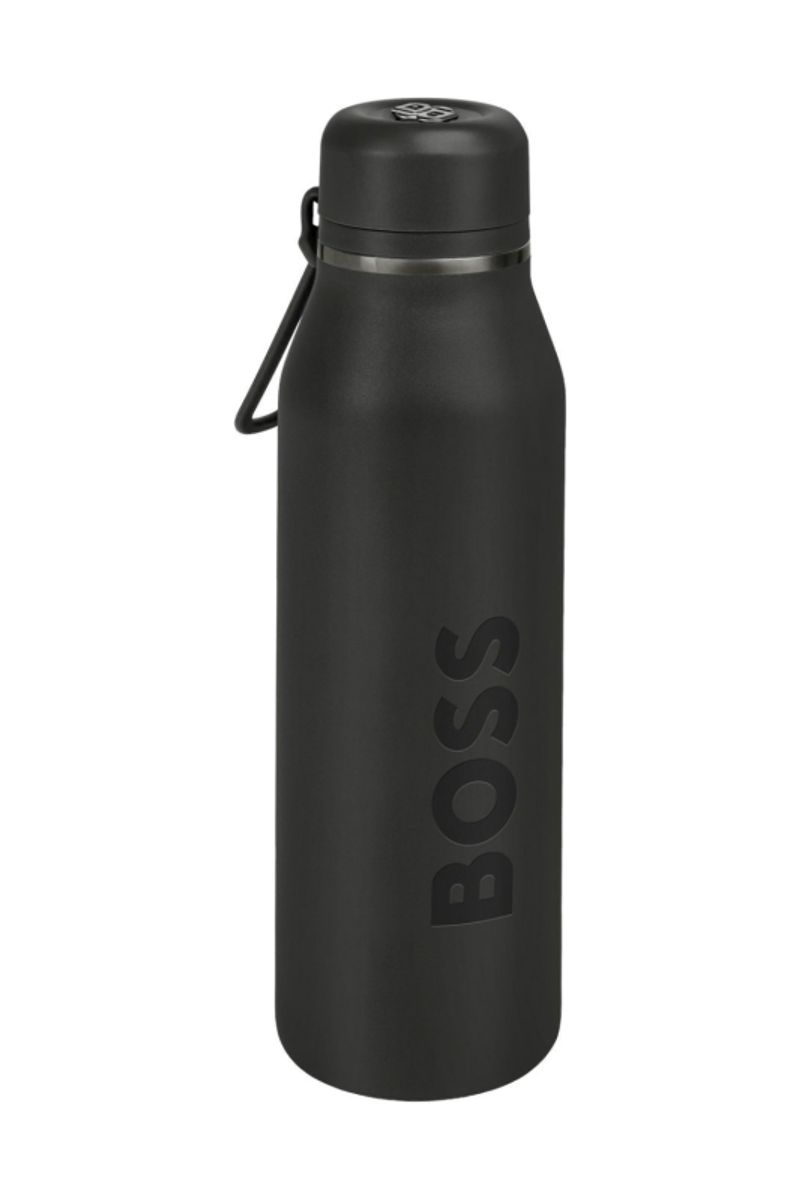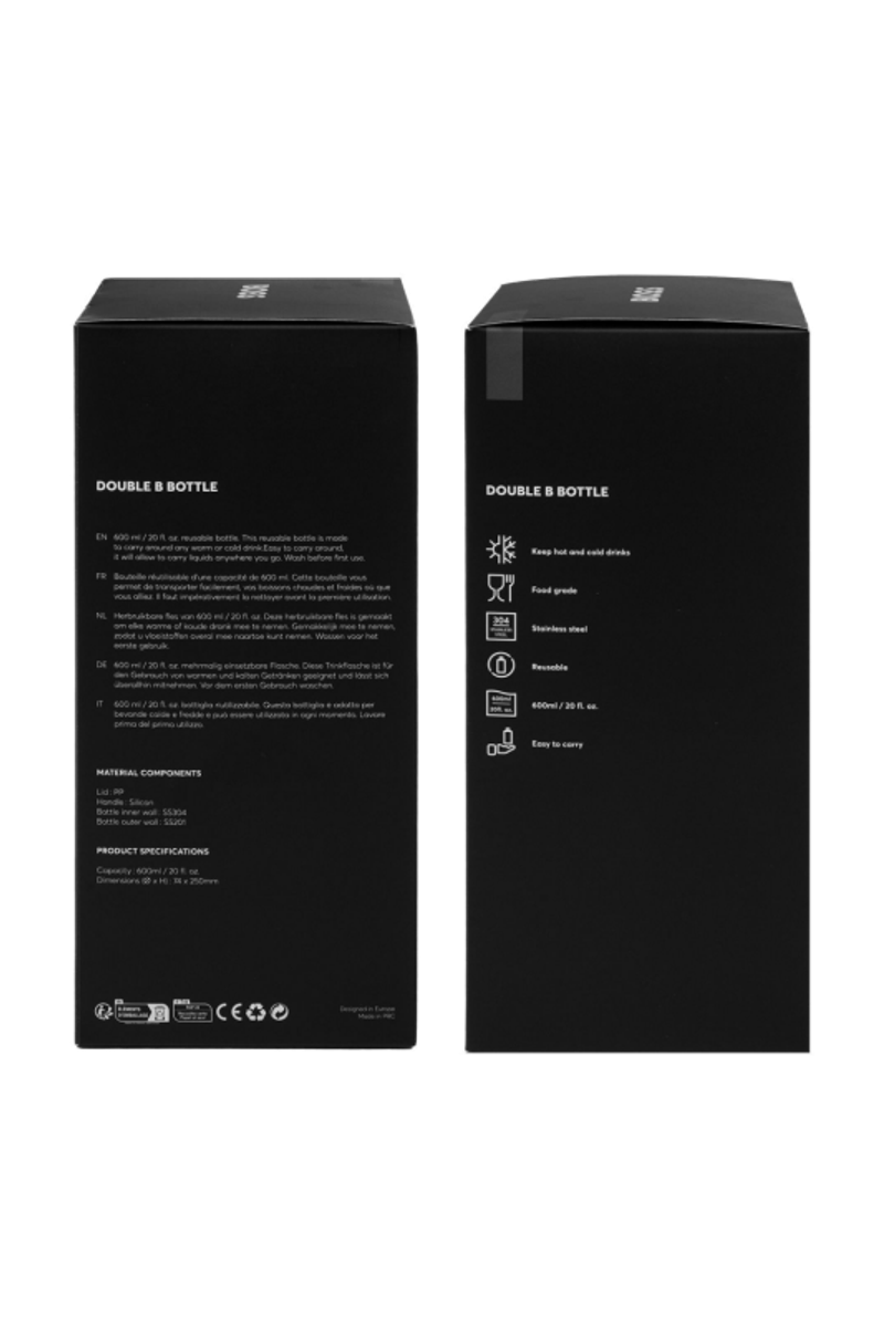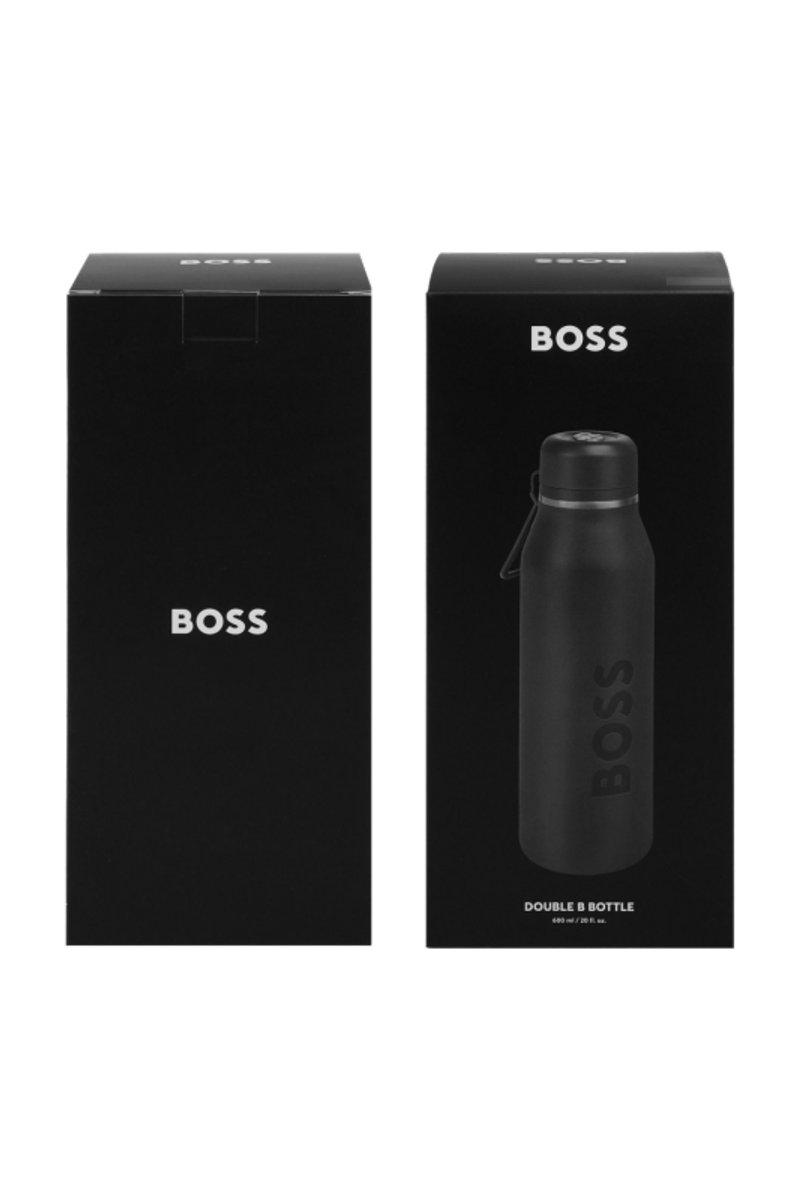 The BOSS bottle features a smooth, matte surface embossed with an oversized BOSS logo, delivering a minimal and unisex yet luxurious expression through a clean, modern silhouette in black with sleek gunmetal trims. The design is completed by a plated Double B logo on the lid in matching metal tones, while carefully coordinated details and a tone-on-tone silicone strap ensure a cohesive and streamlined look. With a 600 ml capacity, the bottle is designed for everyday use and easy portability, carrying both hot and cold drinks throughout the day. The bottle is double-walled, with SS304 inner and SS201 outer material.