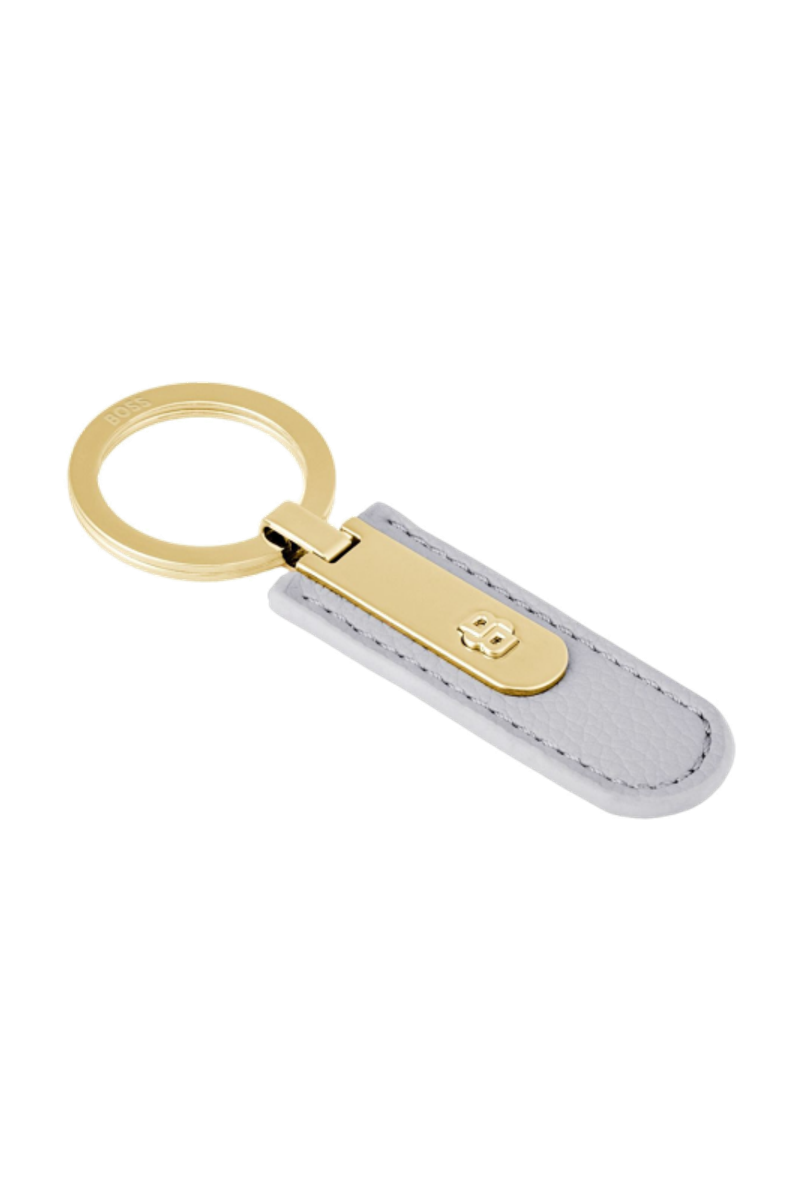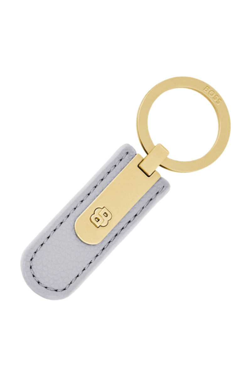 This keyring is crafted from carefully selected grained material and defined by a clean, minimal silhouette elevated with luxurious gold accents. A three-dimensional Double B signature emerges from the central band, creating a distinctive focal point, while the BOSS logo engraved on the ring completes the design with an understated signature. Offered in black, burgundy, taupe, nude, or lilac, it balances delicacy and refinement with a clear, modern BOSS touch.
