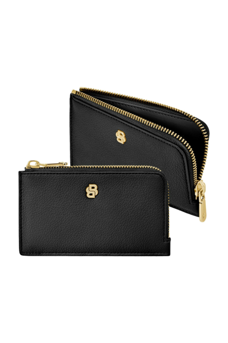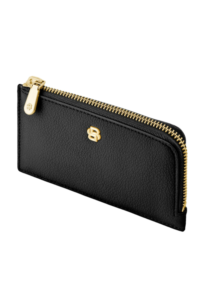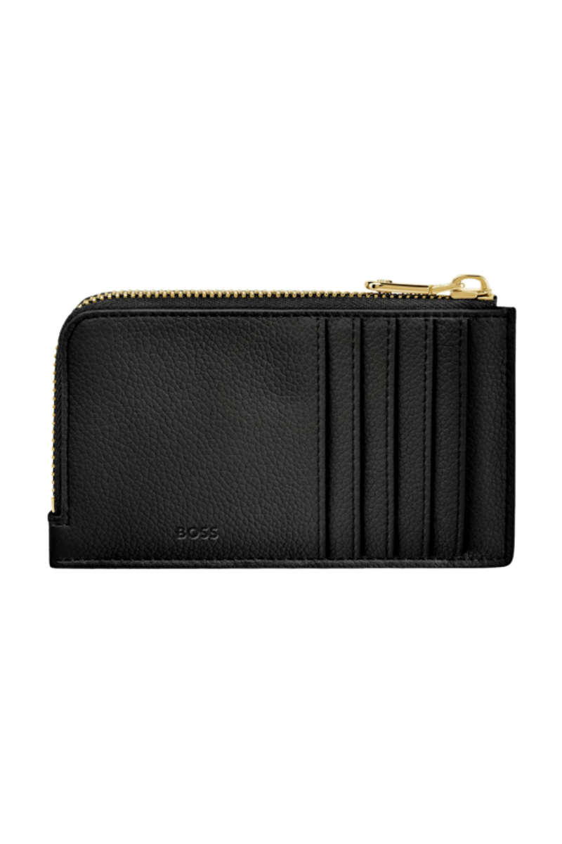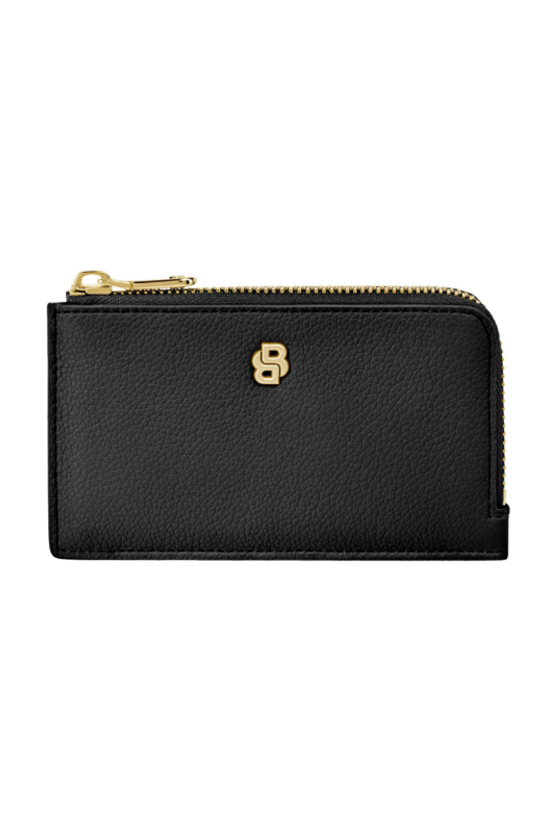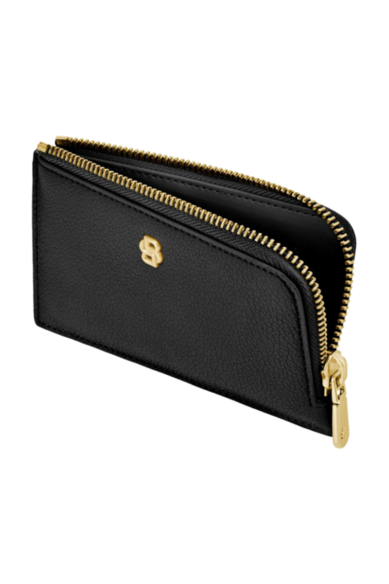 This compact pouch is crafted in grained matte PU and defined by a refined Double B signature plate on the front, complemented by a BOSS logo embossed on the back. The design features newly developed light gold–plated zippers adorned with a Double B detail, bringing a soft and delicate finish while remaining clean and minimal. The back is fitted with five card slots for easy access, while the roomy main compartment includes an additional interior slot for organized storage. Finished entirely with light gold trims, the piece is offered in a soft and vibrant color palette including black, burgundy, taupe, nude, and lilac.