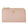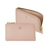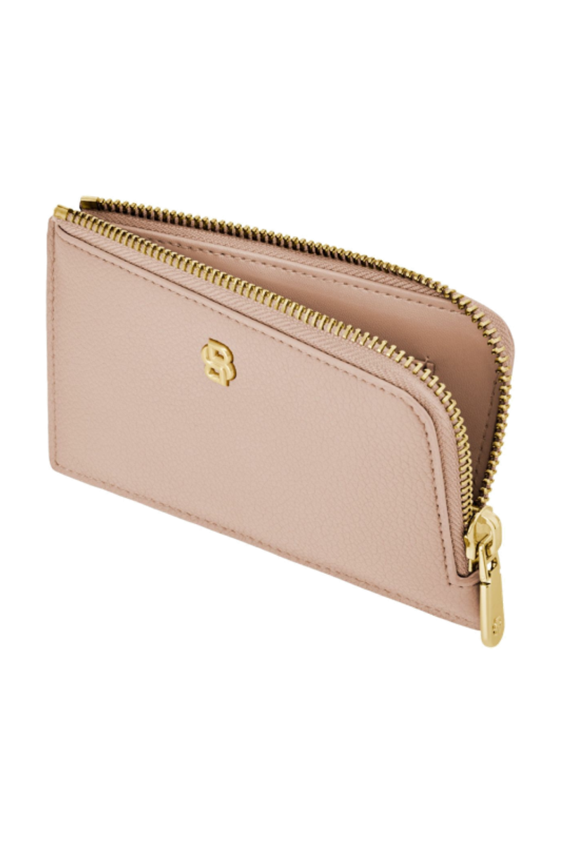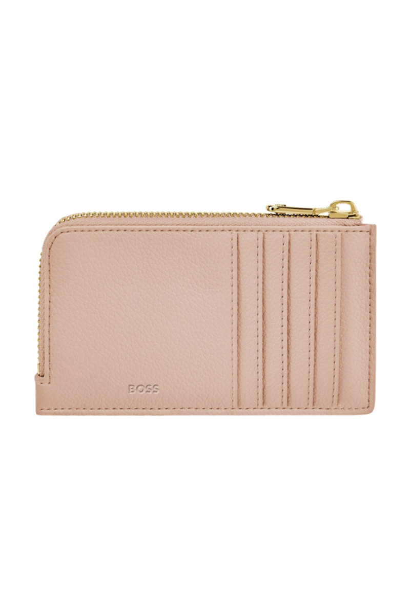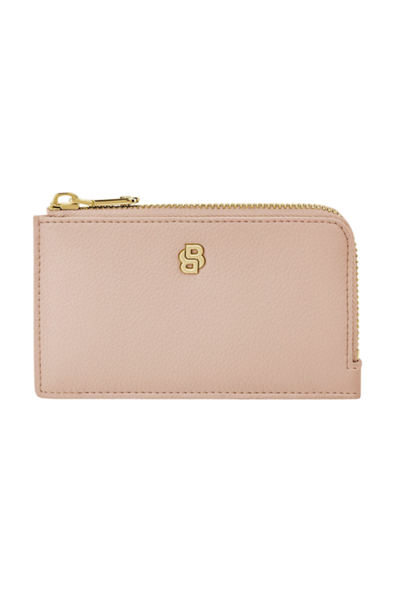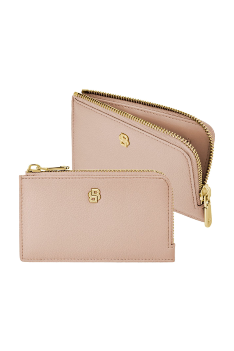 This compact pouch is crafted in grained matte PU and defined by a refined Double B signature plate on the front, complemented by a BOSS logo embossed on the back. The design features newly developed light gold–plated zippers adorned with a Double B detail, bringing a soft and delicate finish while remaining clean and minimal. The back is fitted with five card slots for easy access, while the roomy main compartment includes an additional interior slot for organized storage. Finished entirely with light gold trims, the piece is offered in a soft and vibrant color palette including black, burgundy, taupe, nude, and lilac.