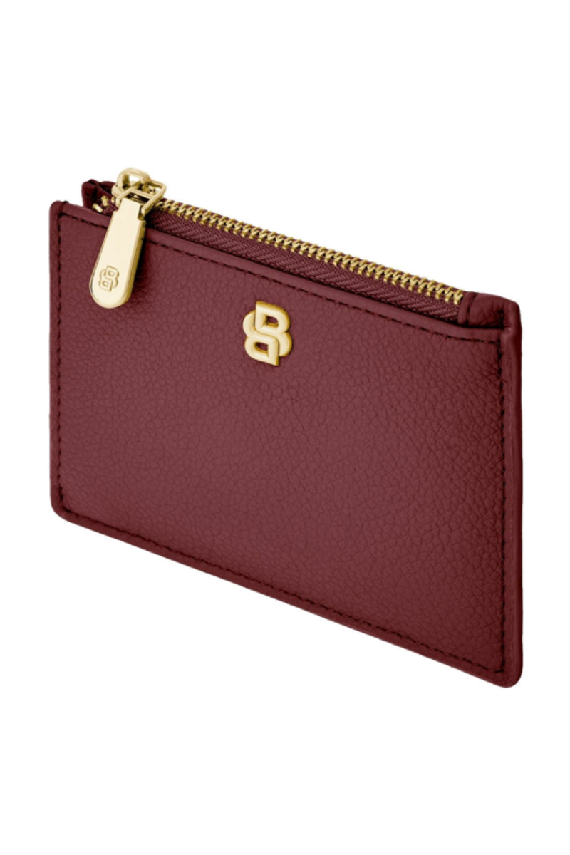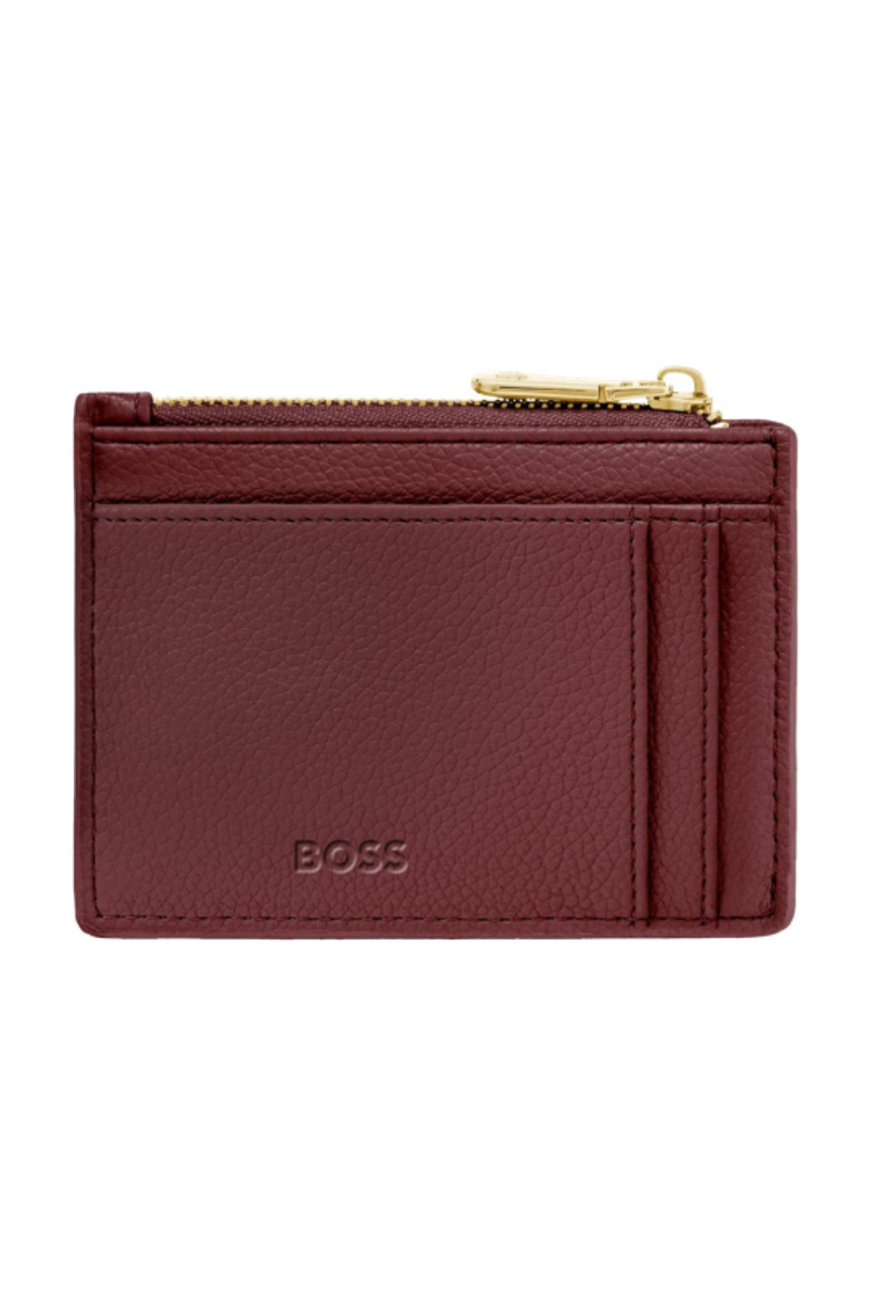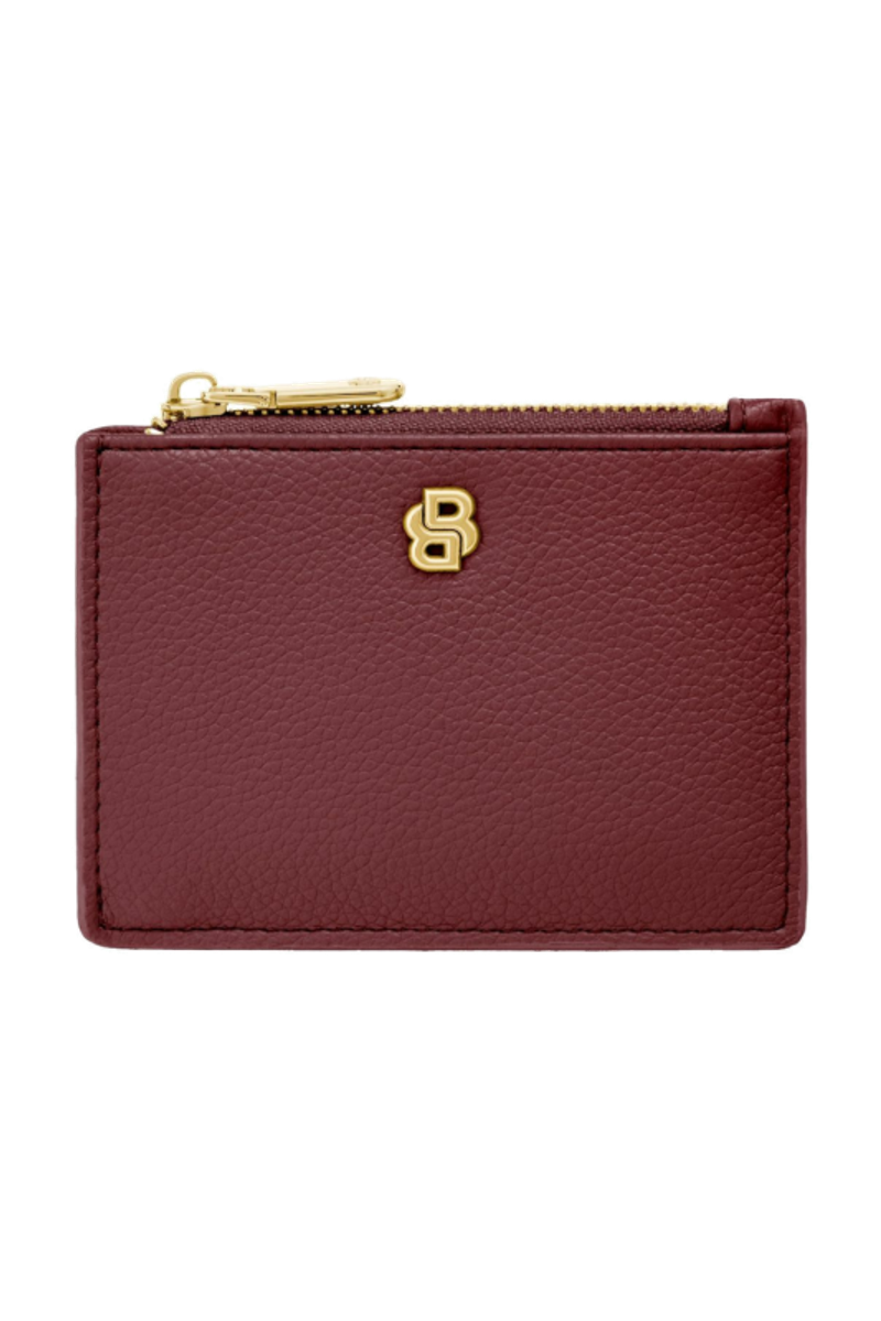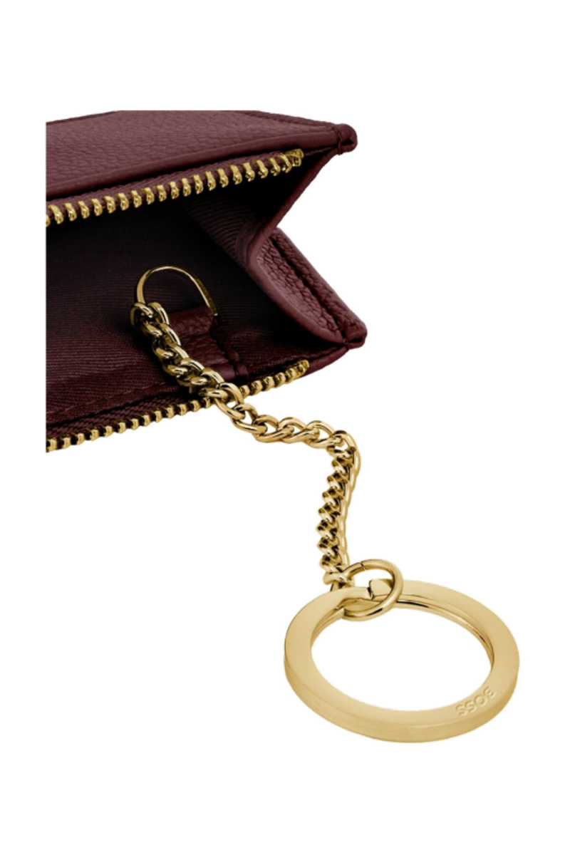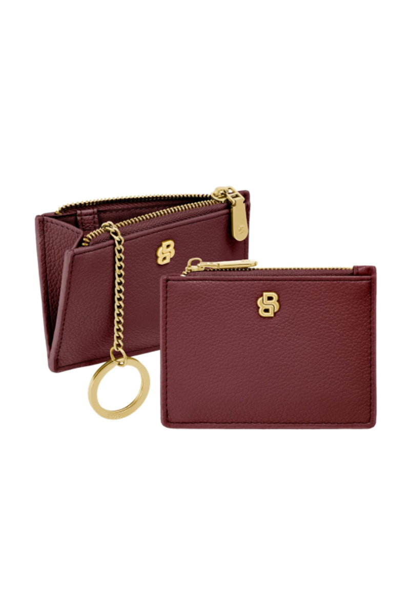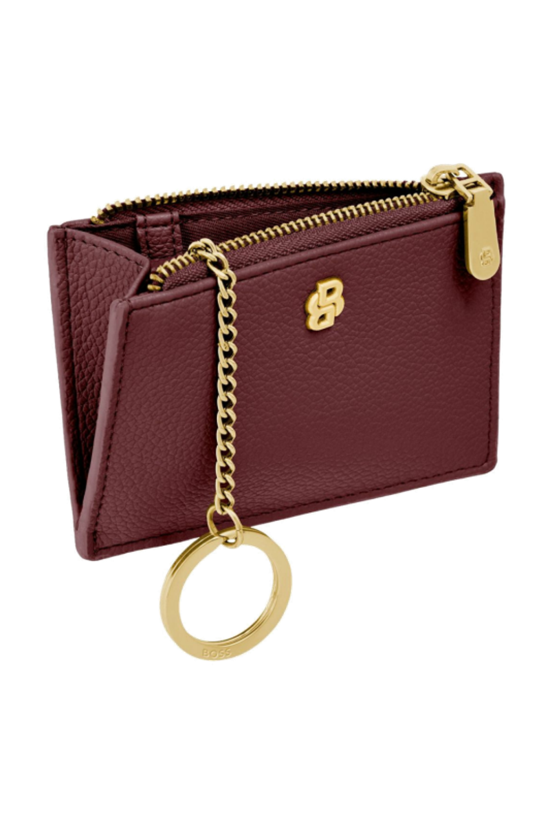 This refined accessory is designed as a hybrid between a card holder and a keyring, allowing it to be used seamlessly as both. Crafted in grained matte PU, it is highlighted by a Double B signature plate on the front and balanced by a BOSS logo embossed on the back. Newly developed light gold–plated zippers with a Double B detail bring a soft, delicate finish while maintaining a clean, minimal look. The construction features three card slots on the back and a roomy, gusseted main compartment secured with a zip, which includes an integrated BOSS keyring attached to a jewelry-like chain. Finished entirely with light gold trims, the piece is offered in a soft and vibrant color palette of black, burgundy, taupe, nude, and lilac.