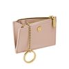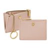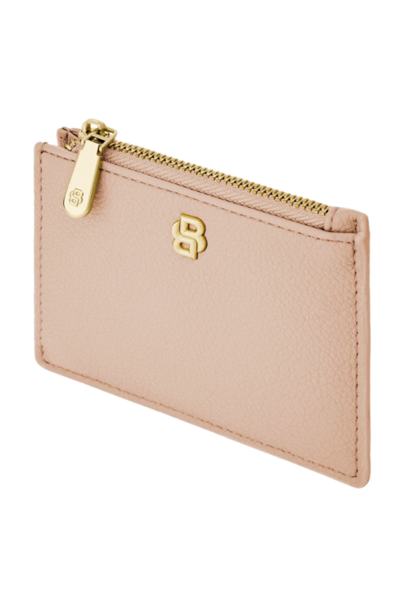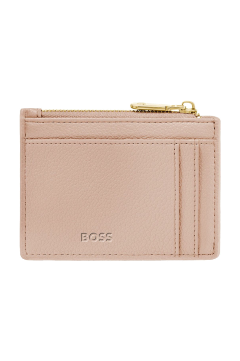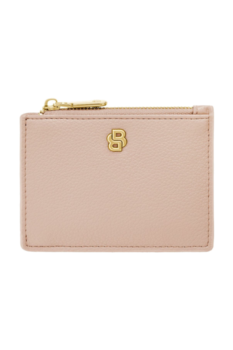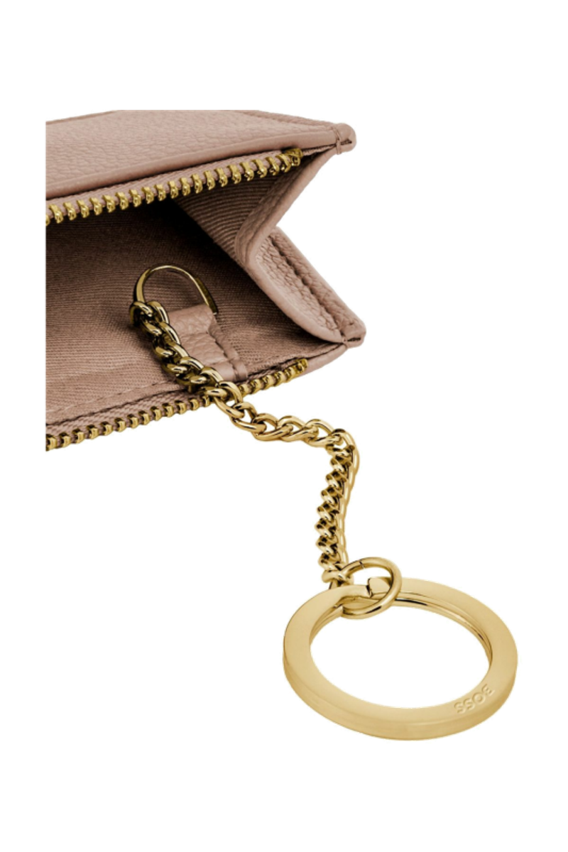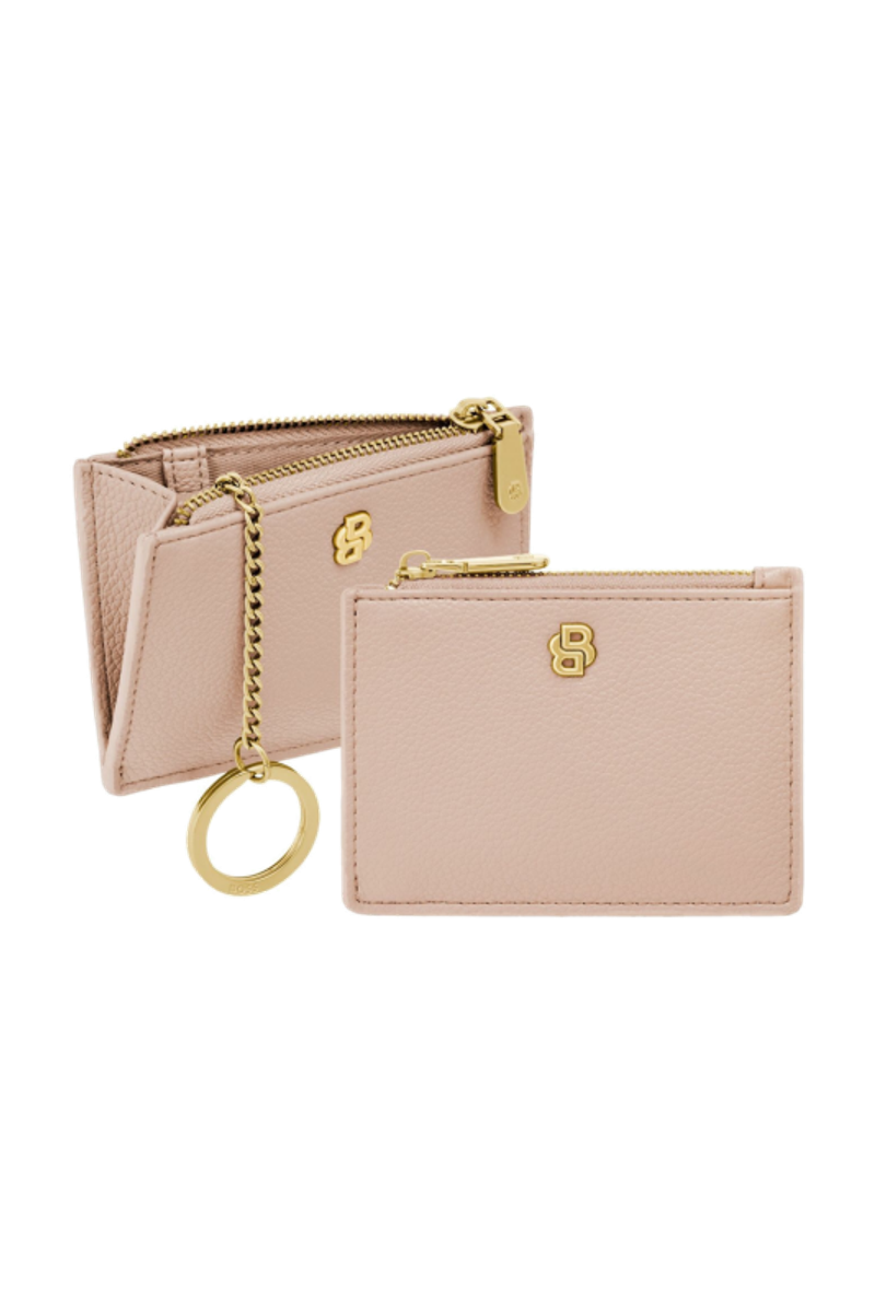 This refined accessory is designed as a hybrid between a card holder and a keyring, allowing it to be used seamlessly as both. Crafted in grained matte PU, it is highlighted by a Double B signature plate on the front and balanced by a BOSS logo embossed on the back. Newly developed light gold–plated zippers with a Double B detail bring a soft, delicate finish while maintaining a clean, minimal look. The construction features three card slots on the back and a roomy, gusseted main compartment secured with a zip, which includes an integrated BOSS keyring attached to a jewelry-like chain. Finished entirely with light gold trims, the piece is offered in a soft and vibrant color palette of black, burgundy, taupe, nude, and lilac.