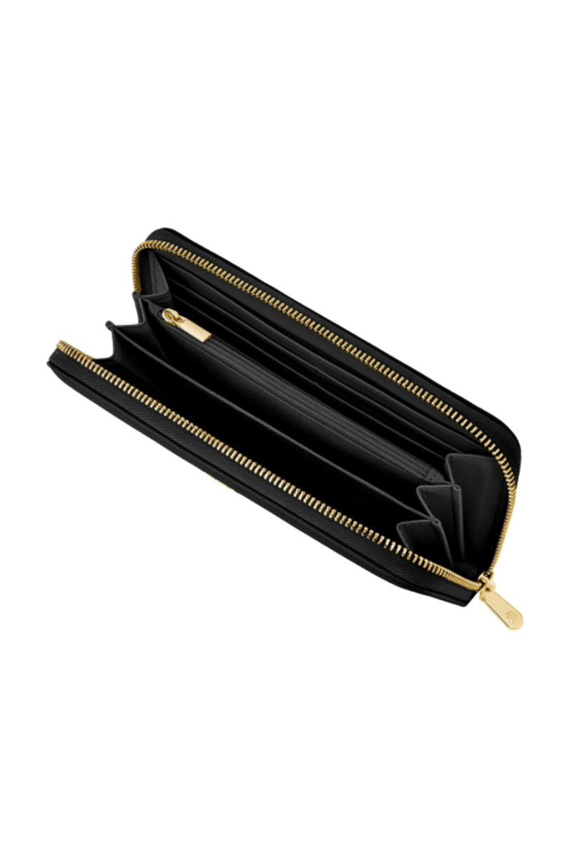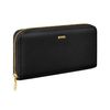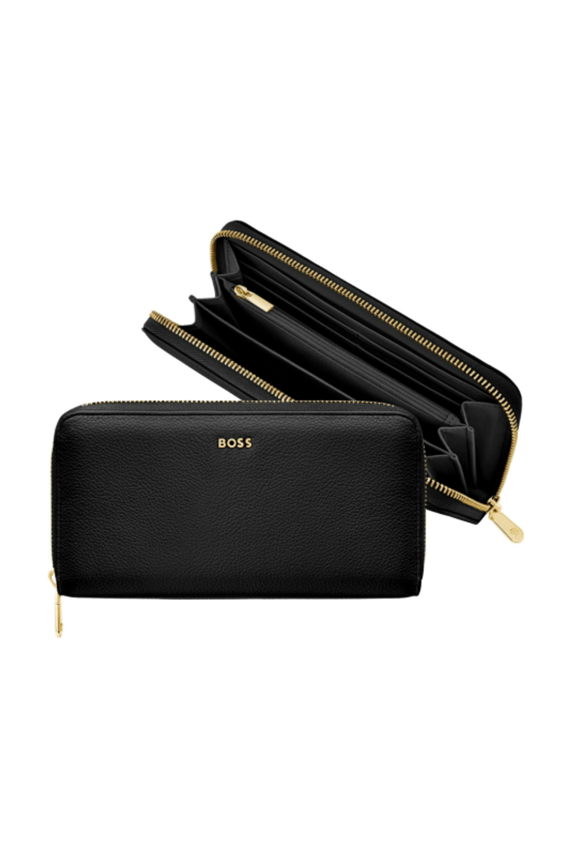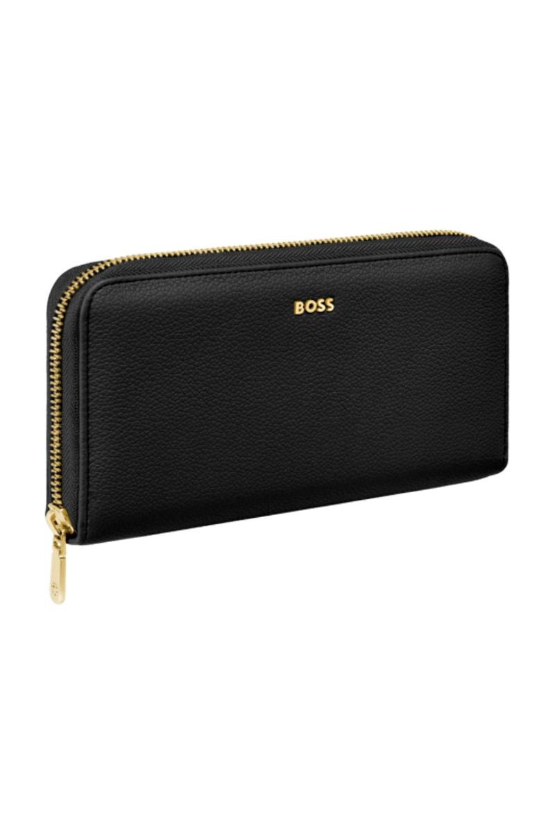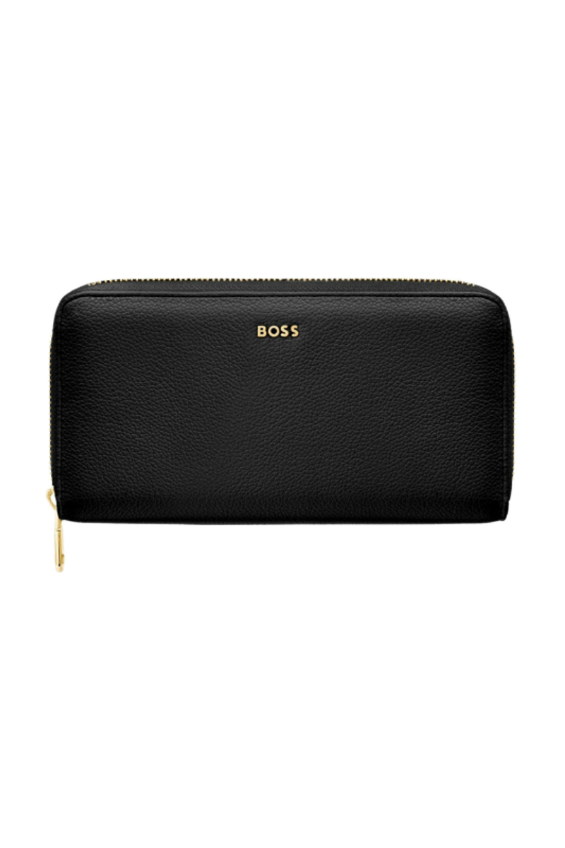 This classic zipped wallet is crafted from carefully selected grained matte PU with a soft, refined hand feel. The design is highlighted by a BOSS logo signature plate on the front and complemented by newly developed light gold–plated zippers featuring a Double B detail. Designed for everyday organization, it offers twelve card slots with six on each side, two note compartments positioned on either side, and a central zipped compartment for secure storage. Finished entirely with light gold trims for an elevated and luxurious touch, the wallet is available in a soft color palette including black, burgundy, taupe, nude, and lilac.
