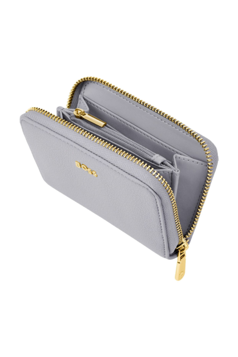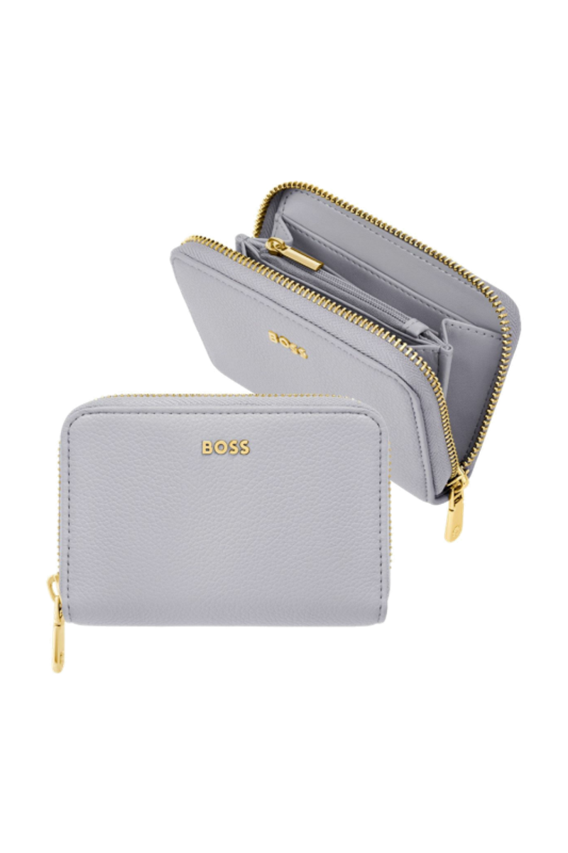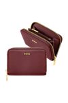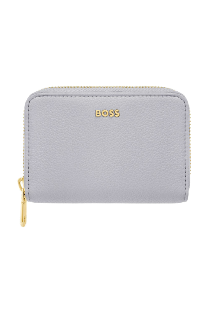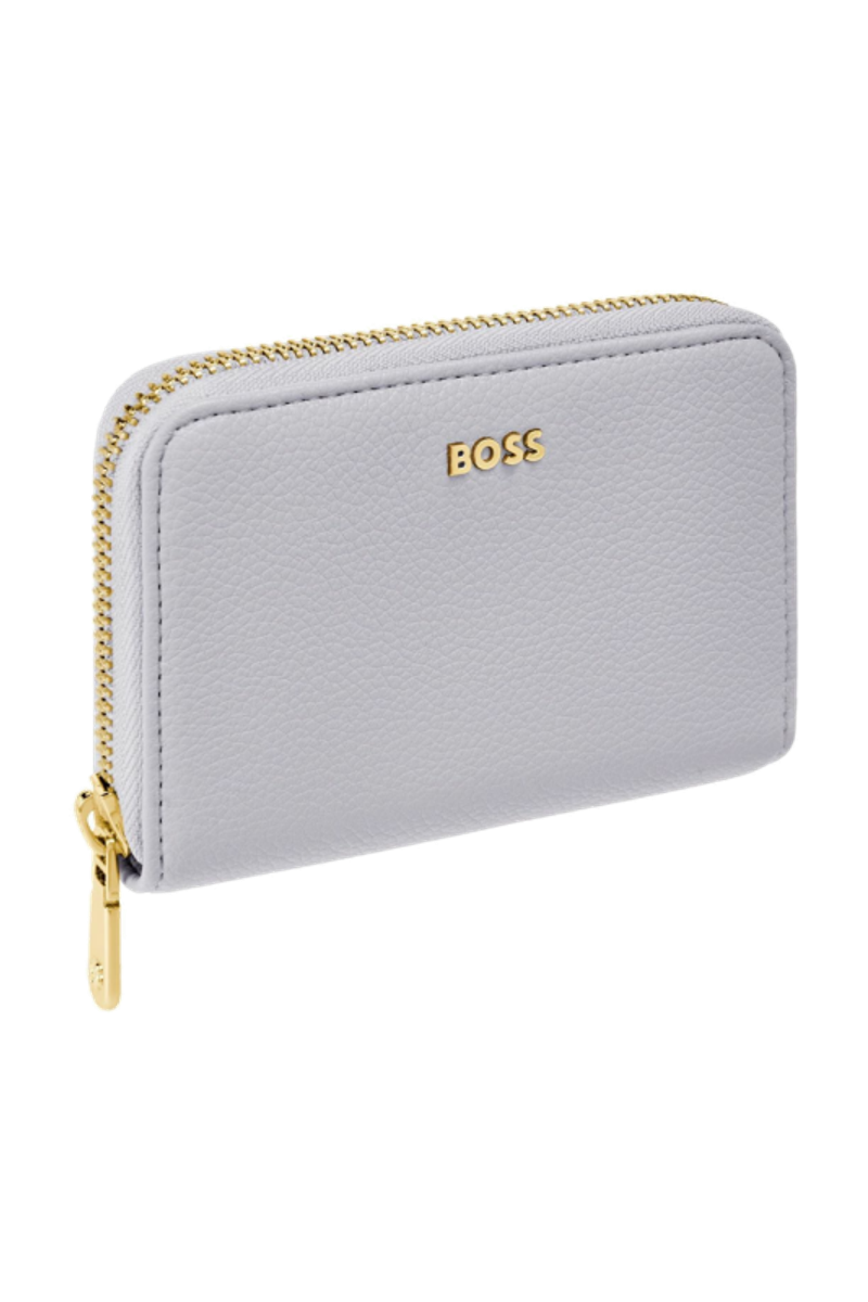 This classic zipped compact wallet is crafted from carefully selected grained matte PU with a soft, refined hand feel. The design is highlighted by a BOSS logo signature plate on the front and complemented by newly developed light gold–plated zippers featuring a Double B detail. Designed to be both compact and functional, it features four card slots with two on each side and a central zipped compartment for secure storage. Finished entirely with light gold trims for an elevated and luxurious touch, the wallet is available in a soft color palette including black, burgundy, taupe, nude, and lilac.