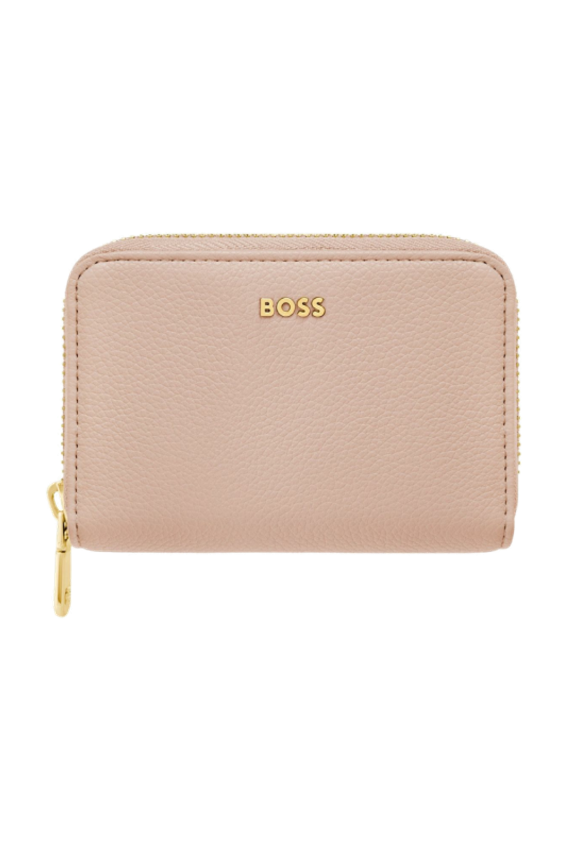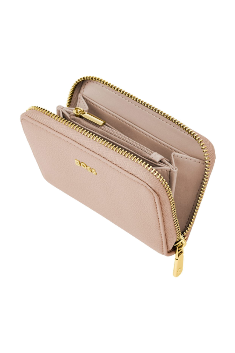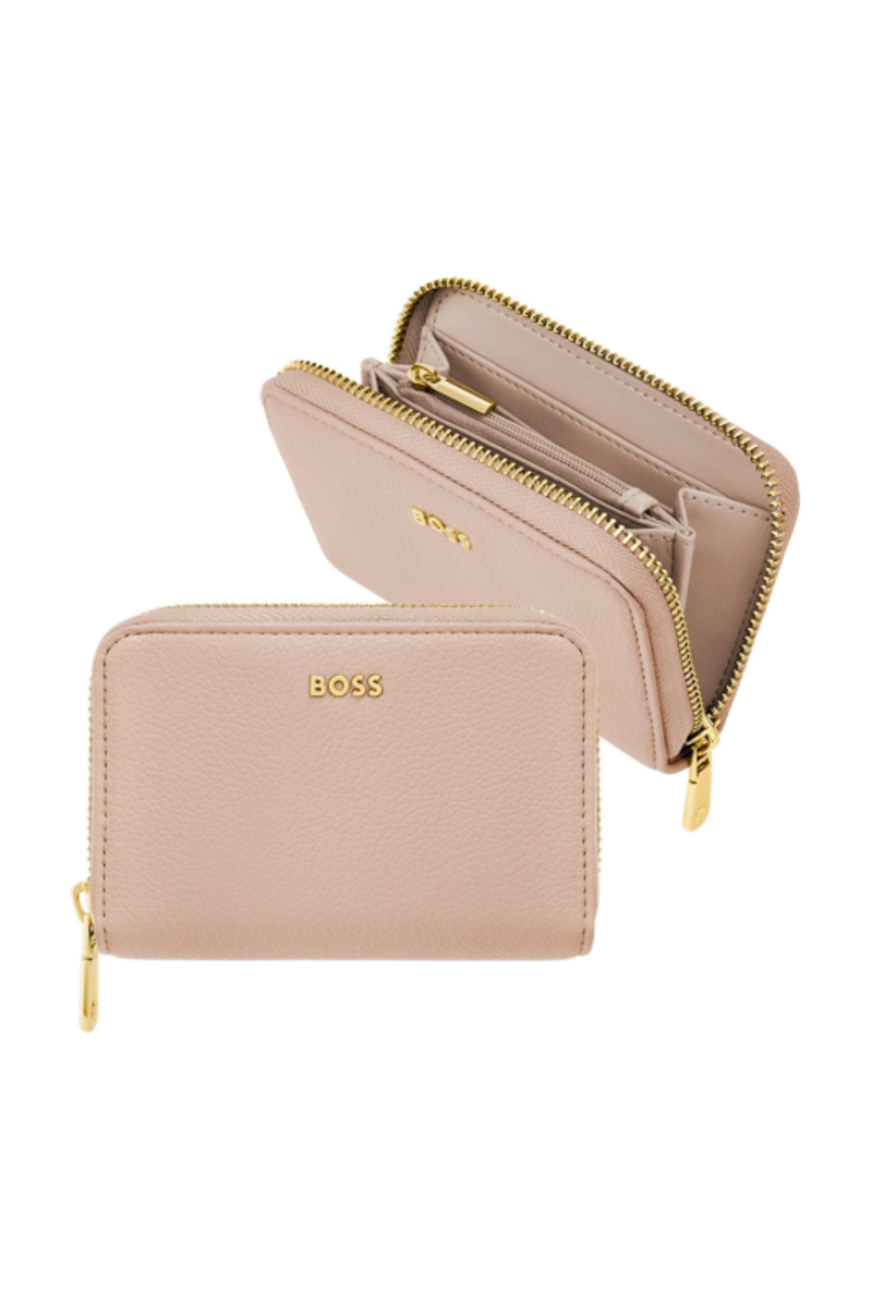 This classic zipped compact wallet is crafted from carefully selected grained matte PU with a soft, refined hand feel. The design is highlighted by a BOSS logo signature plate on the front and complemented by newly developed light gold–plated zippers featuring a Double B detail. Designed to be both compact and functional, it features four card slots with two on each side and a central zipped compartment for secure storage. Finished entirely with light gold trims for an elevated and luxurious touch, the wallet is available in a soft color palette including black, burgundy, taupe, nude, and lilac.