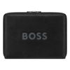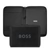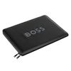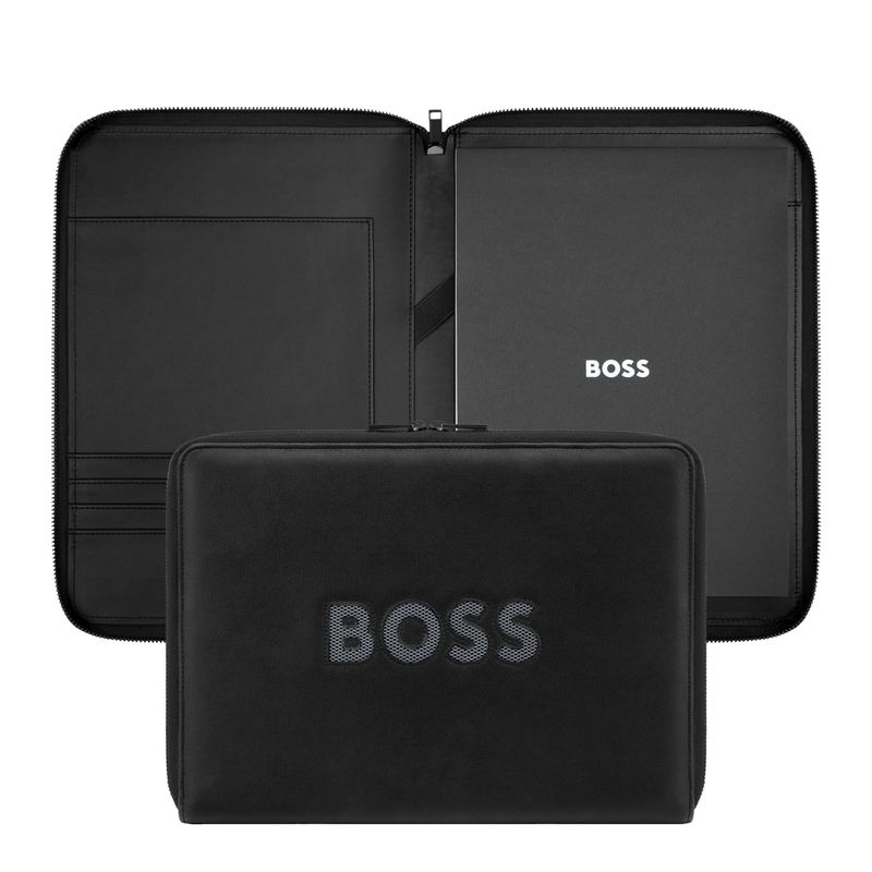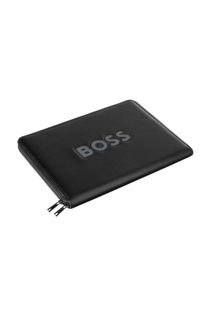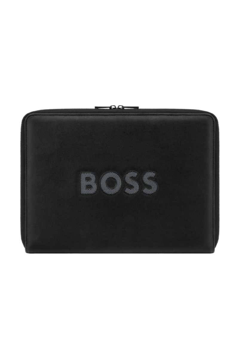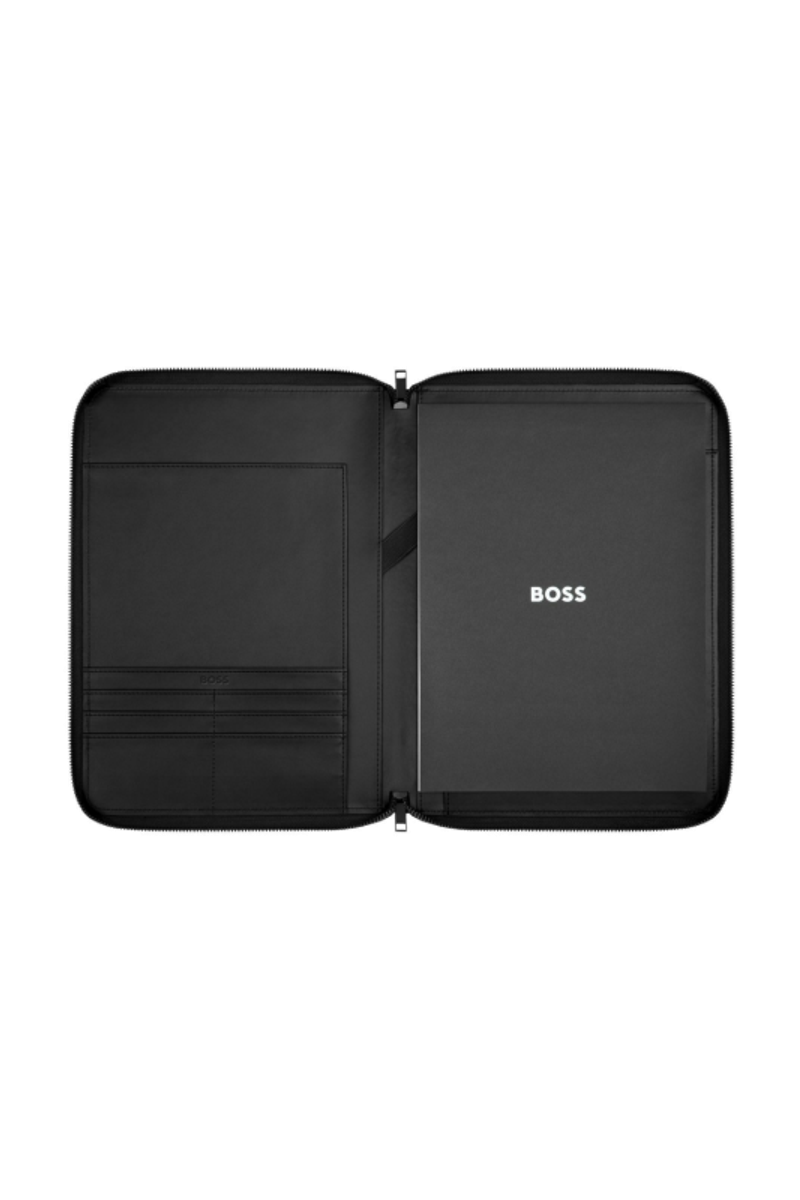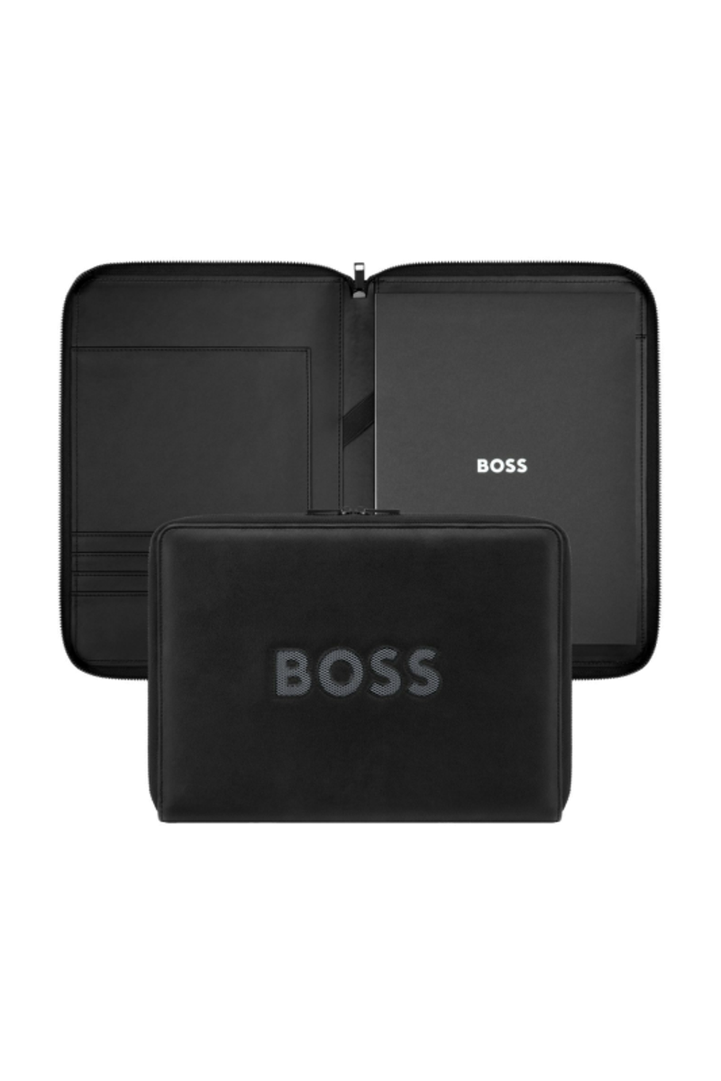 This A4 folder expresses a sharp, modern attitude through a graphic BOSS cut-out logo, revealing a contrast mesh fabric beneath. The oversized logo remains minimal, delivering a strong visual impact with an active, contemporary feel. Crafted in smooth black PU and paired with contrast grey mesh nylon, the design plays on texture and depth for a refined yet technical look. Finished with an exclusive new BOSS zipper puller developed this year and matte black trims, the overall aesthetic feels clean, modern, and confidently urban.