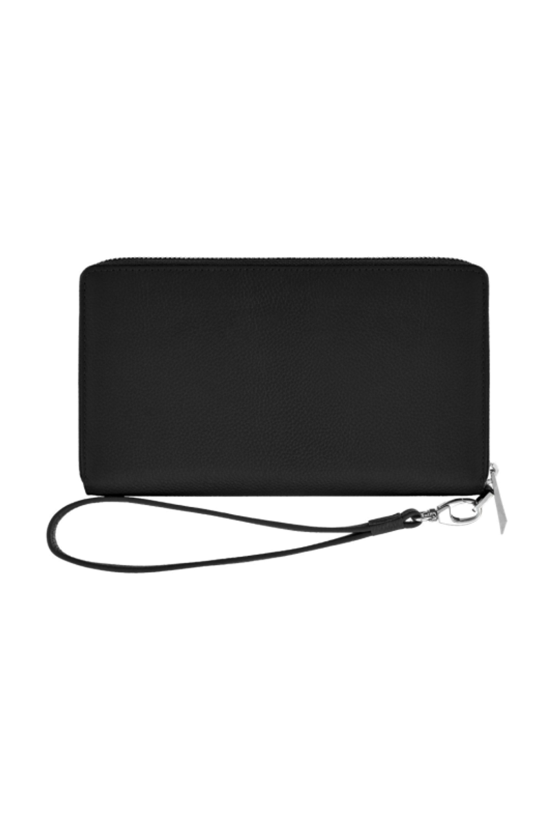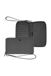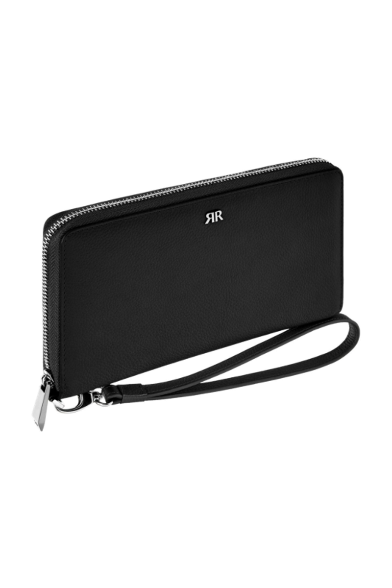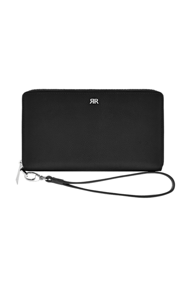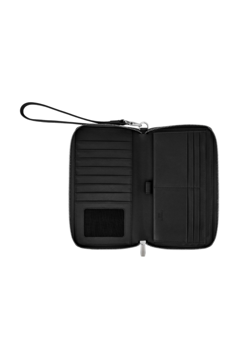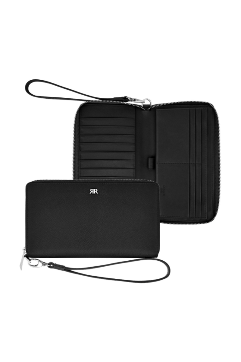 The CERRUTI 1881 Zipped travel wallet is the perfect accessory for travelling and organising all essentials, designed in a generous format and completed with a detachable leather wristlet for added practicality. When opened, it reveals eight card slots on one side and a gusseted compartment on the other, featuring a large zipped pouch, multiple note compartments, and a total of twelve additional card slots, along with a dedicated hook for a pen. Crafted from carefully chosen grained, best-quality leather, it is elevated by refined metal accents: the newly developed angular double R zipper puller brings a luxurious finishing touch, while the double R logo in crisp chrome enhances the classical black version with a timeless, sophisticated contrast.