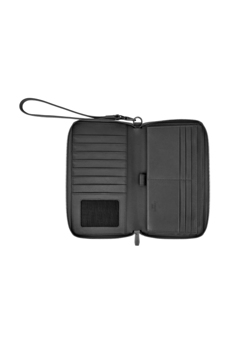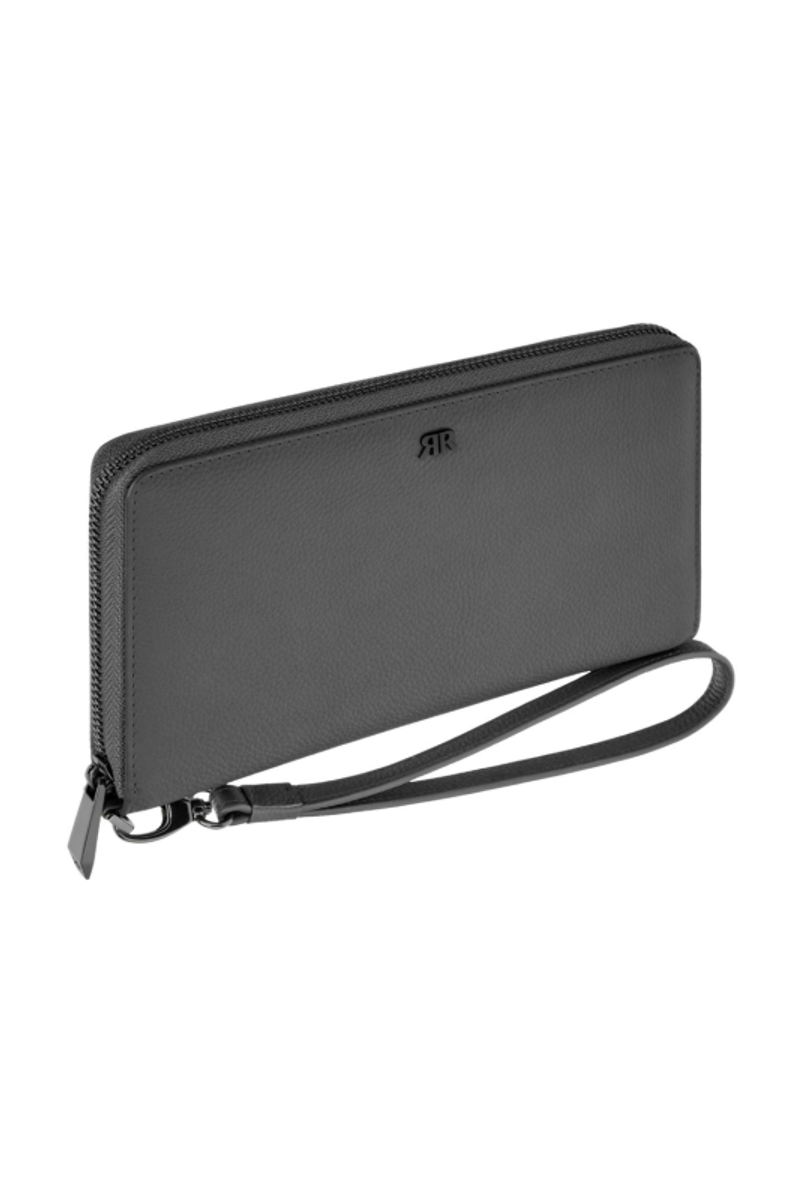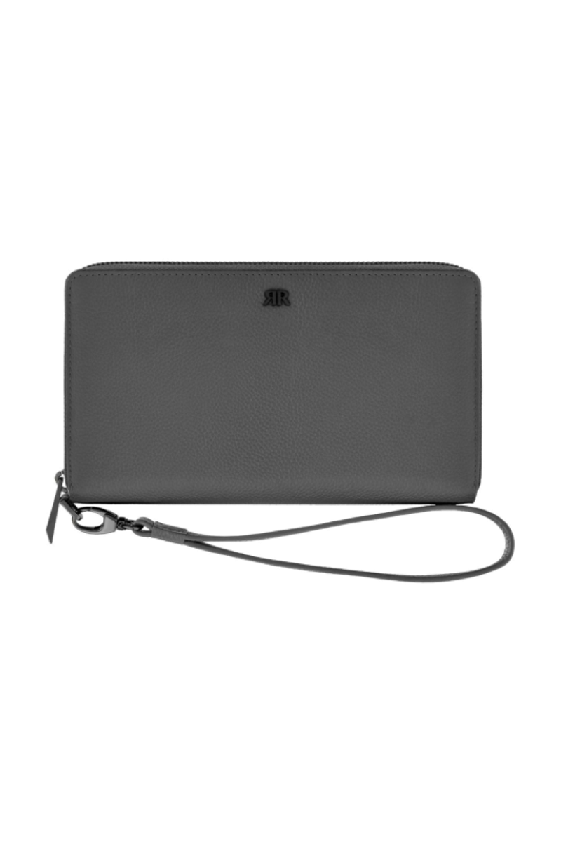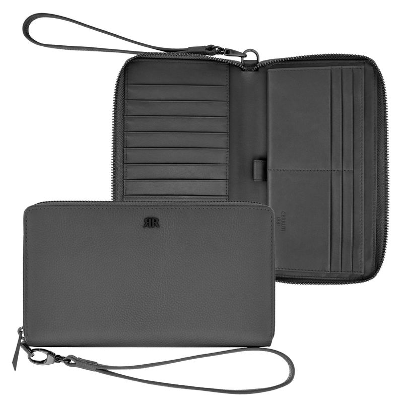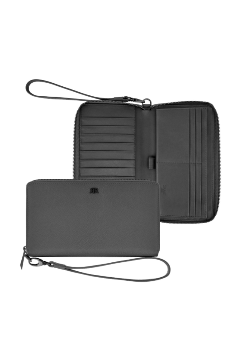 The CERRUTI 1881 Zipped travel wallet offers an ideal balance of capacity and organisation, with a large format complemented by a detachable leather wristlet for ease on the move. Inside, it features eight card slots on one side, and on the other a gusseted compartment housing a large zipped pouch, several note compartments, and twelve additional card slots, completed with a practical pen hook. Crafted in carefully selected grained, best-quality leather, it is defined by its distinctive metal details: the newly developed angular double R zipper puller adds a refined, luxurious note, while the double R logo in gunmetal blends seamlessly with the minimal and elegant grey version for a quietly modern expression.