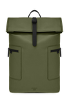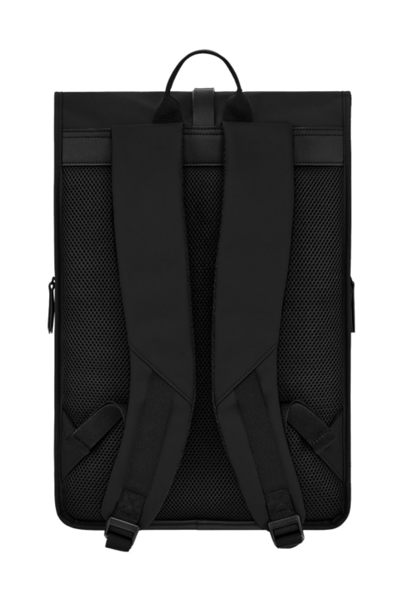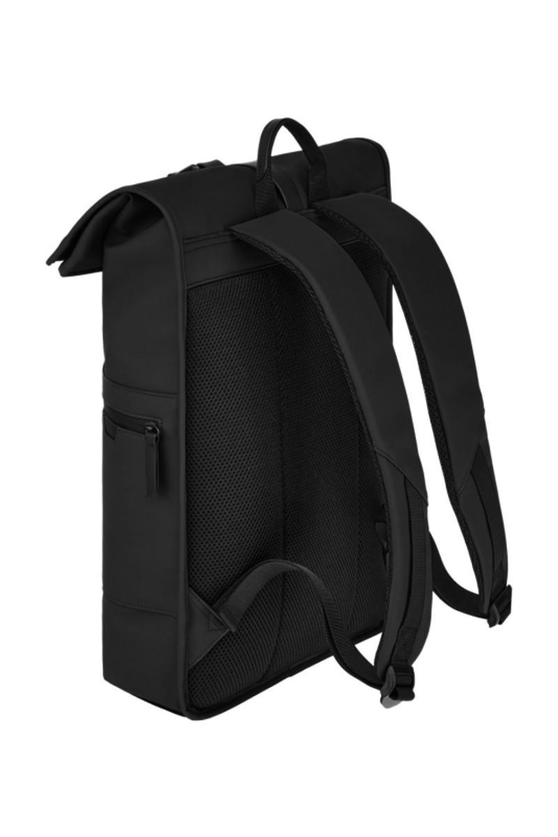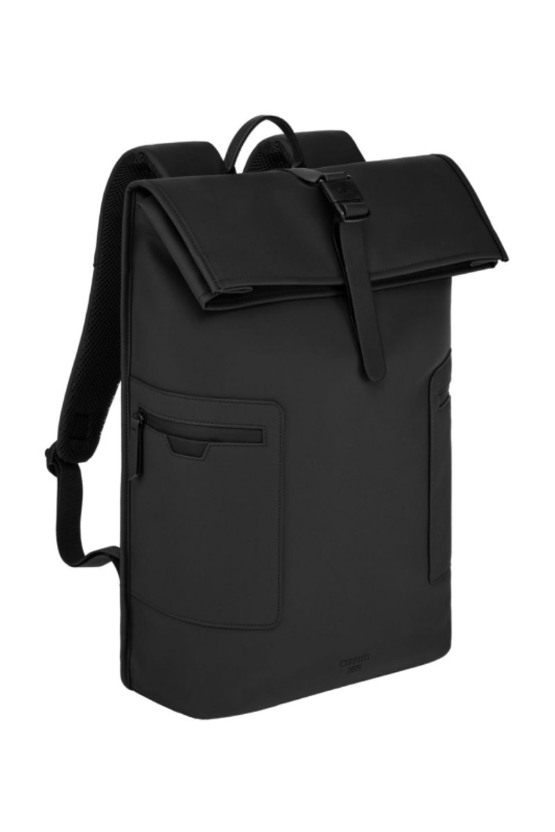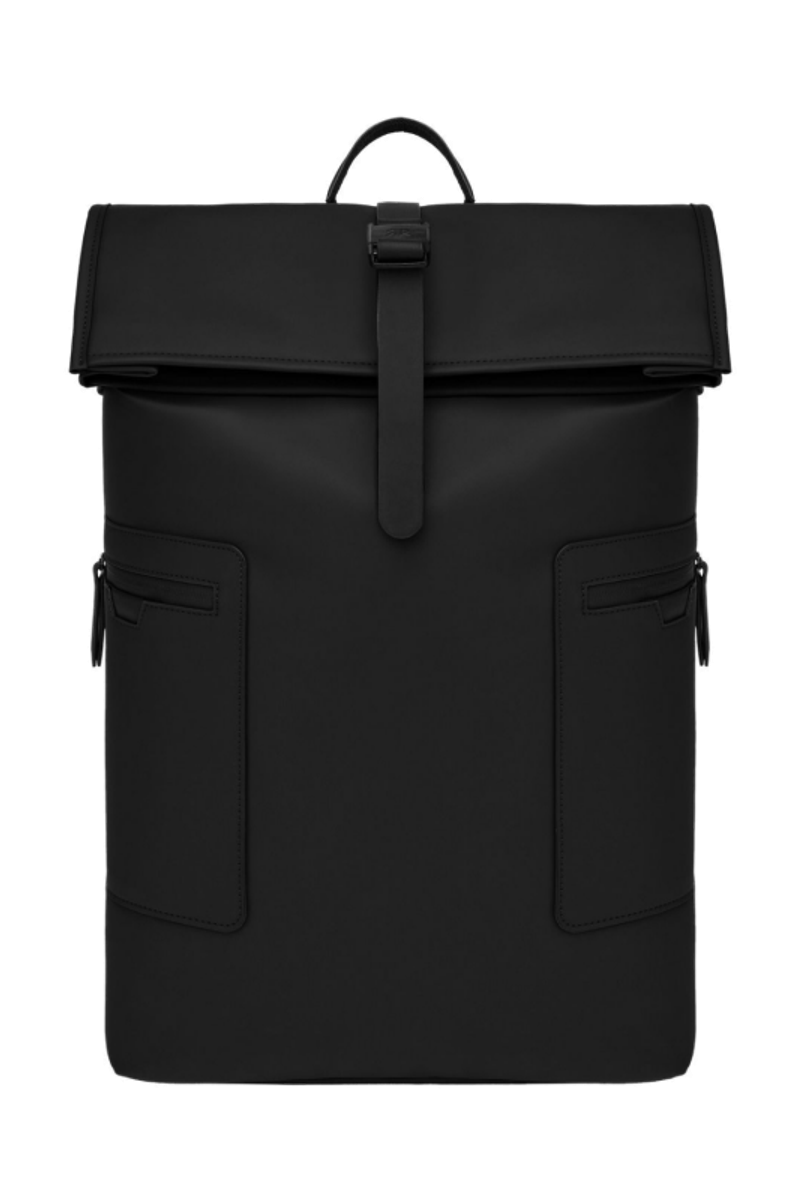 Designed with form as much as function in mind, this casual-inspired rolled-top backpack is expressed in timeless black, paired with elegant black matte details for a clean, minimal attitude. A subtle utilitarian aesthetic is expressed through its rolled-top closing construction, perfectly finished with an integrated magnetic closure engraved with the RR signature. The silhouette is light and roamy, ideal for daily movement. Two flat zipped pockets to the front provide practical organization, while the interior features a dedicated laptop compartment for everyday essentials. A padded back panel and padded shoulder straps ensure lasting comfort in use. Inside, a spacious roamy interior reveals a refined monogram lining, completed with a zipped inner pocket for secure storage. It is the perfect accessory for someone with a minimalist yet casual and modern aesthetic.