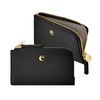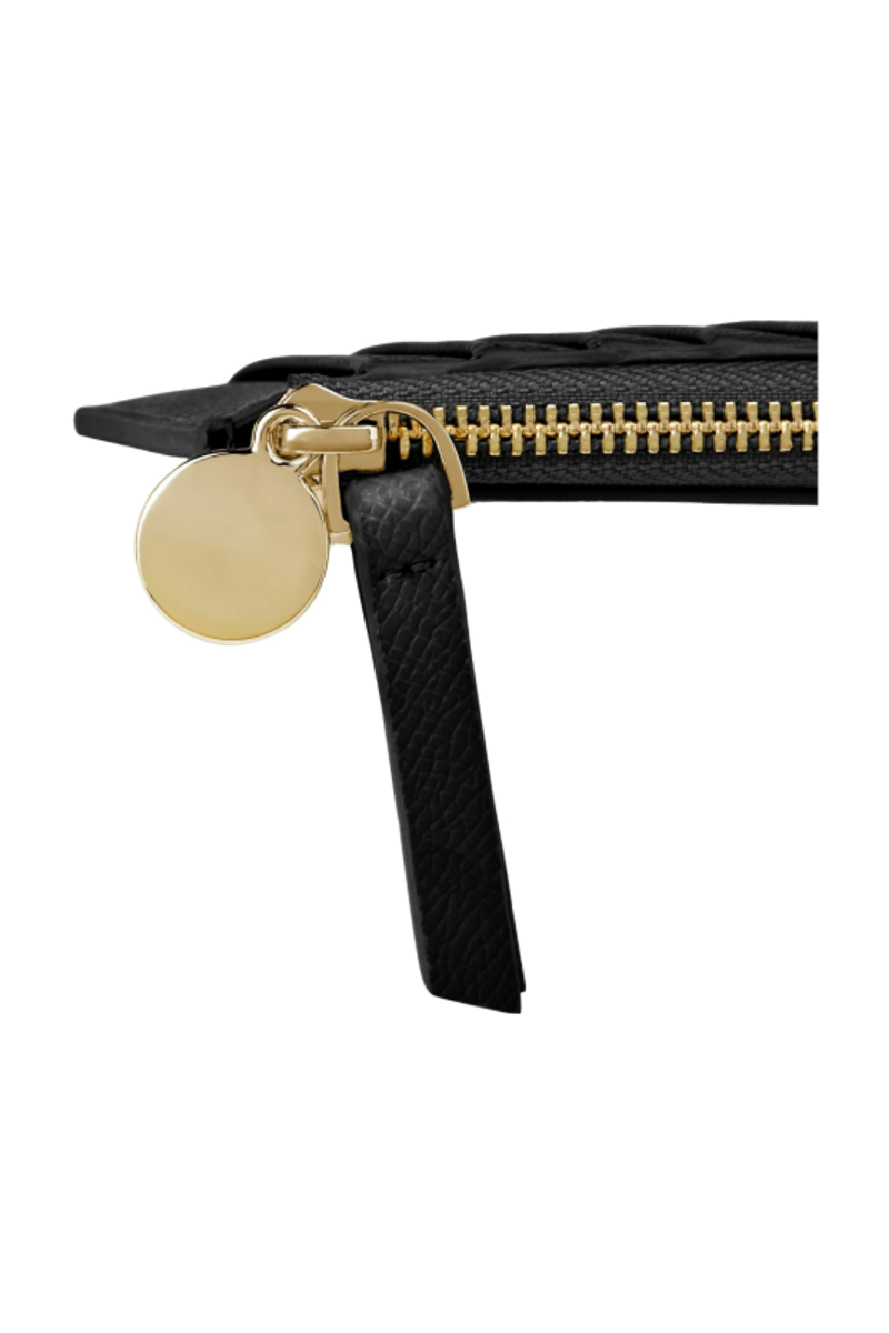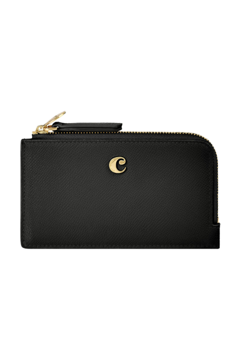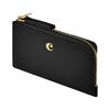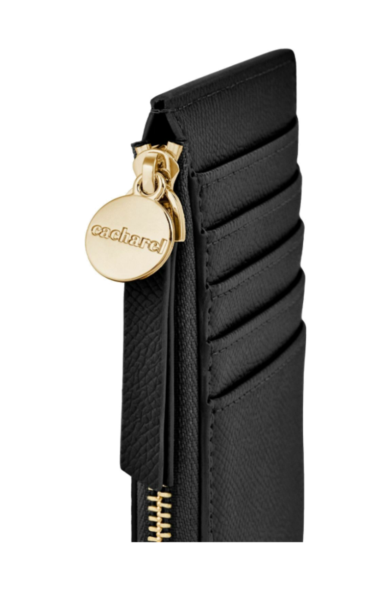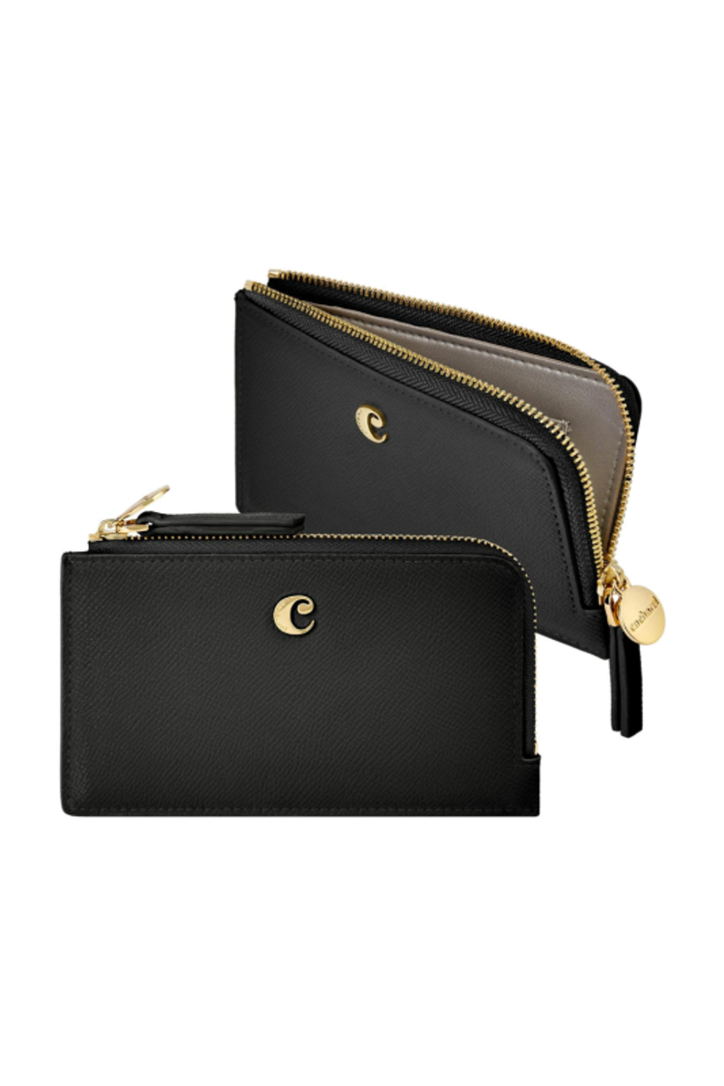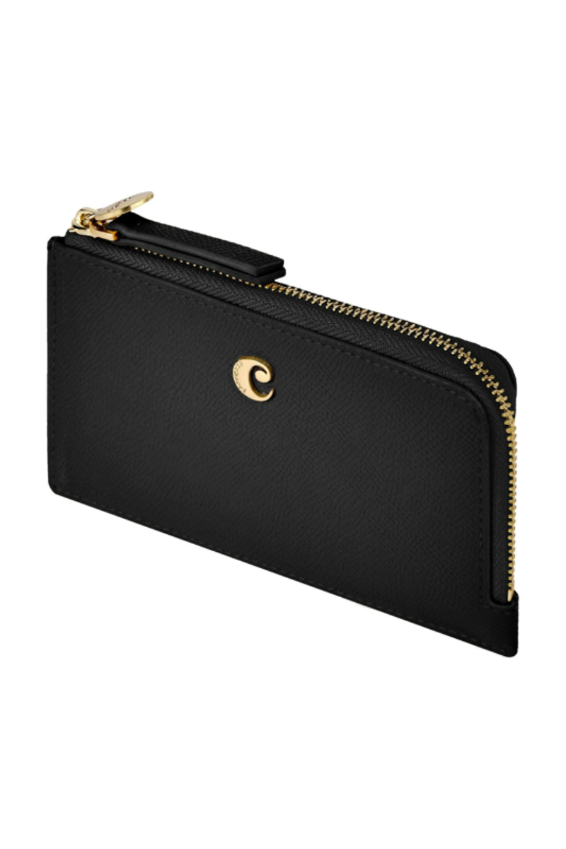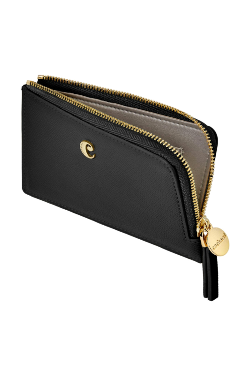 The Seraphine card holder combines practicality with a touch of playful elegance. This long zipped design is crafted from beautiful saffiano-textured vegan leather with a luxurious matte finish. It is signed with a gold-toned C plate on the front and completed by a refined metal plate on the zipper puller. Its spacious main compartment allows for easy organization, complemented by one inner card slot and five additional card slots on the back. A functional yet stylish everyday essential. This black version features a contrastive Taupe lining adding a touch of playfulness to this accessory.