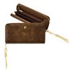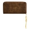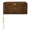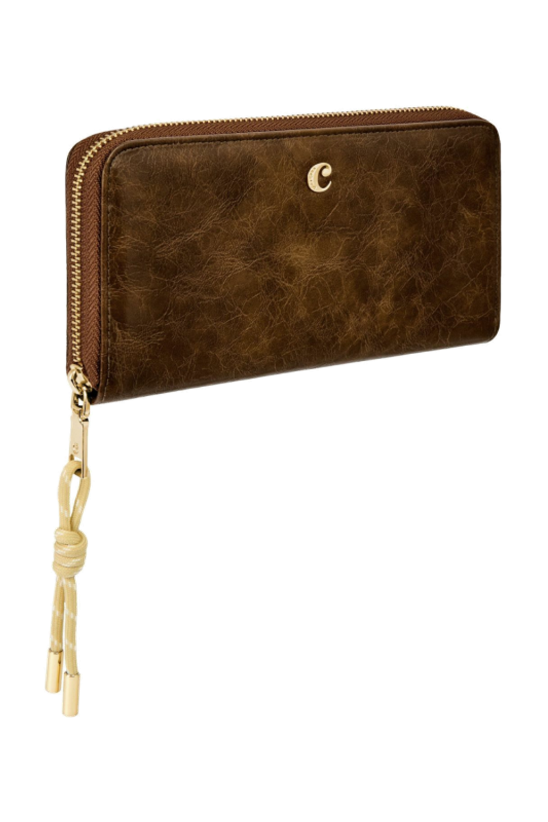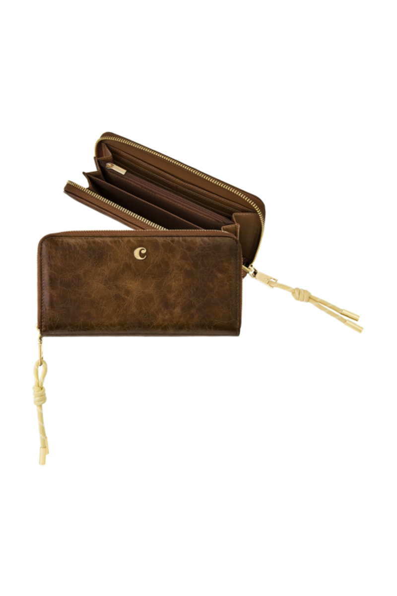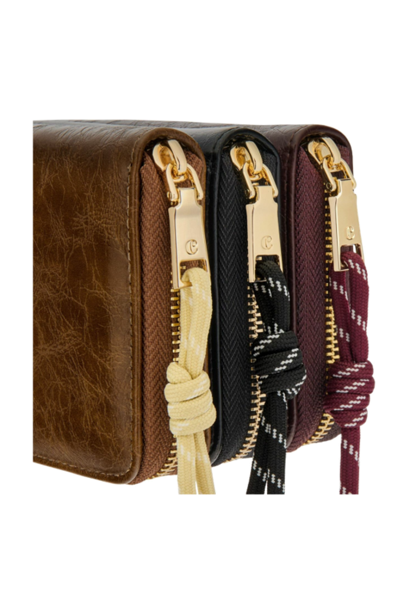 The Philomene zipped wallet combines elegance with a strong fashion-forward edge. Crafted from a glazed, crinkled leather-like texture, it is signed with the signature Cacharel C plate and highlighted by refined gold trims. Its distinctive zipper puller features a utility-inspired cord element that contrasts beautifully with the wallet’s chic and sophisticated finish. Inside its zipped interior, the wallet offers generous organization with a large zipped coin compartment, twelve card slots, and two note compartments, ensuring both style and practicality. Available in a chic palette of black, camel, and burgundy.