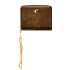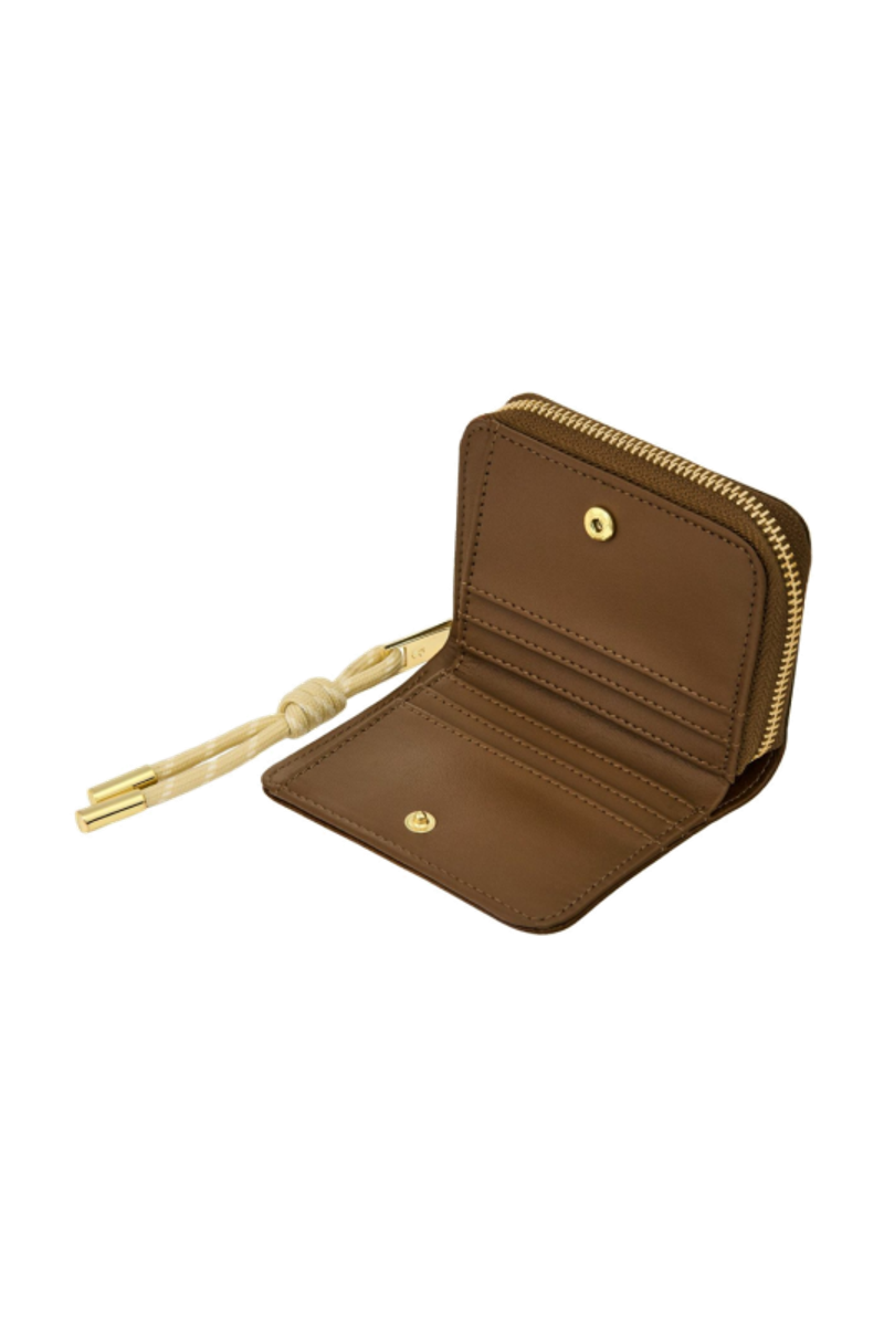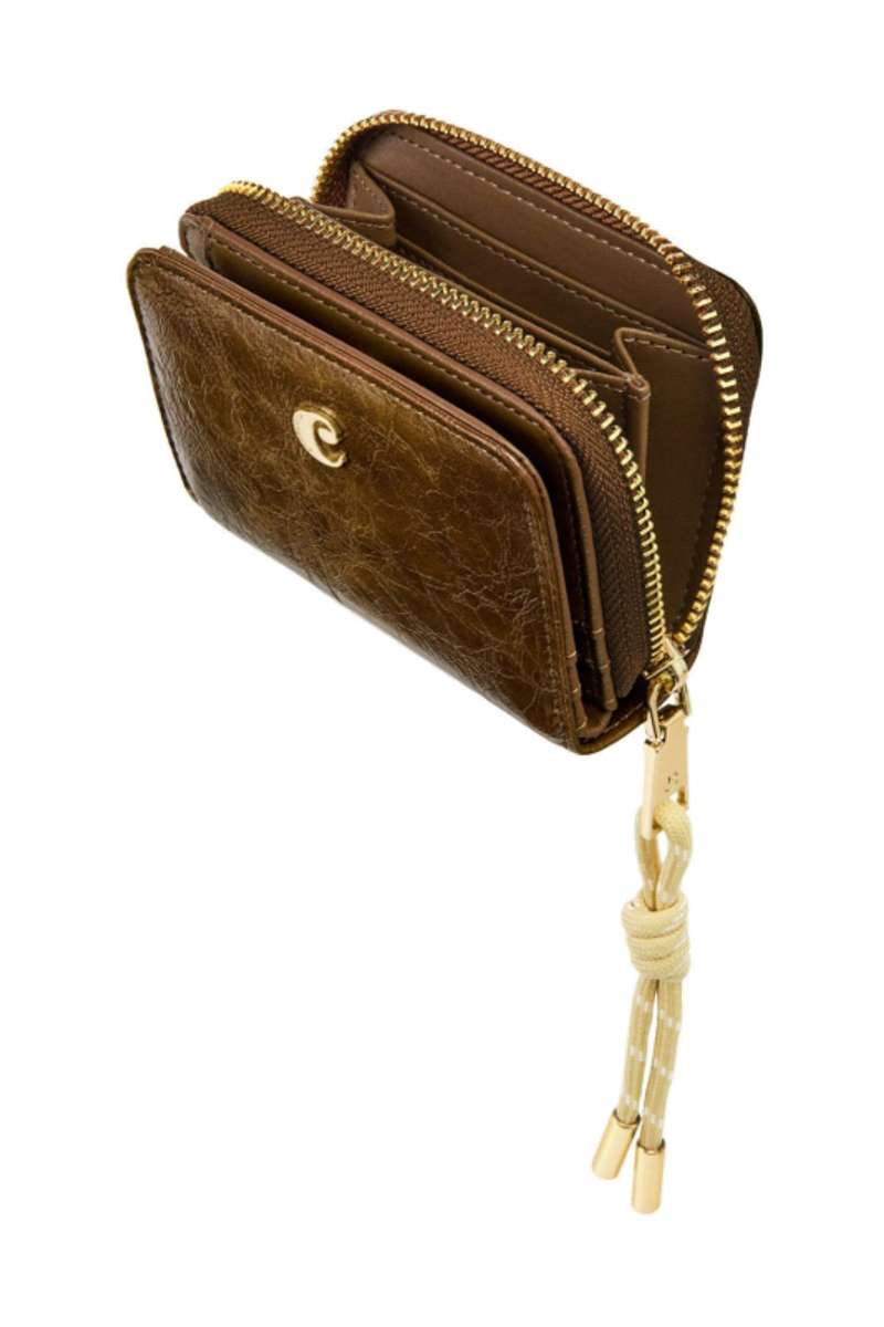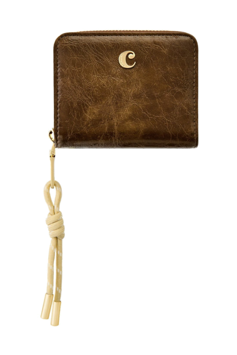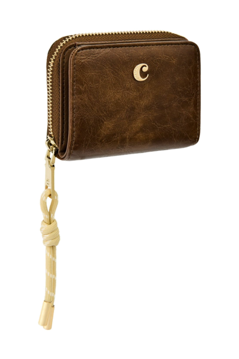 The Philomene flap wallet stands out with its modern, fashion-forward attitude. Crafted from a glazed, crinkled leather-like texture, it combines bold character with refined detailing. The design is signed with the signature Cacharel C plate and elevated by elegant gold trims. A distinctive utility-inspired cord element on the zipper puller adds a contemporary contrast to the wallet’s sophisticated finish. Inside, two main compartments offer smart organization: a zipped section with four card slots and a coin pocket, and a flap section featuring a note compartment and six additional card slots. Available in a chic palette of black, camel, and burgundy.