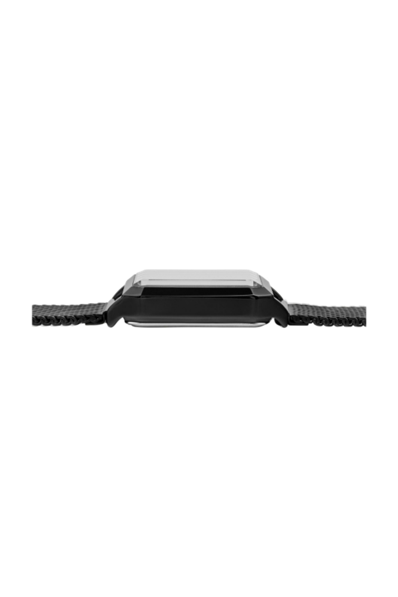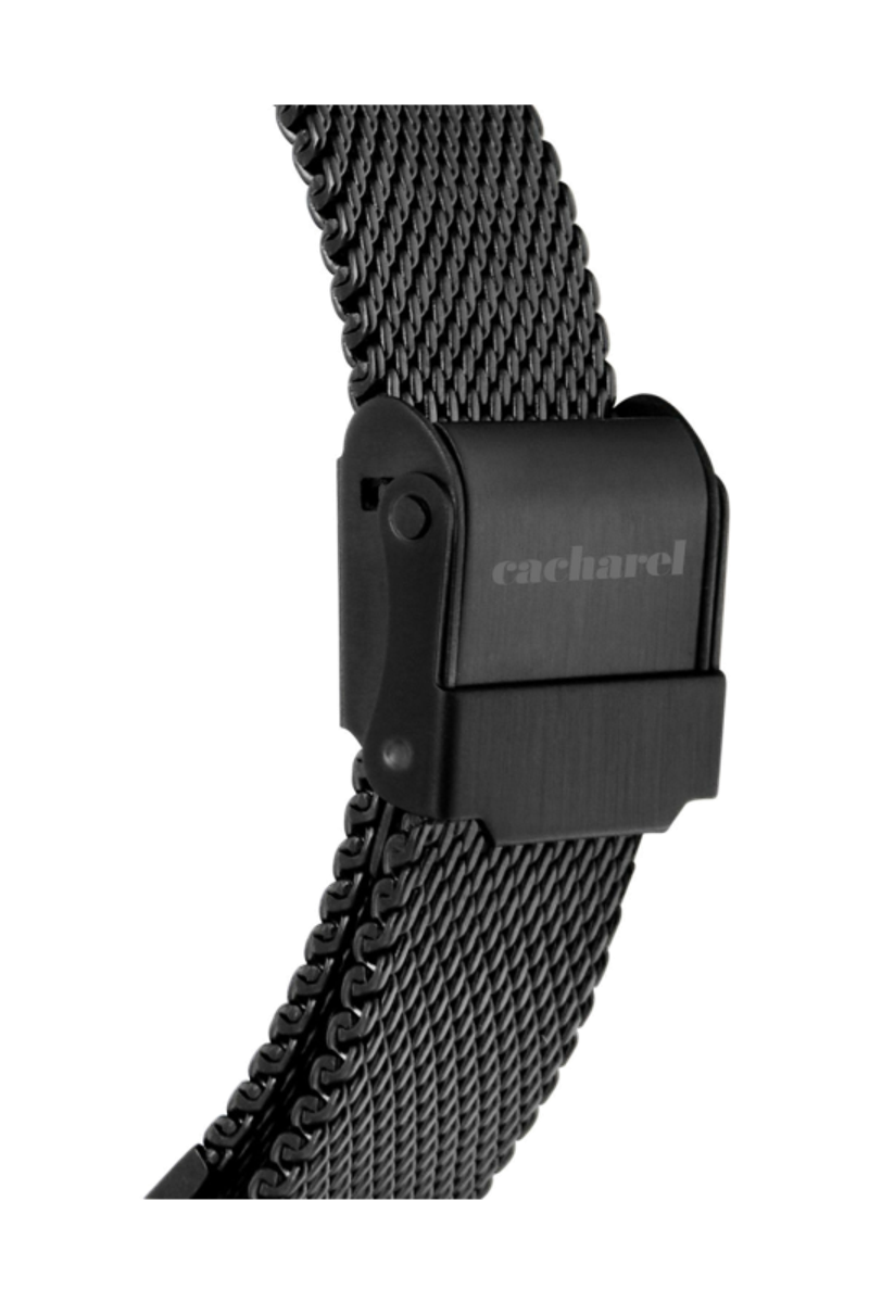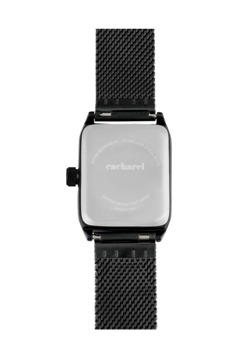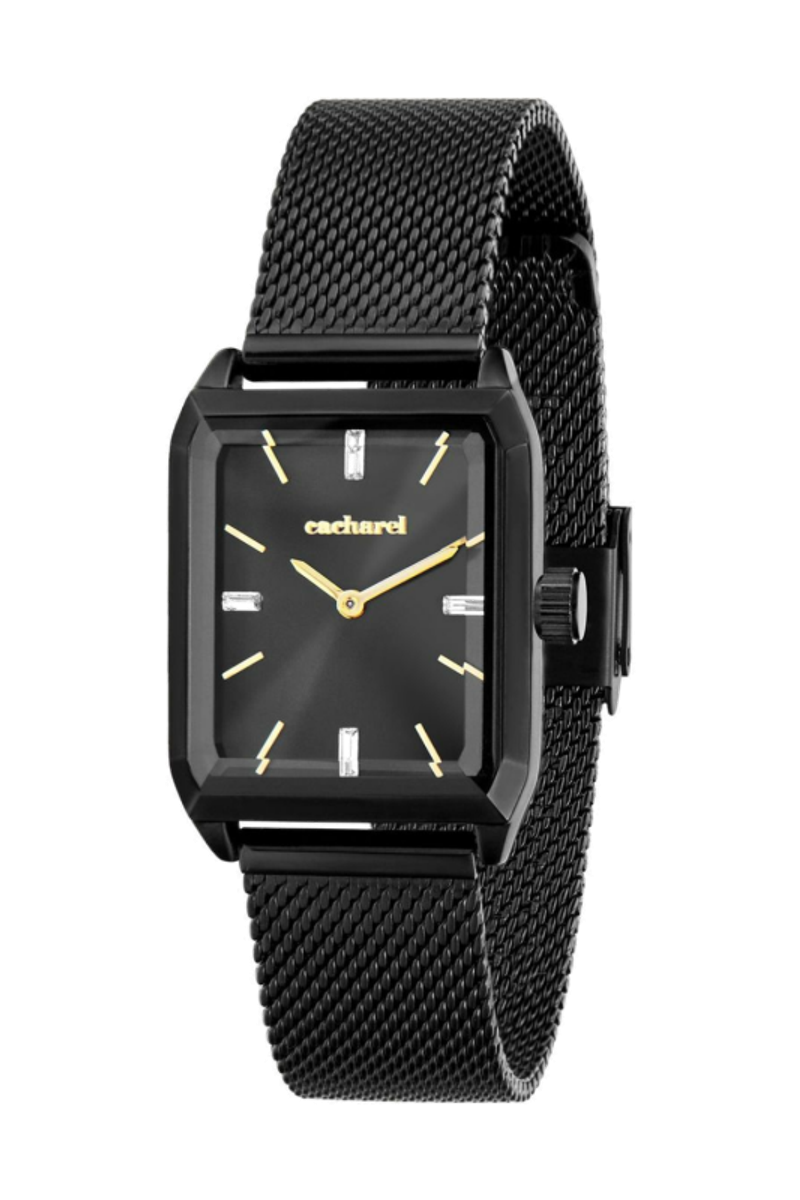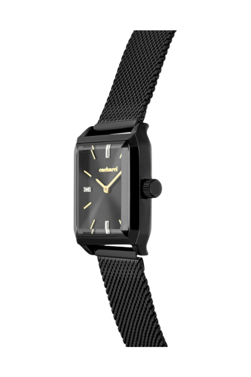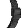The Philomène watch in full black pairs a sleek Milanese mesh bracelet with an elegant sunray-finished dial highlighted by refined gold details. A small crystal element adds a subtle spark, standing out beautifully against the deep black palette. Modern, minimal and quietly striking, it offers a sophisticated statement through its interplay of black and gold.