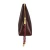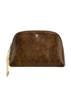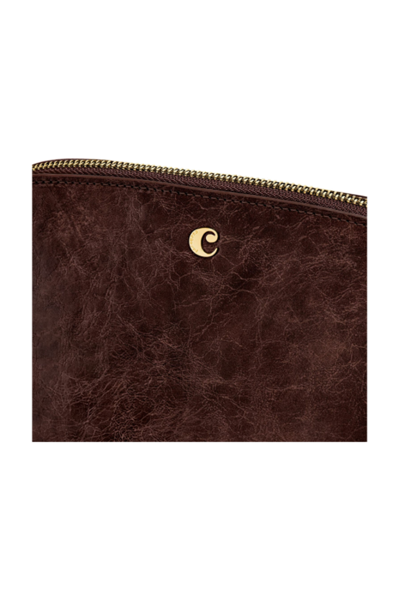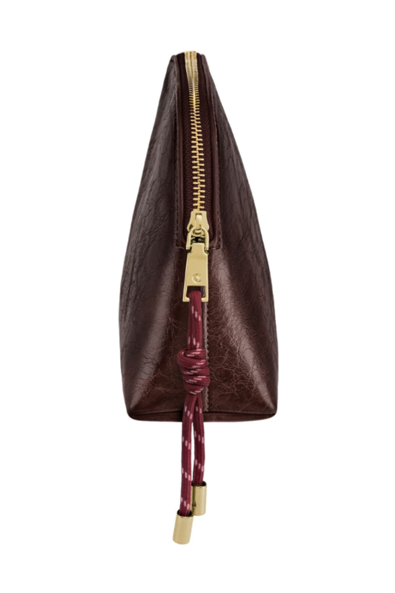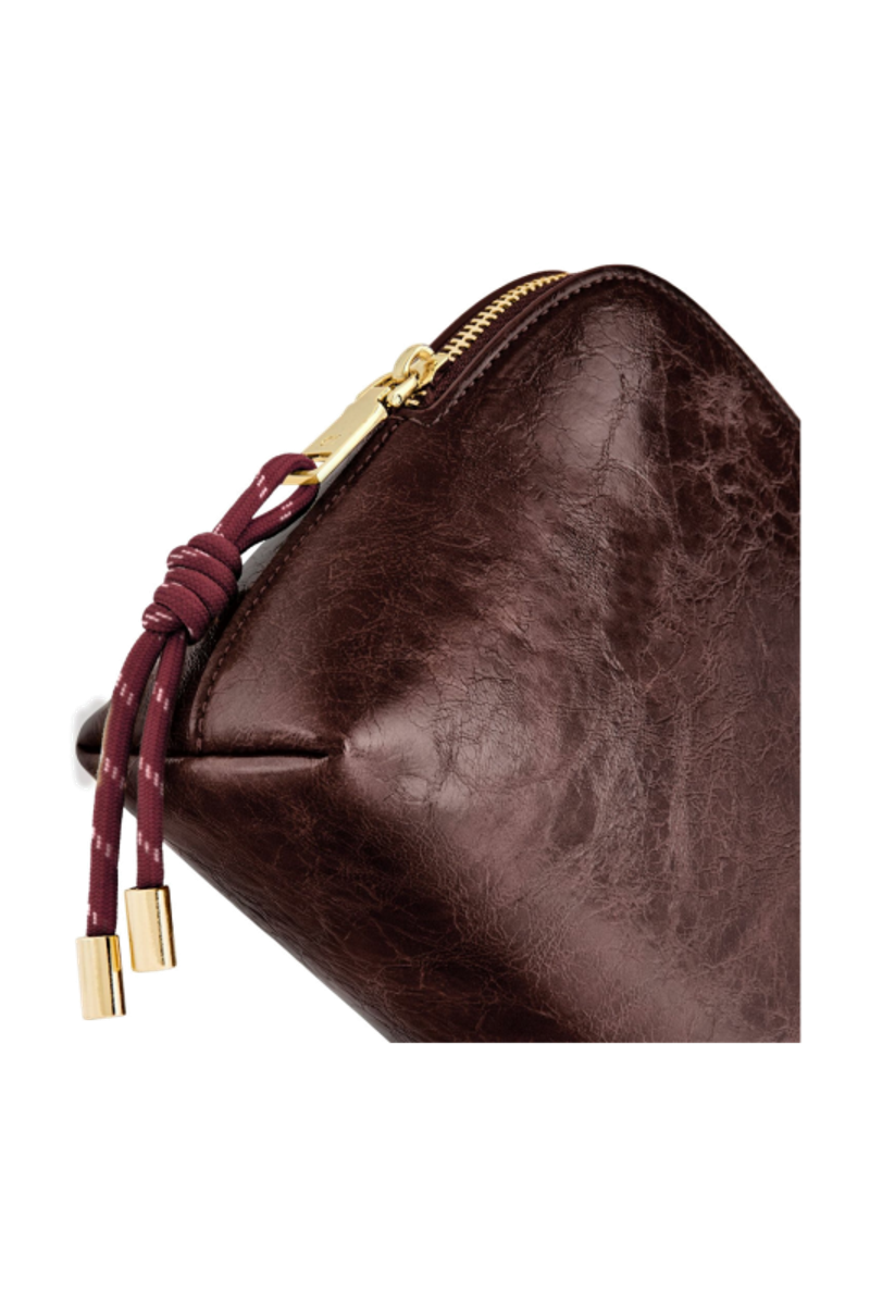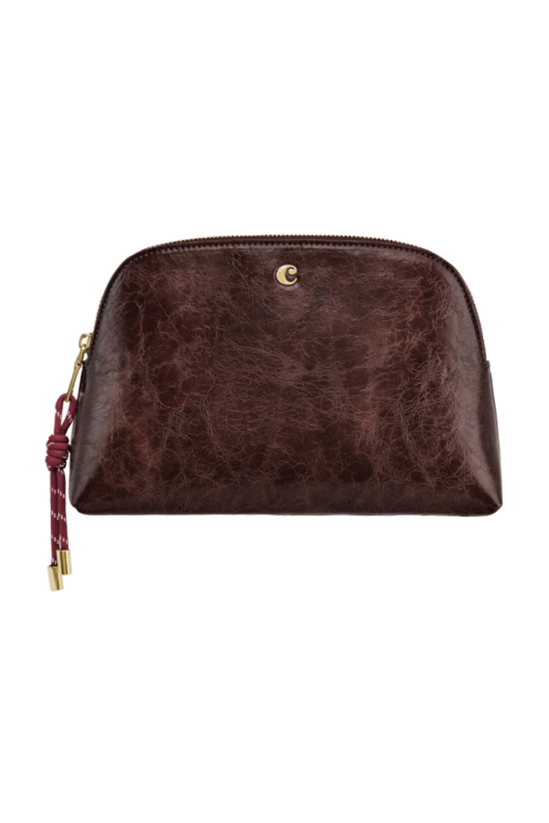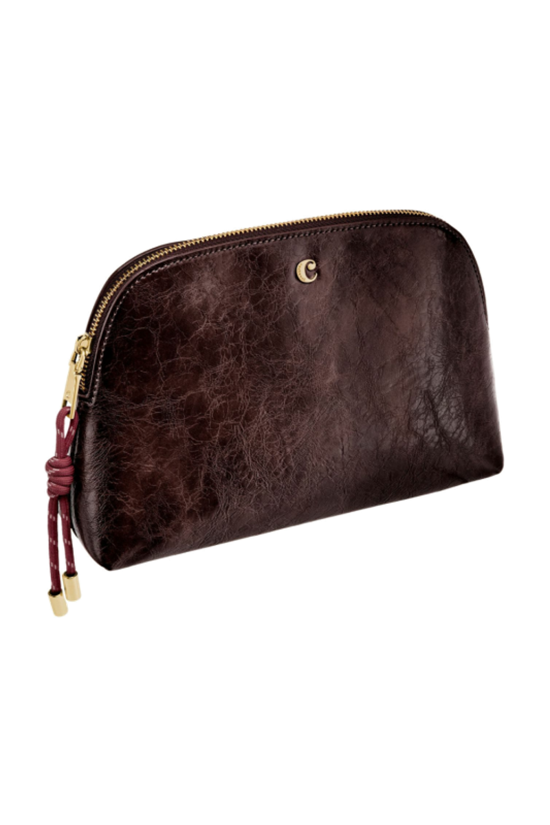 The Philomene cosmetic pouch combines elegance with a bold, contemporary attitude. Crafted from a glazed, crinkled leather-like texture, it is signed with the signature Cacharel C plate and refined gold trims, creating a look that feels both modern and sophisticated. Its roomy shape allows for generous storage, making it ideal for carrying a wide selection of beauty or travel essentials. The design is completed with a distinctive cord zipper puller for a fashion-forward touch and a small Cacharel PU tag inside as a subtle signature detail. Available in black, camel, and burgundy.