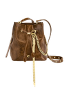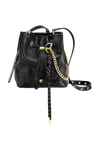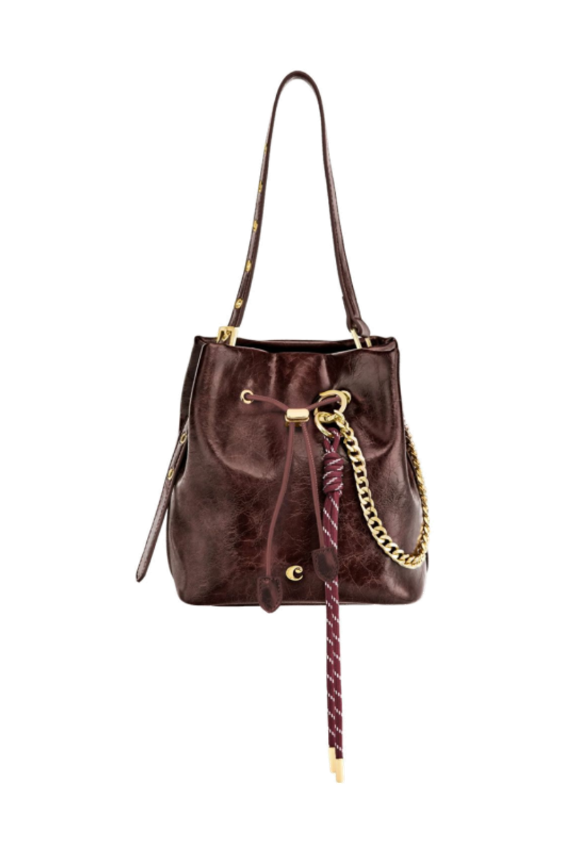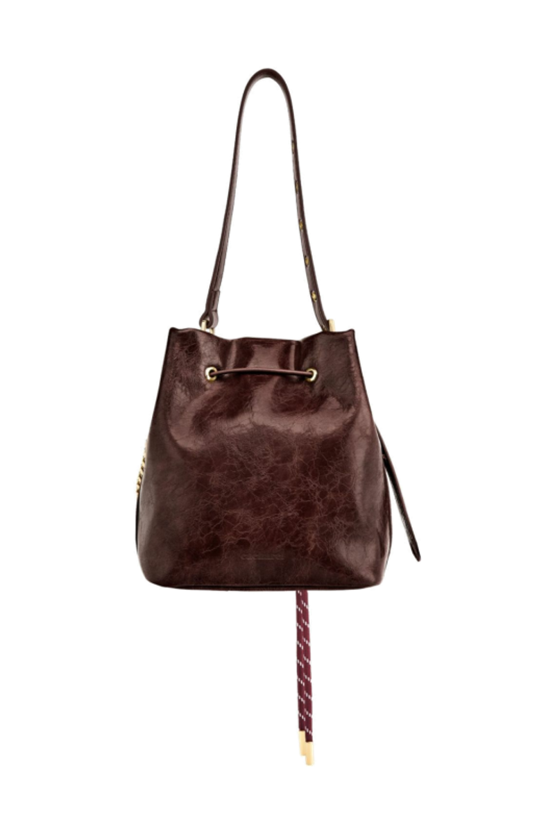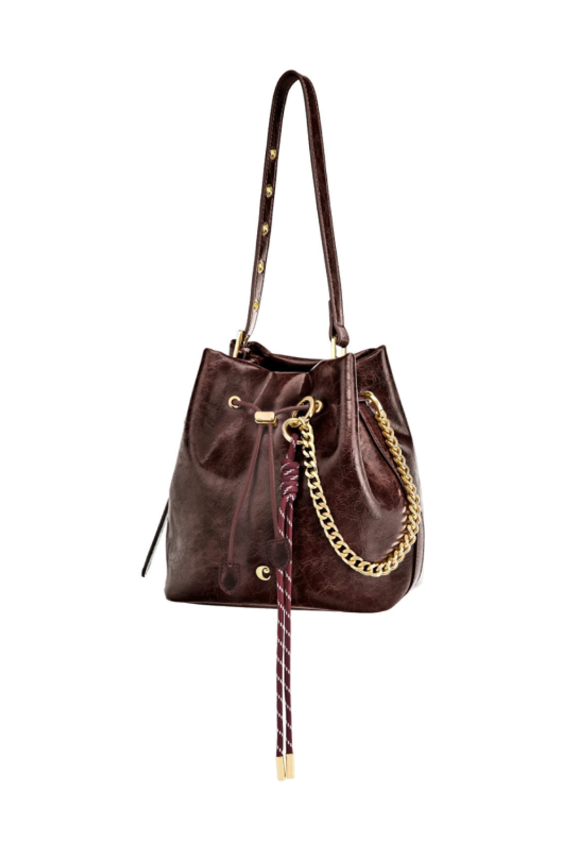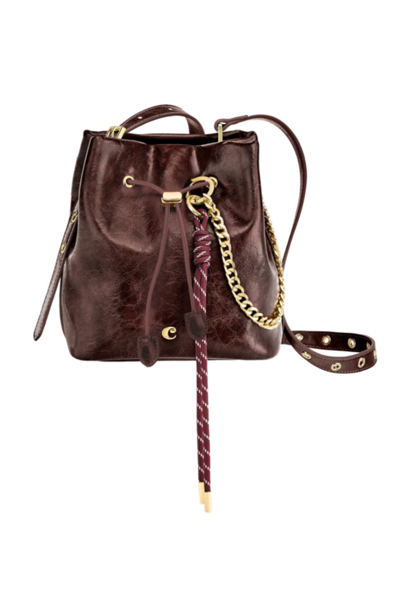 The Philomene bucket bag blends timeless elegance with a bold, fashion-forward attitude. Crafted from a glazed, crinkled leather-like texture, it is signed with the signature Cacharel C plate, enhanced by refined gold trims, and finished with a discreet embossed Cacharel logo. The material is soft, supple, and remarkably luxurious to the touch. Its adjustable strap allows for both hand and shoulder carrying, while an additional strap transforms it into a crossbody bag. A PU cord closure reinforces its pouch-like shape, and a removable decorative cord-and-chain charm adds a distinctive, stylish accent. Compact yet spacious, its interior offers ample room for essentials and includes a zipped pocket for added convenience. Available in black, burgundy, and camel.