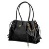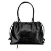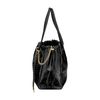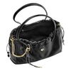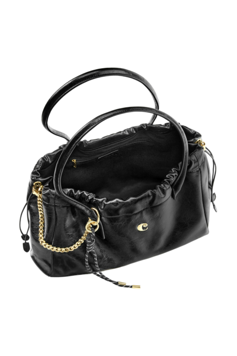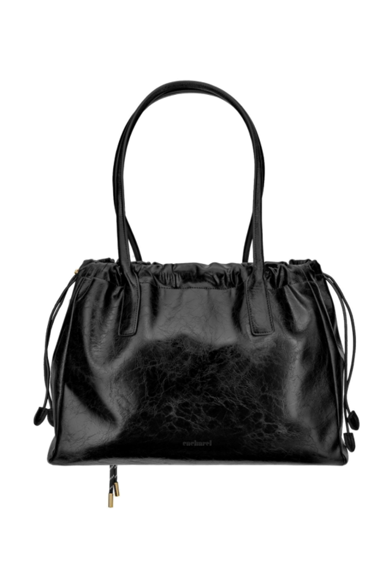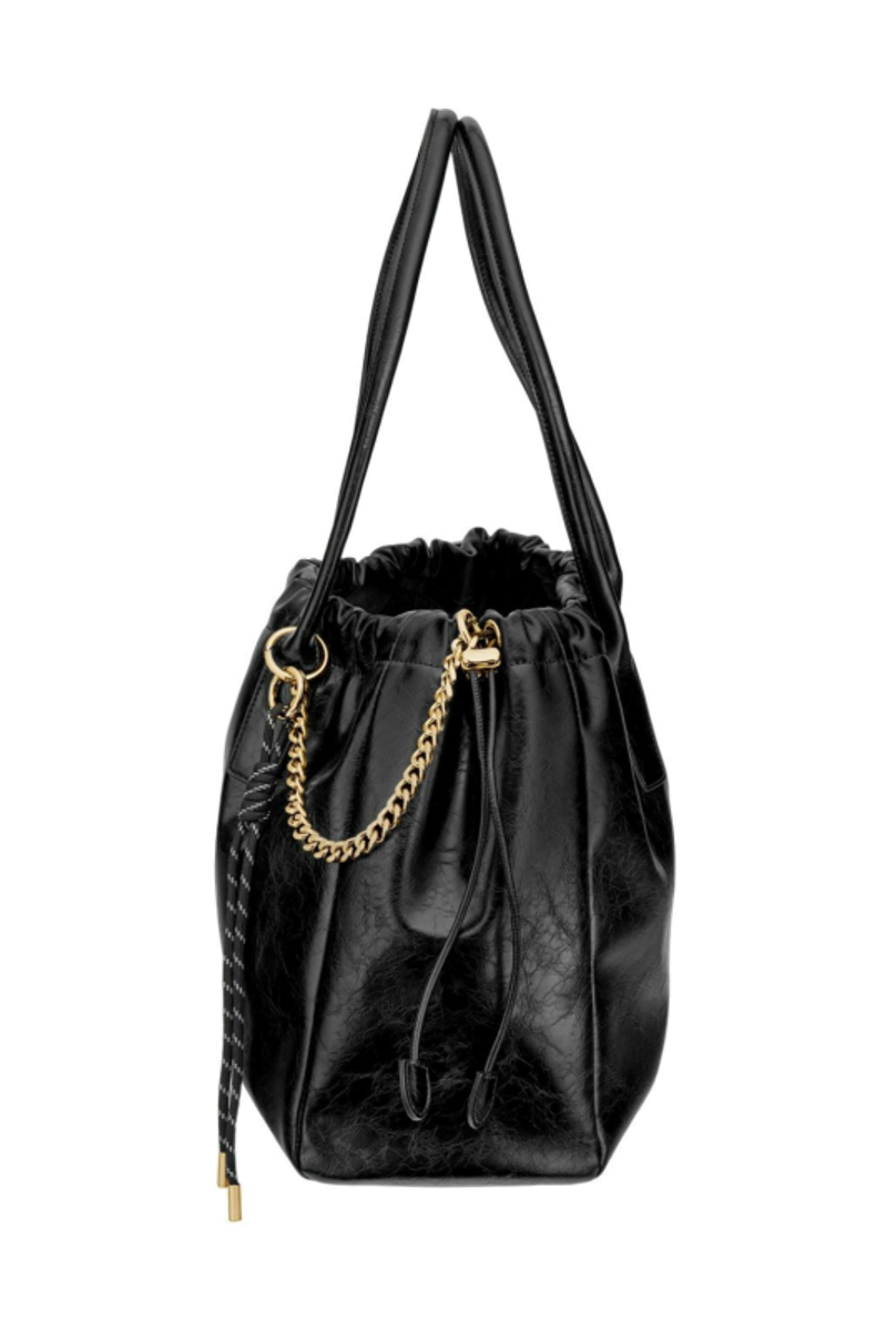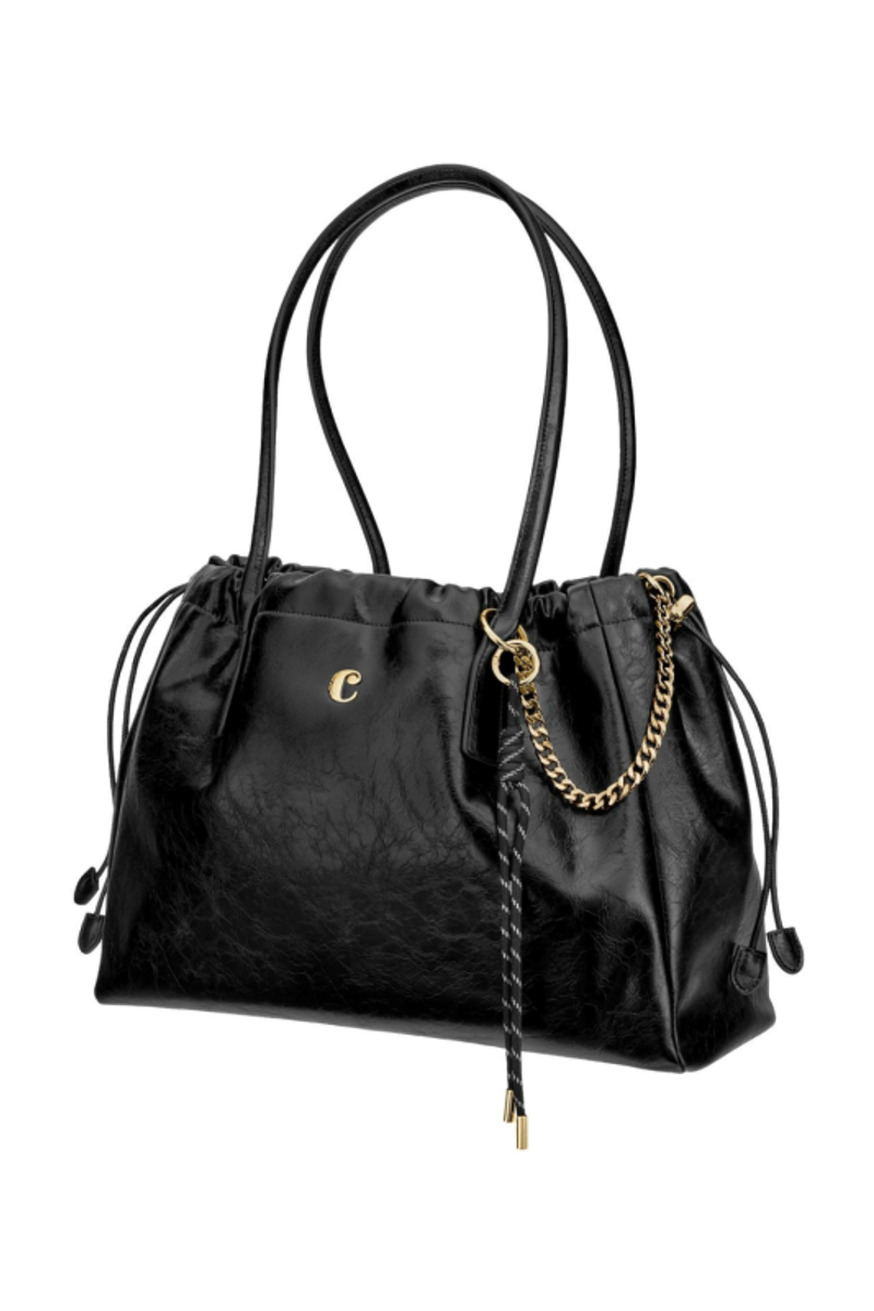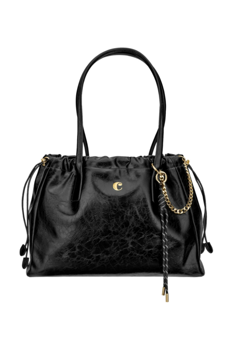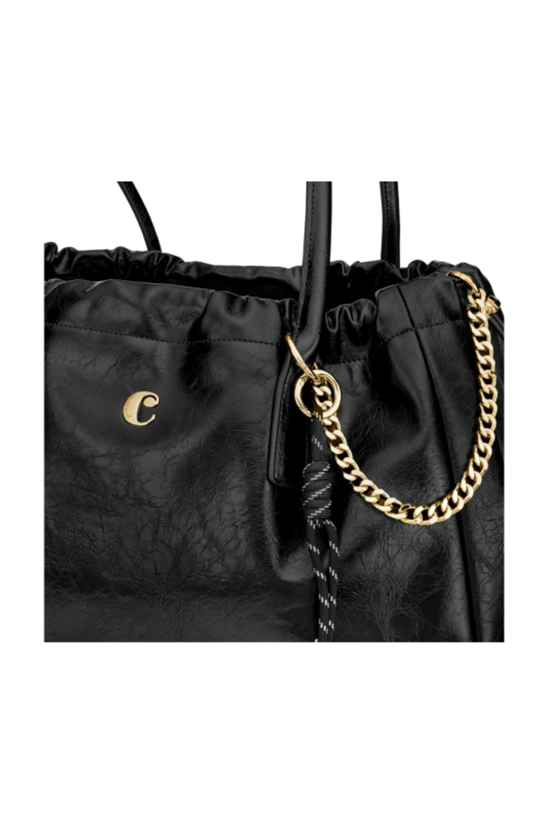 The Philomene tote bag embodies refined sophistication with a confident, fashion-forward edge. Made from a glazed, crinkled leather-like texture, it is signed with the signature Cacharel C plate, enhanced by elegant gold trims, and subtly embossed with the Cacharel logo. The material is soft, supple, and exudes a sense of luxury. Designed in a generous format, the tote offers a spacious and well-structured interior, ideal for everyday organization. It features a PU cord detail around the opening, giving it a modern pouch-like silhouette, and is adorned with a removable decorative cord-and-chain charm that adds a distinctive touch of style.It also features push closing that allow to thigten the closing. The perfect chic and feminine work bag, combining practicality and elegance in equal measure. Available in black