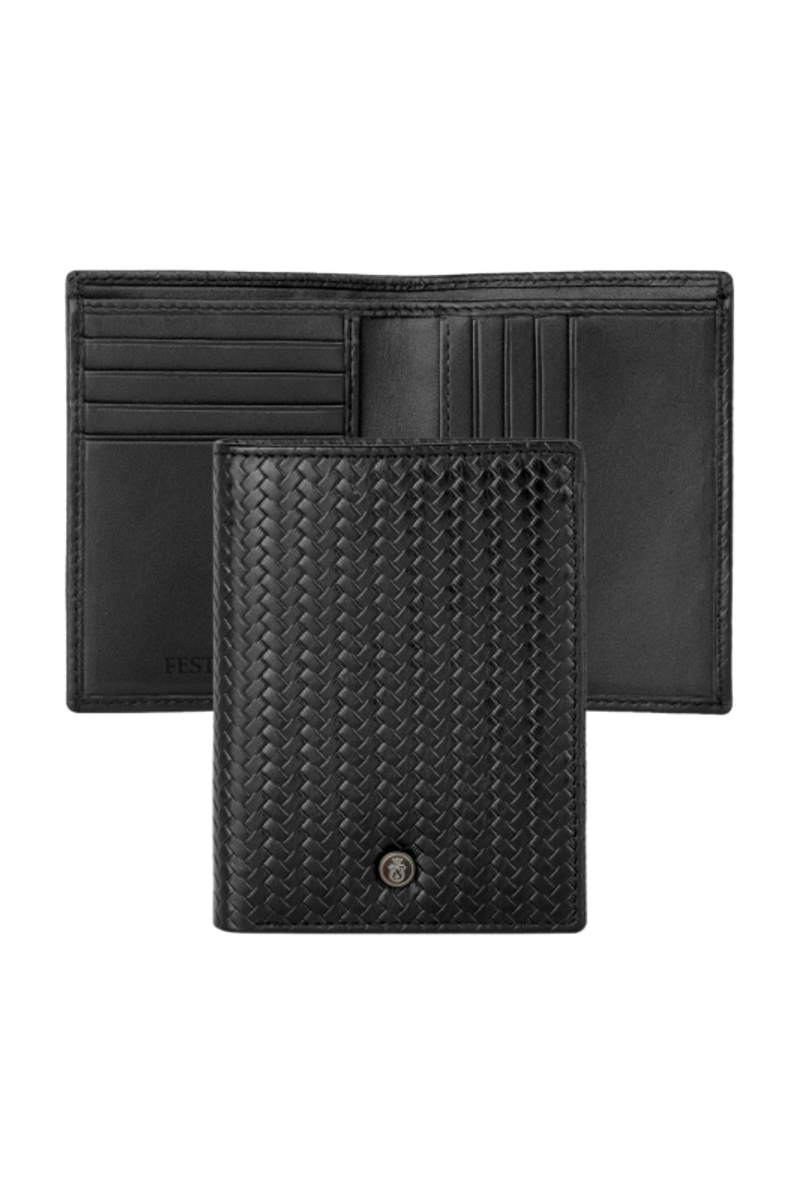 The Interlace vertical folded card holder is crafted from selected leather and defined by an imprinted braided woven pattern that brings a luxe, effortlessly chic touch to its clean, minimal silhouette. A single button engraved with the brand’s blazon discreetly elevates the design, echoing the signature pattern also featured on selected pens for an elegant gift-set pairing. Inside, refined organization includes a note compartment divided in two, five card slots, a vertical slot on the left, and five additional vertical slots on the right, all complemented by a luxurious yet understated embossed Festina logo that adds a final touch of sophistication.