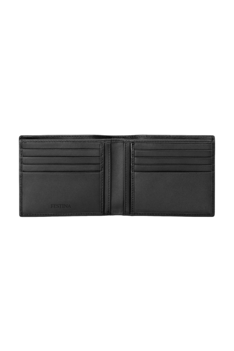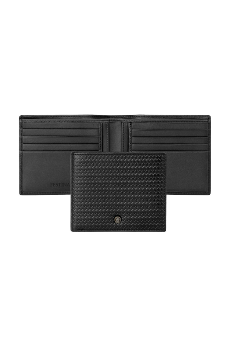 The Interlace classical card wallet is crafted from selected leather and distinguished by an imprinted braided woven pattern that delivers a luxe, effortlessly chic aesthetic. Its clean, minimal silhouette is subtly elevated by a single button engraved with the brand’s blazon, echoing the same refined pattern found on selected pens for an elegant gift-set pairing. Inside, a luxurious yet understated embossed Festina logo enhances its sophisticated appeal, while thoughtful organization includes a banknote compartment divided in two, four regular card slots on each side, and two larger vertical sliding compartments for added practicality.
