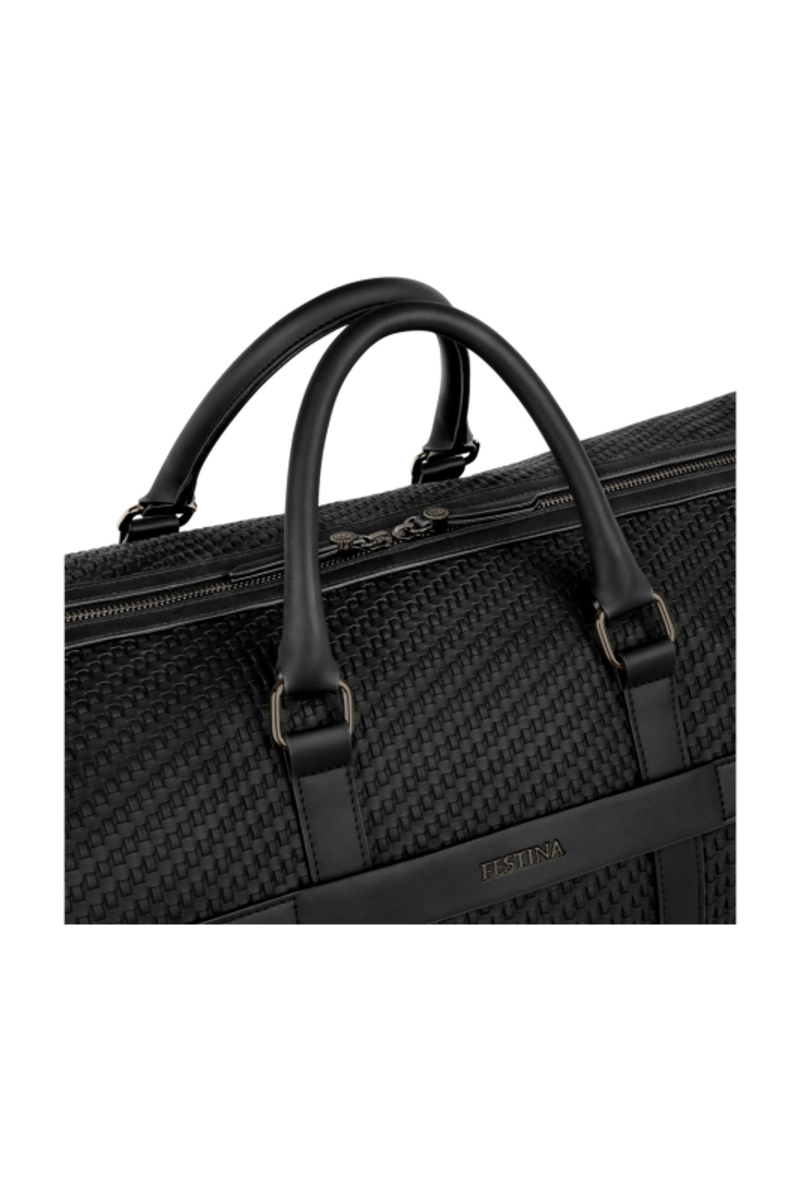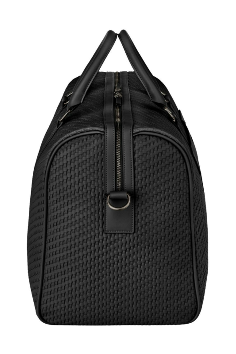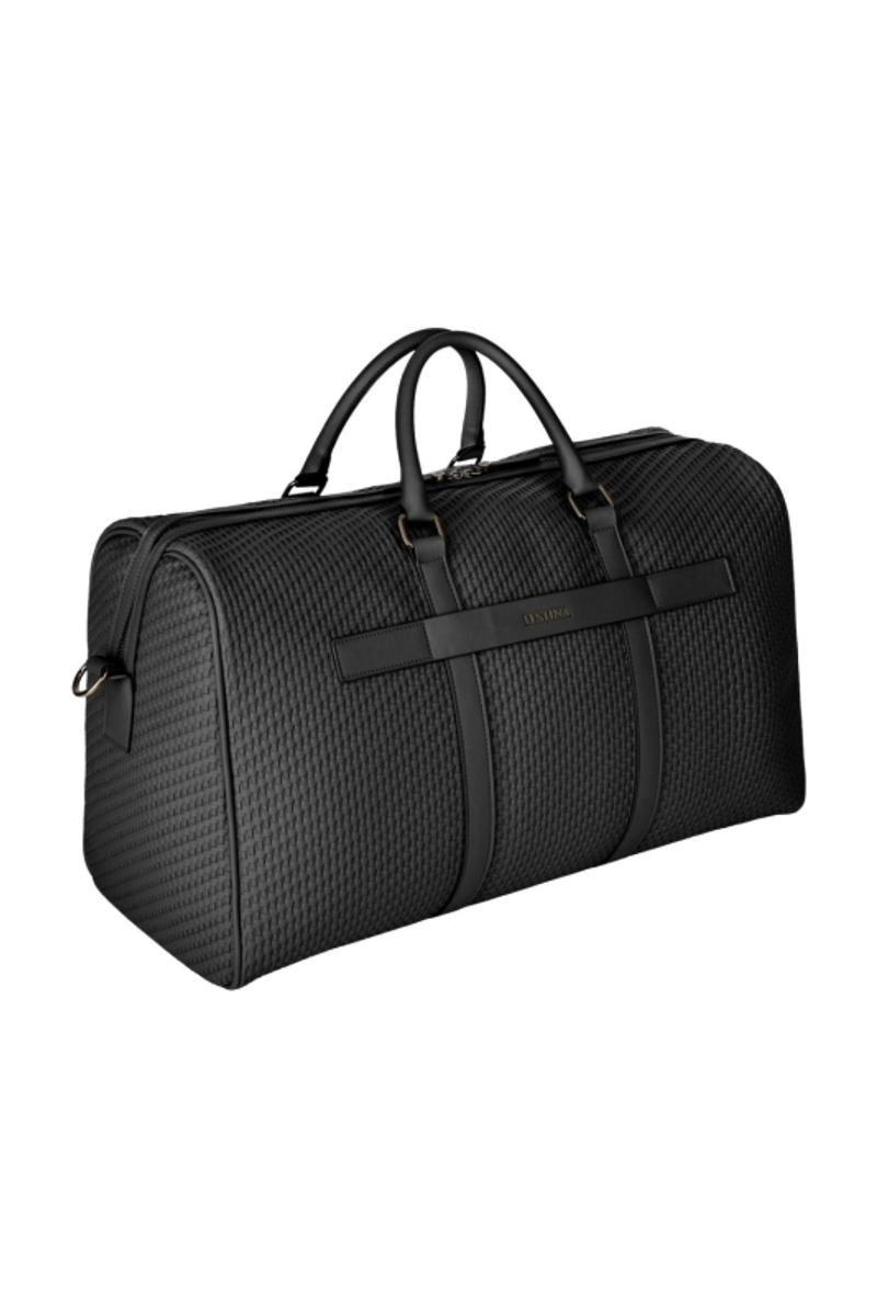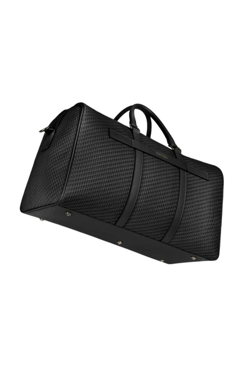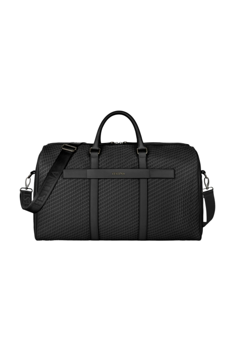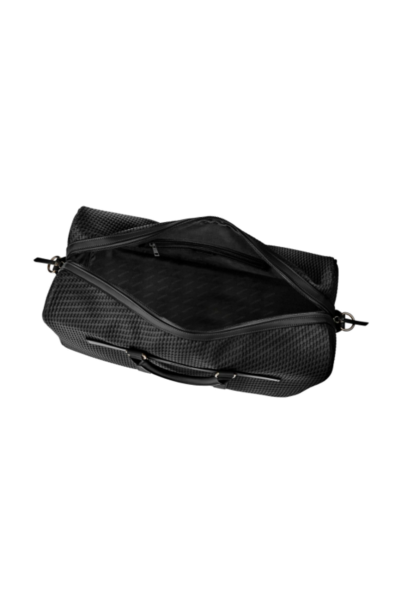 Defined by its woven-inspired texture, the Interlace weekend bag in black is crafted to resemble meticulous braiding and finished in a smooth matte that reinforces its luxurious, contemporary feel. This distinctive surface shapes its visual identity with depth and sophistication, elevated by signed details including blazon-engraved zipper pullers. Roamy and designed for effortless short escapes or work trips, the bag features a practical zipped pocket inside and a monogramed tone-on-tone lining that completes the design with refined precision. Paired with sleek gun accents, it stands as a resolutely chic expression of rich texture and modern elegance.