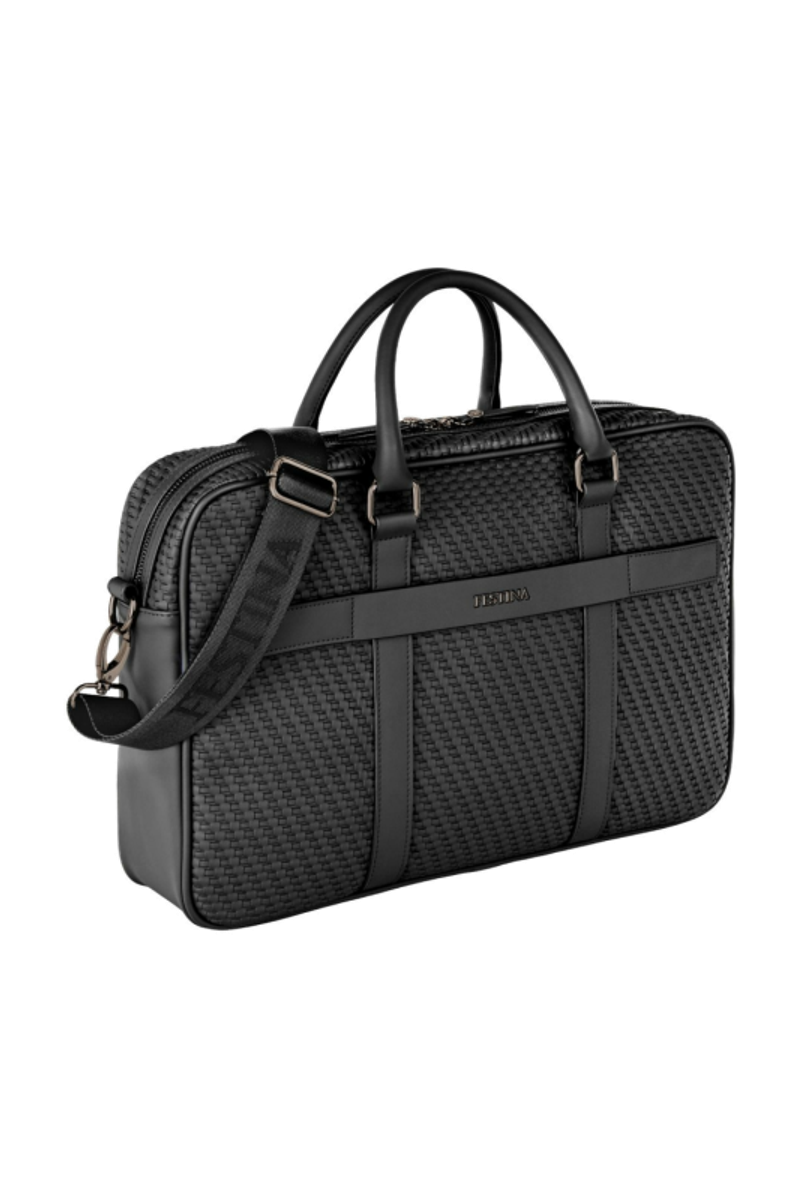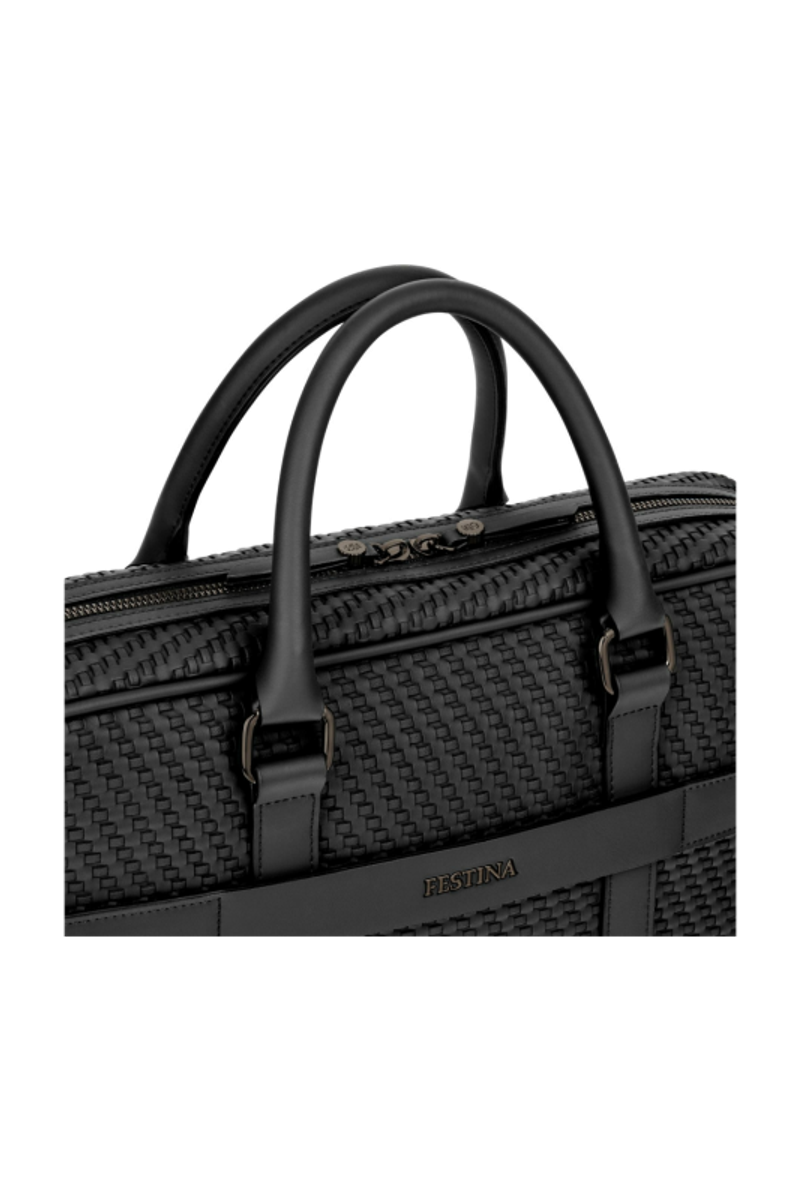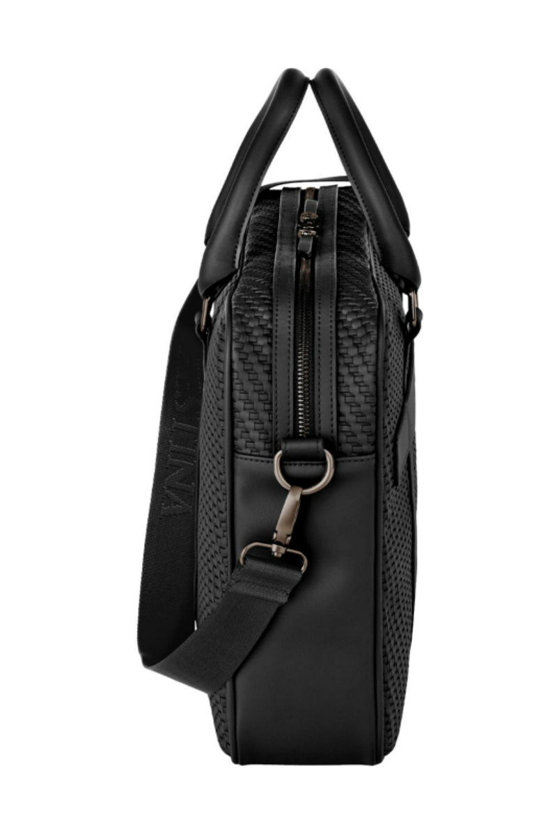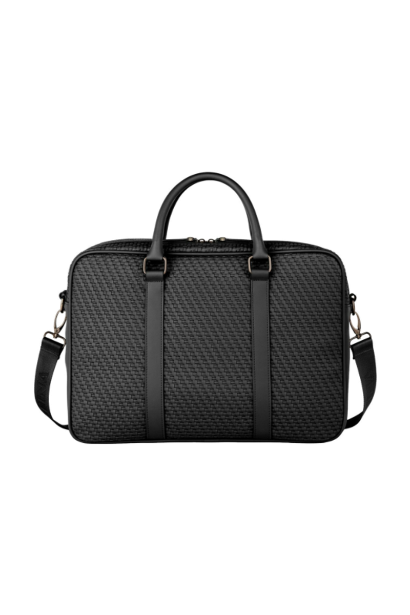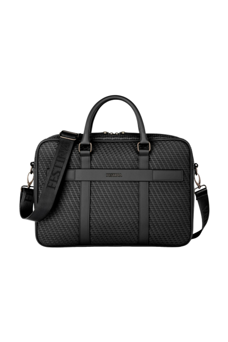 The Interlace document bag in black brings the line’s woven-inspired texture into a classical, timeless silhouette. Crafted to resemble meticulous braiding and finished in a smooth matte, it offers a luxurious, contemporary feel enriched by signed details, including blazon-engraved zipper pullers. Inside, the organisation is ideal, featuring a dedicated laptop compartment, an inside zipped pocket, and a monogramed lining that reinforces the refined finishing. A retractable, adjustable strap signed with the logo adds comfort and practicality for daily use. Completed with sleek gun accents, the design remains resolutely chic, centered on rich texture and modern elegance.