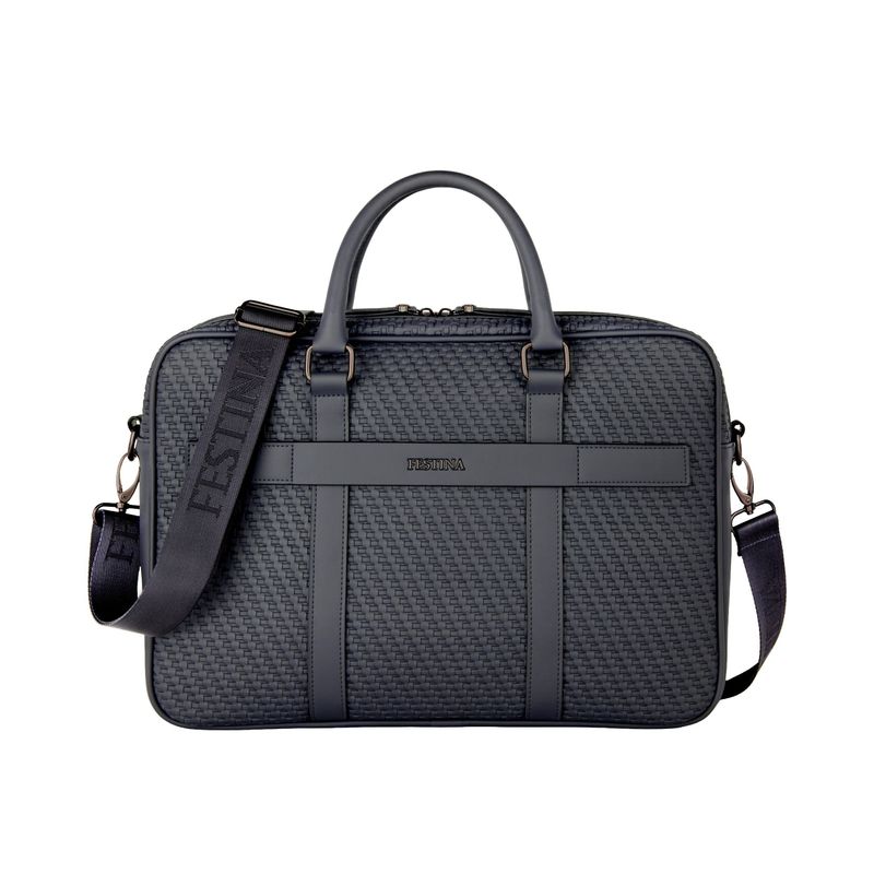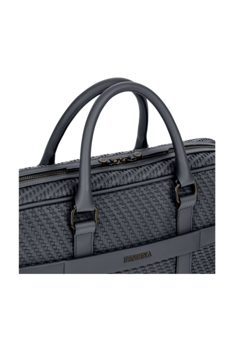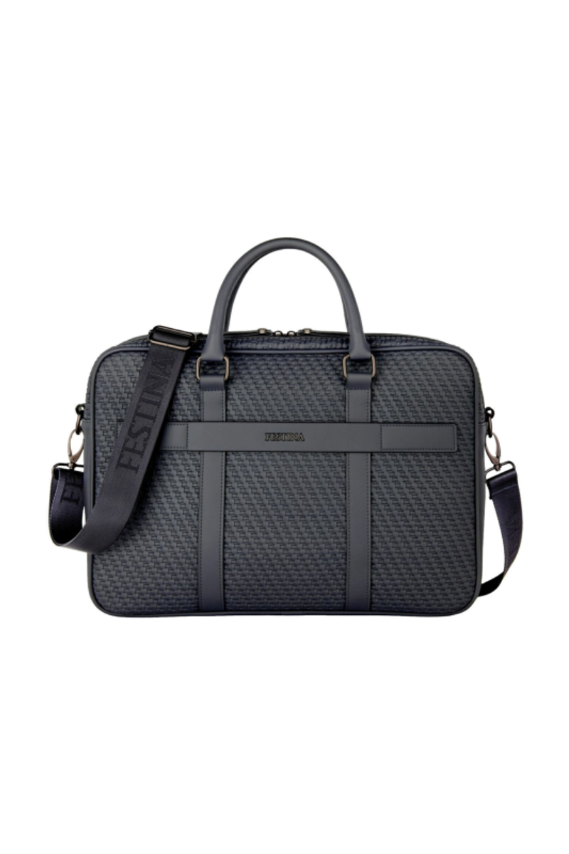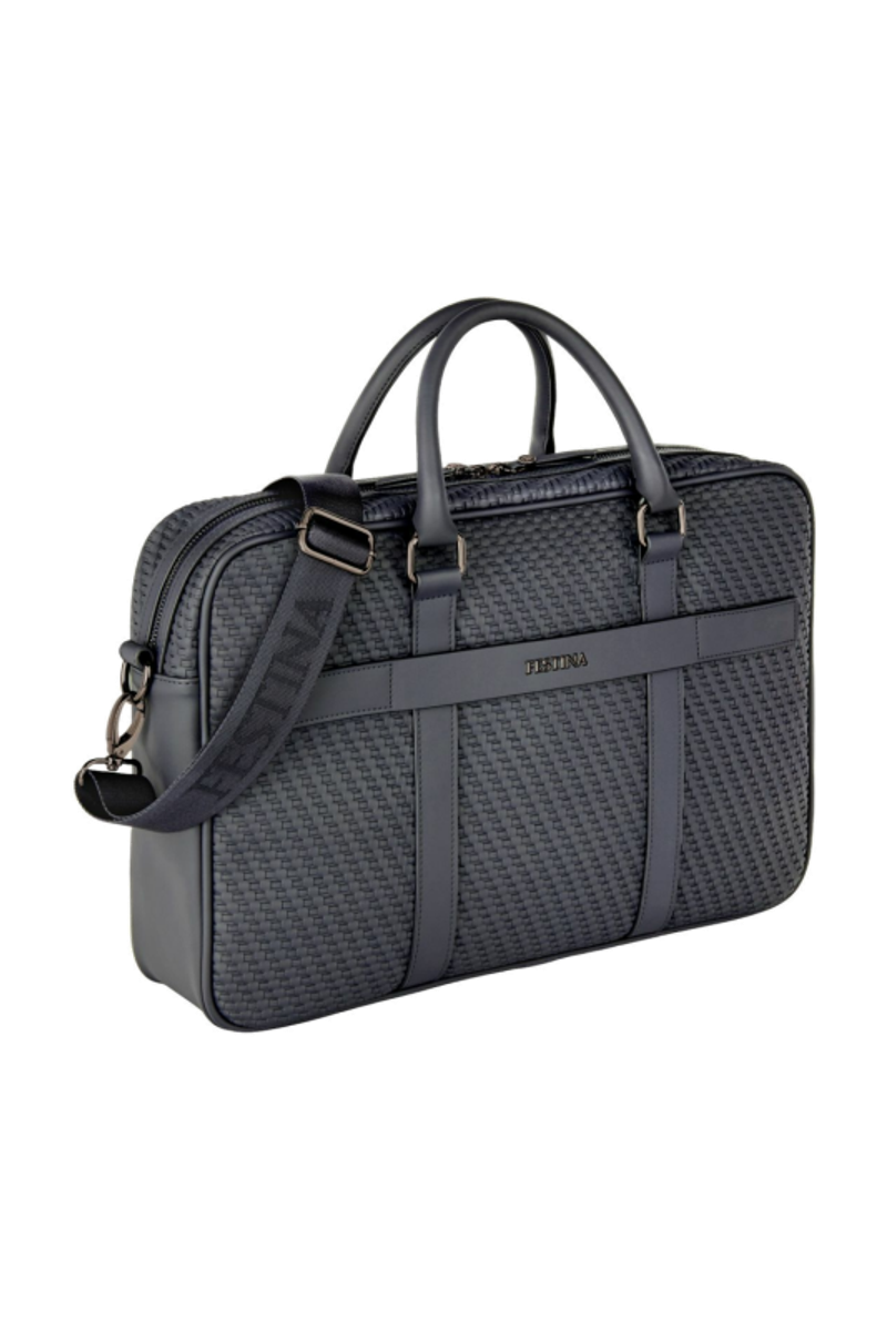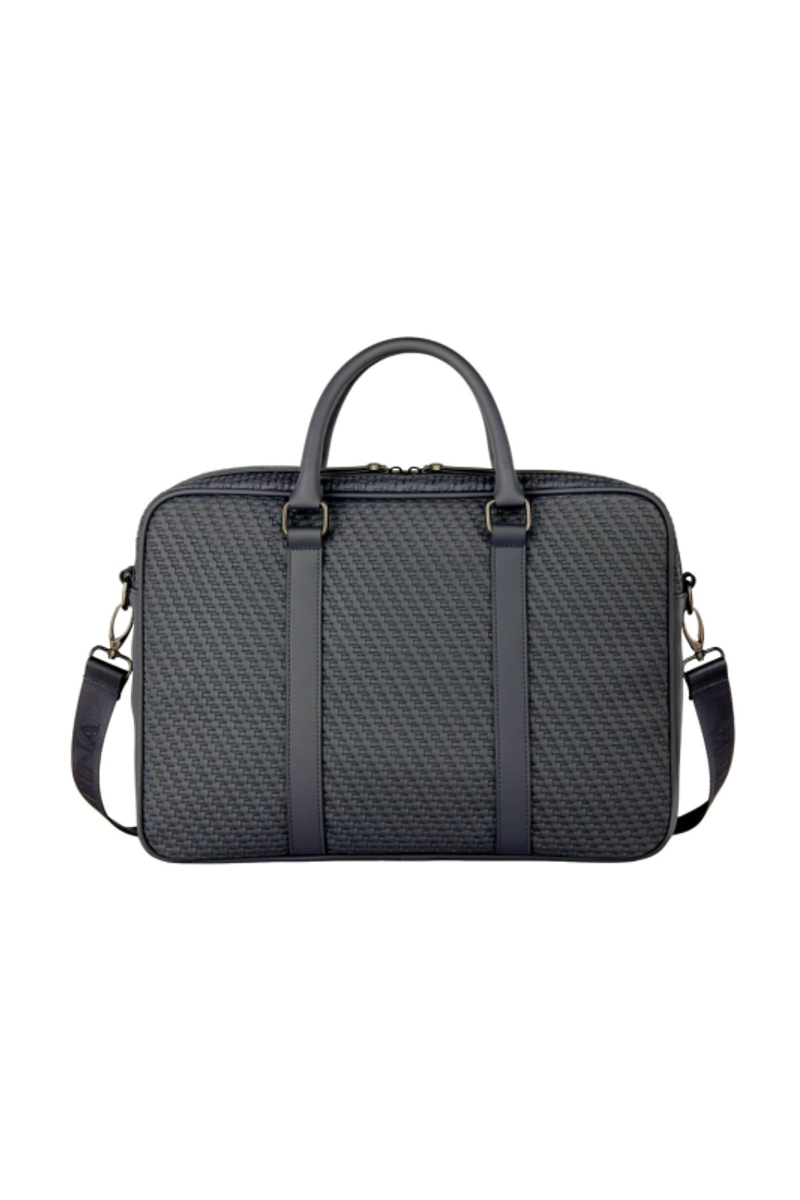 The Interlace document bag in navy brings the line’s woven-inspired texture into a classical, timeless silhouette. Crafted to resemble meticulous braiding and finished in a smooth matte, it offers a luxurious, contemporary feel enriched by signed details, including blazon-engraved zipper pullers. Inside, the organisation is ideal, featuring a dedicated laptop compartment, an inside zipped pocket, and a monogramed lining that reinforces the refined finishing. A retractable, adjustable strap signed with the logo adds comfort and practicality for daily use. Completed with sleek gun accents, the design remains resolutely chic, centered on rich texture and modern elegance.
