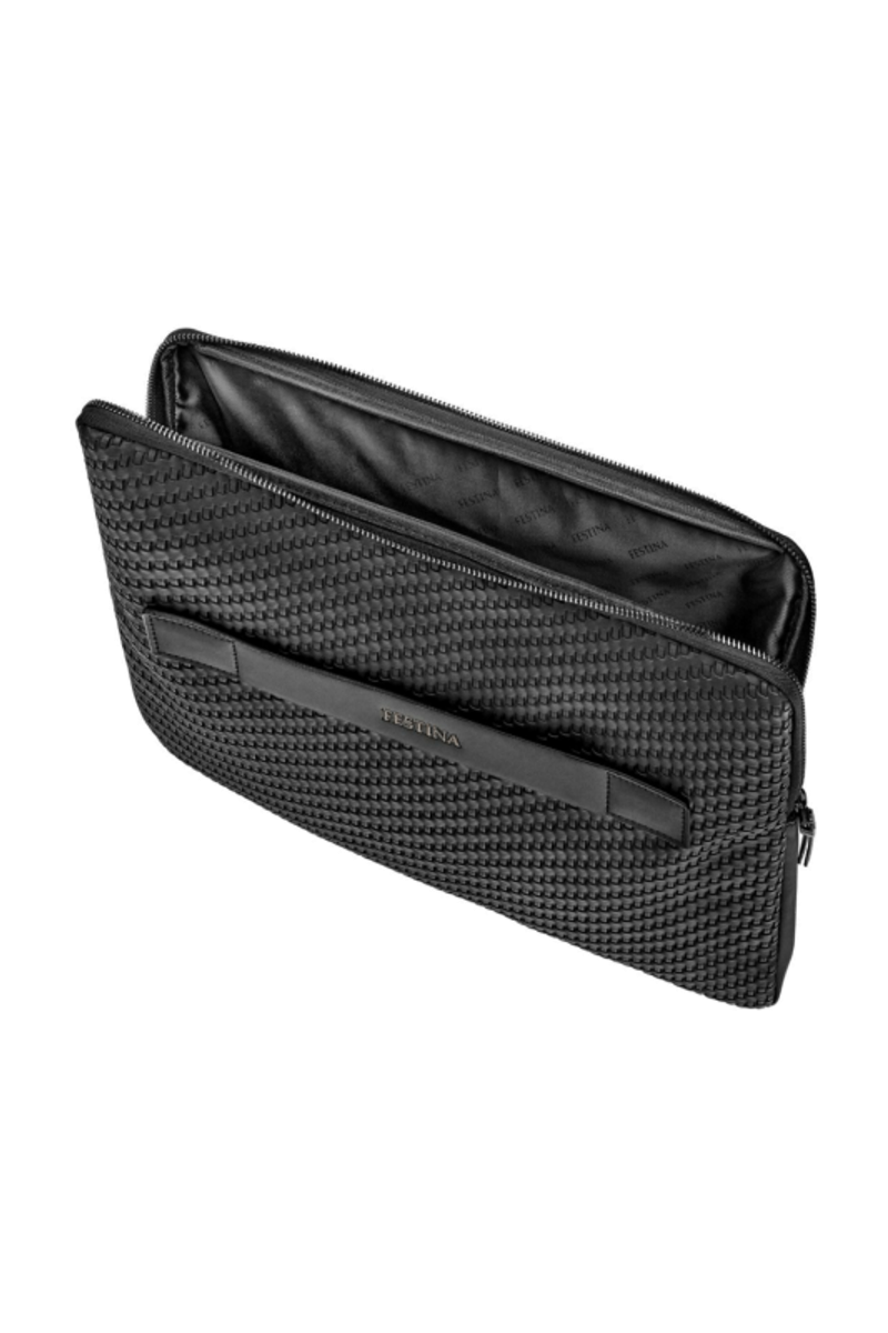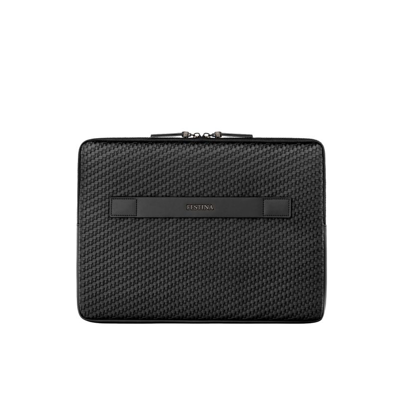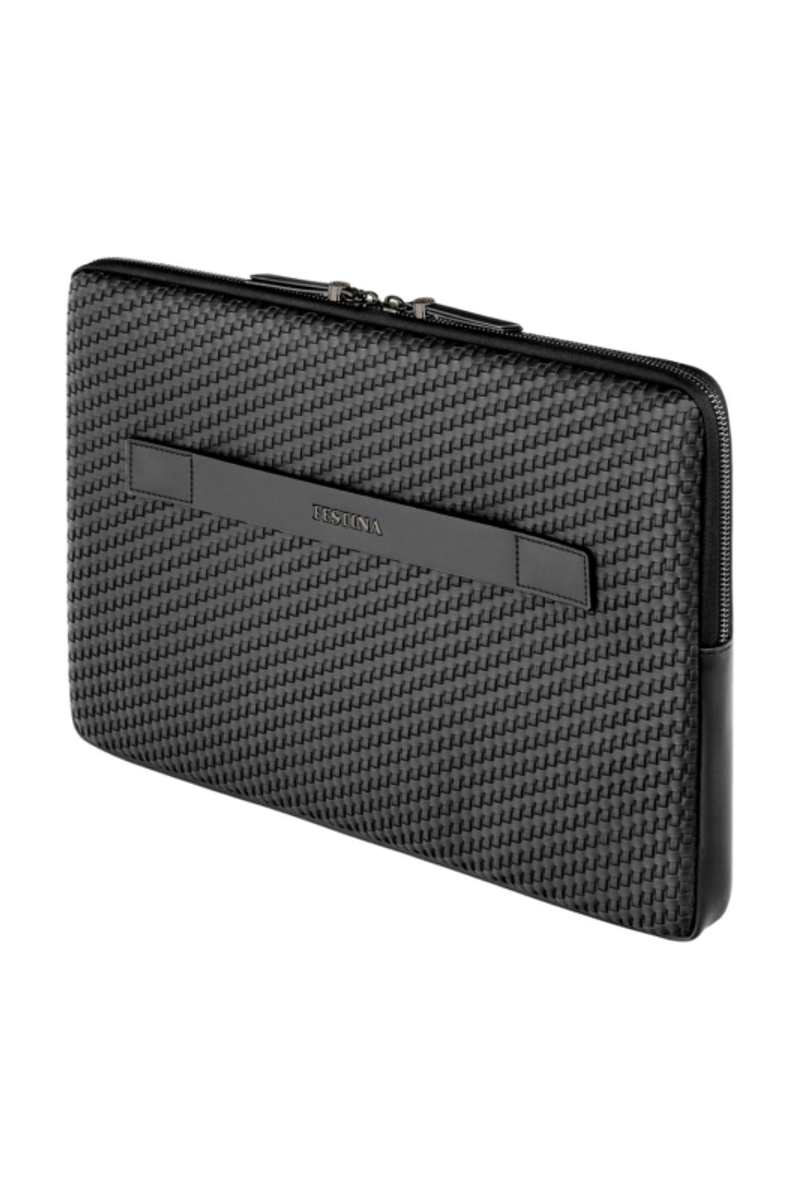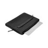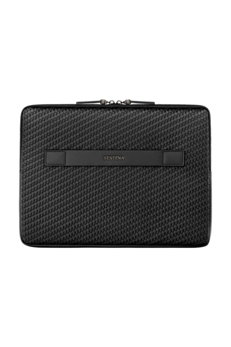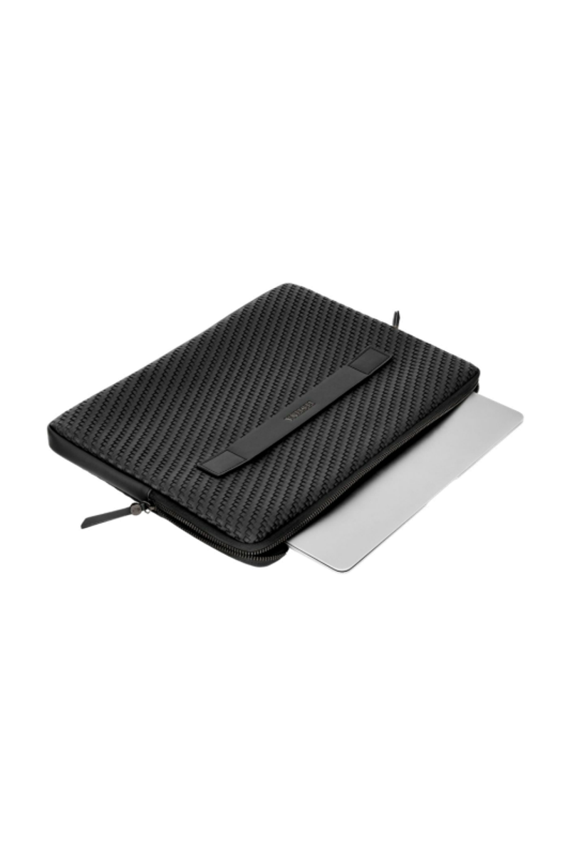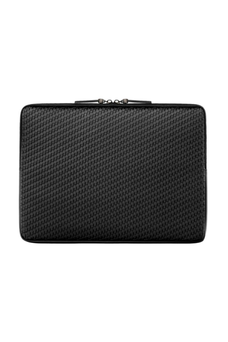 The Interlace laptop pouch in black distills the line’s woven-inspired texture into a minimal, luxurious statement. Crafted to resemble meticulous braiding and finished in a smooth matte, it carries the collection’s depth and sophistication in a sleek, streamlined silhouette. Signed details, including blazon-engraved zipper pullers, subtly elevate its refined character. Designed as the perfect protective companion, it features a slim, elegant construction enhanced by a monogramed lining that completes the piece with impeccable finishing. Accented with sleek gun touches, it embodies rich texture and modern elegance in its purest form.