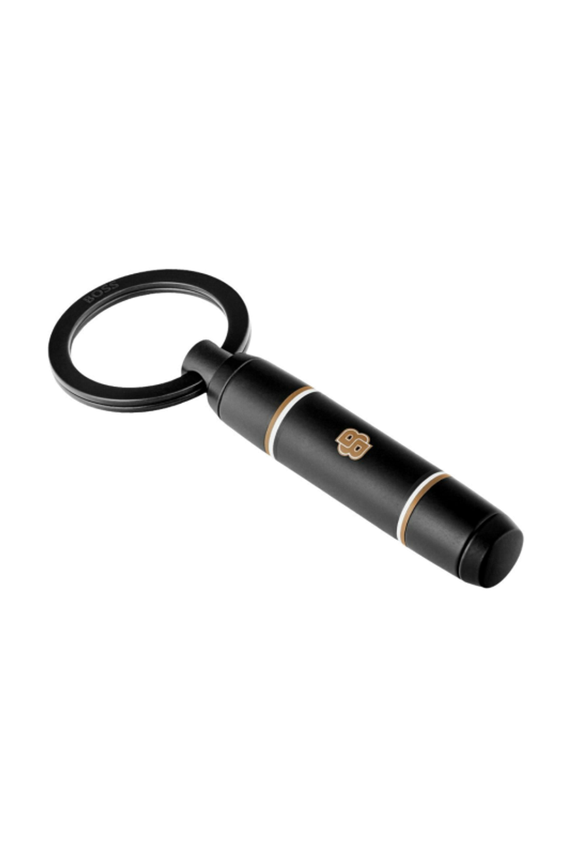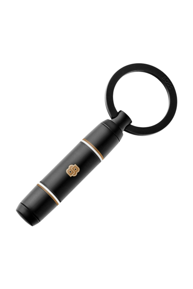 This keyring features a strong, graphical design inspired by a varsity style, delivering a clear and contemporary expression. Crafted exclusively in black, it is defined by a bold Double B logo with a crisp white outline, framed by ultra-slim iconic stripes that create sharp visual contrast. Matte black trims reinforce the modern look, while an engraved HUGO BOSS signature adds a refined detail. The tubular shape ensures a clean, functional profile suited for everyday use.