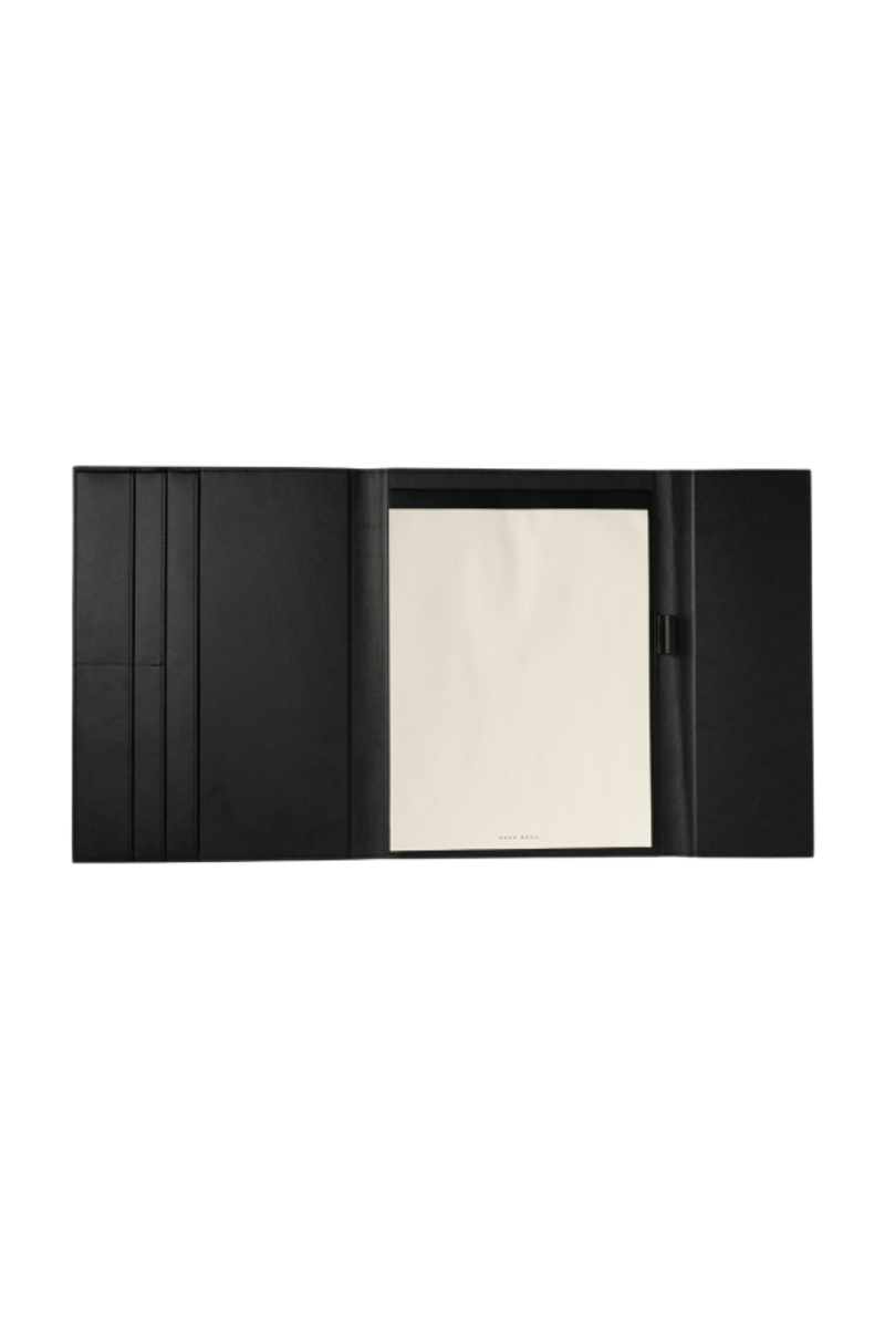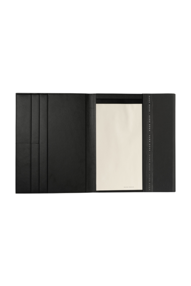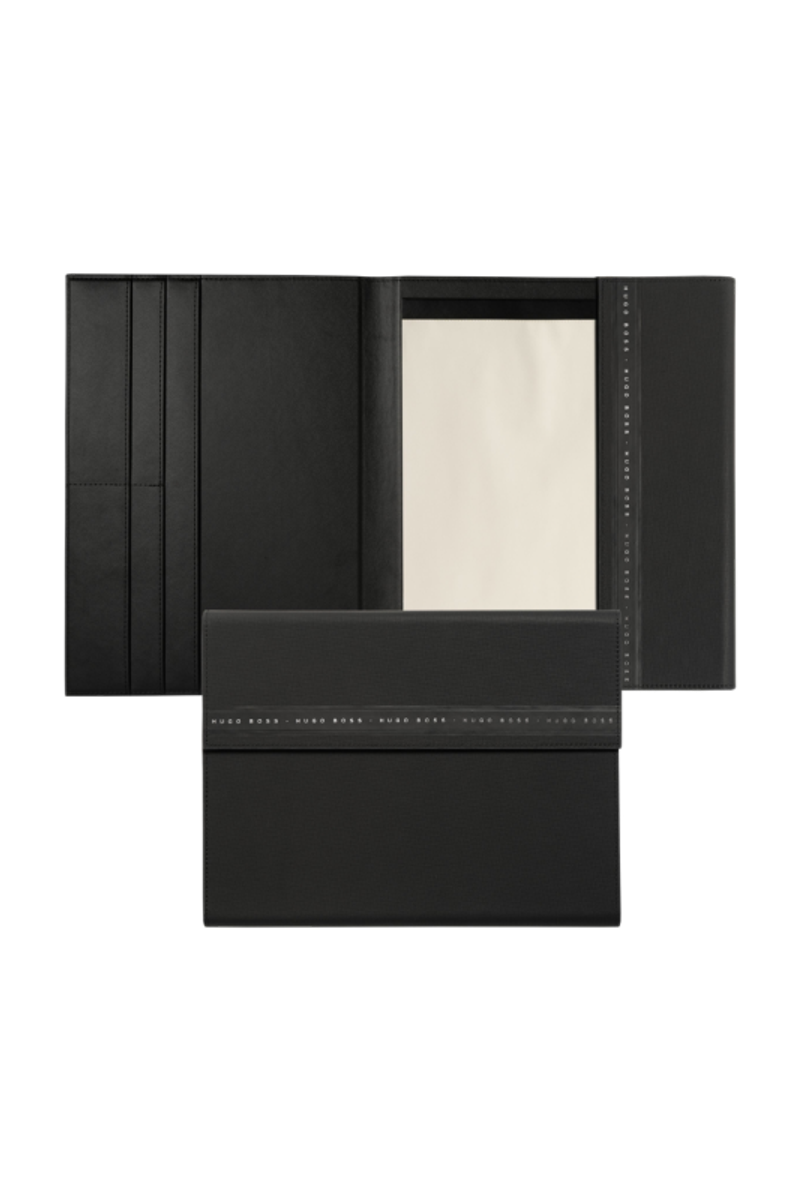 Créée dans une surface texturée rappelant les gravures des stylos assortis, la pochette de conférence Ribbon A4 présente un ruban caoutchouté orné d'une série de logos HUGO BOSS lui donnant un aspect morderne avec une touche de décontraction.