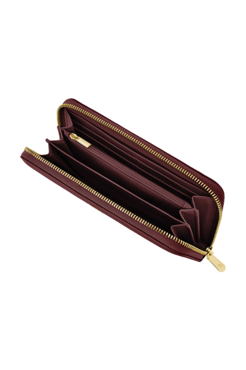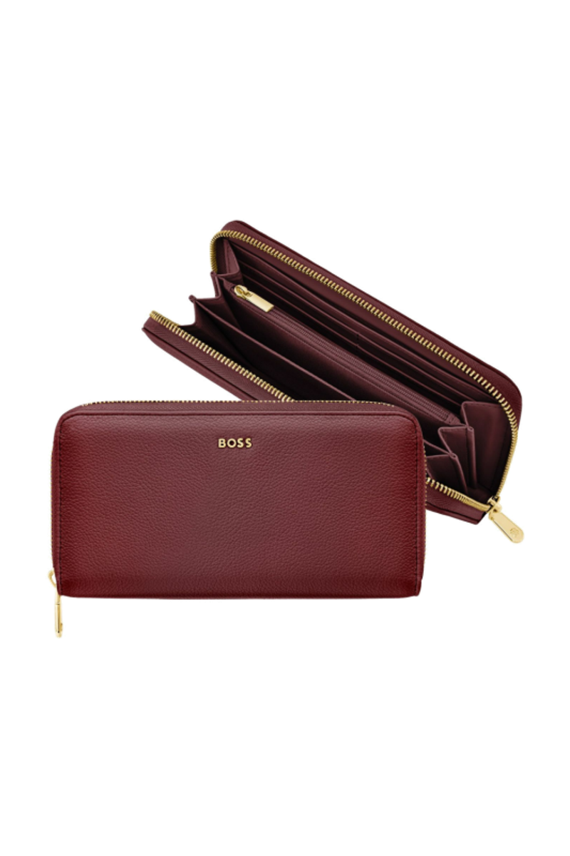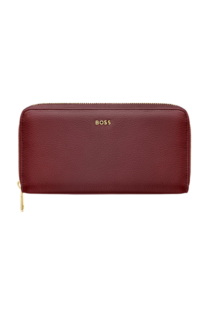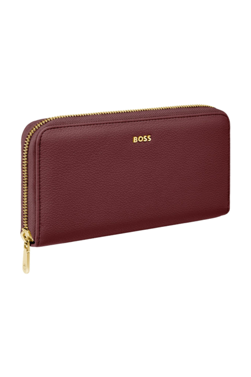 This classic zipped wallet is crafted from carefully selected grained matte PU with a soft, refined hand feel. The design is highlighted by a BOSS logo signature plate on the front and complemented by newly developed light gold–plated zippers featuring a Double B detail. Designed for everyday organization, it offers twelve card slots with six on each side, two note compartments positioned on either side, and a central zipped compartment for secure storage. Finished entirely with light gold trims for an elevated and luxurious touch, the wallet is available in a soft color palette including black, burgundy, taupe, nude, and lilac.