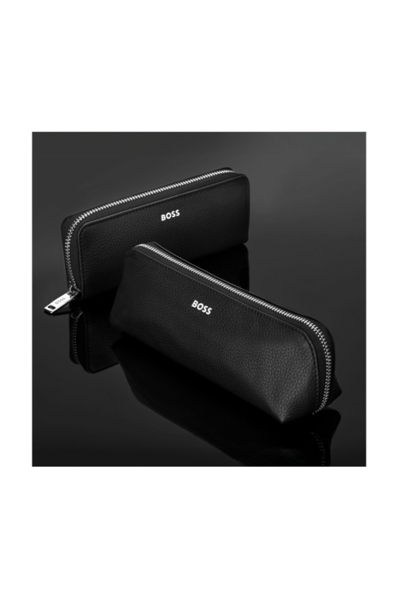 Hugo Boss large zipped pen pouch—a perfect fusion of elegance and functionality for the modern professional. Crafted from genuine leather, this exquisite pen case embodies the sophistication and quality synonymous with the Hugo Boss brand. It is signed with our crisp BOSS metal plate in chrome finish. It features a tone on tone monogrammed lining, the zipper is embossed with the BOSS logo. A perfecrt companion to any of our writing piece.
