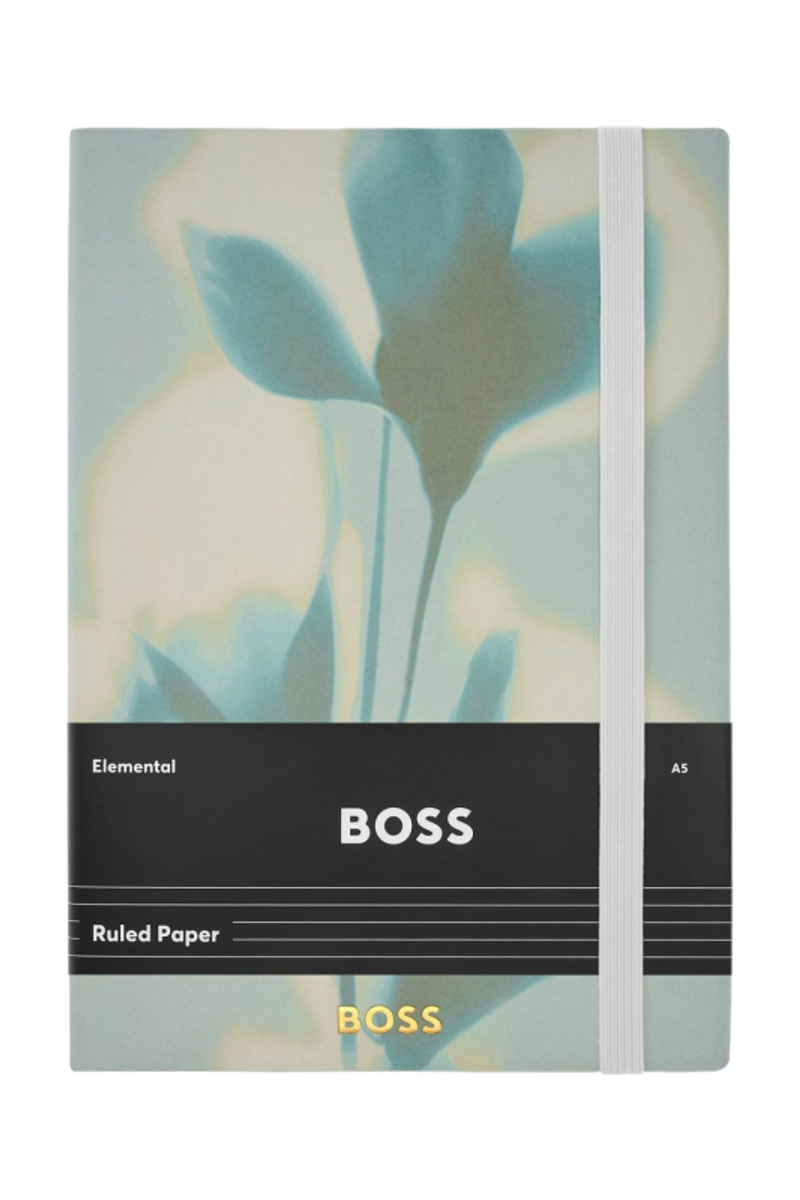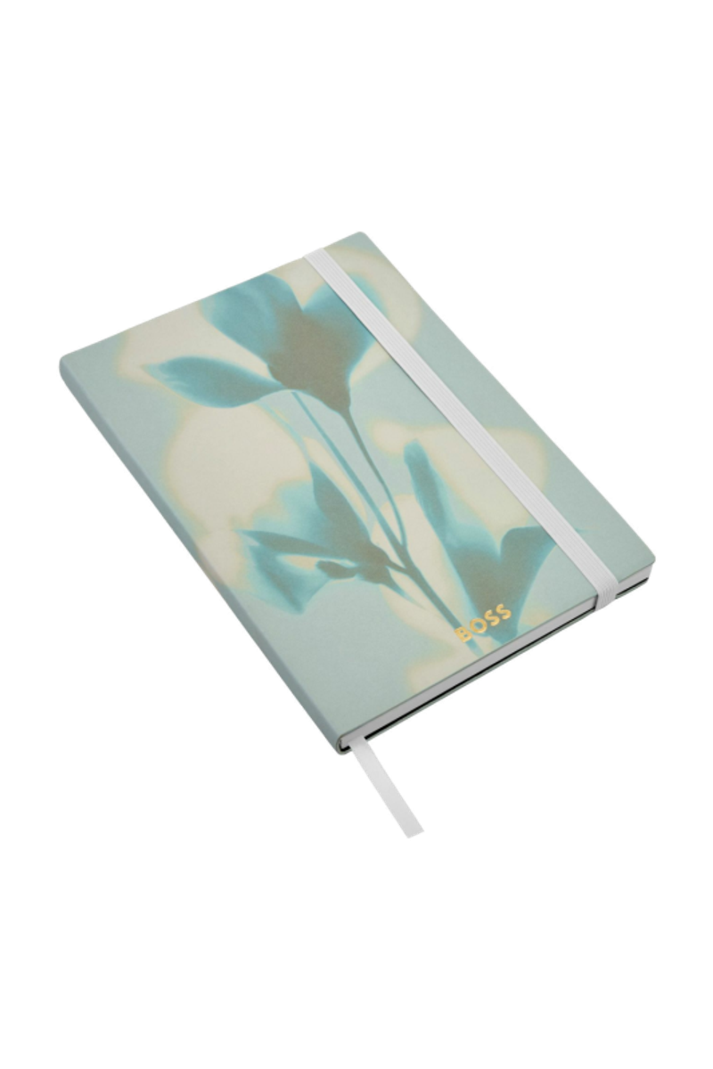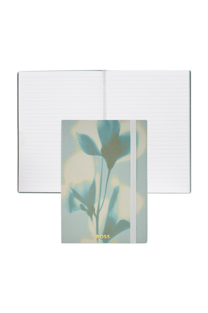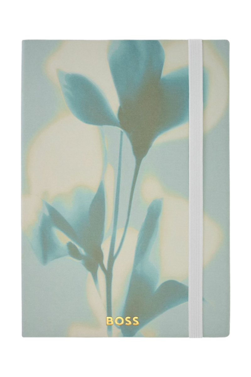 The Holographic notebook features a soft, blurred floral print inspired by the BOSS Lady ready-to-wear line, giving the design a light and airy visual character. Offered in a soothing palette of navy, light blue, nude, and pastel green, each version brings a sense of subtle delicacy and modern elegance. The cover is finished with a BOSS logo embossed and highlighted with gold foil, while a vertical elastic closure and matching page marker echo the tones of the print for a cohesive finish. Each notebook is presented in an A5 format with lined paper and contains 192 pages, combining visual softness with everyday functionality.